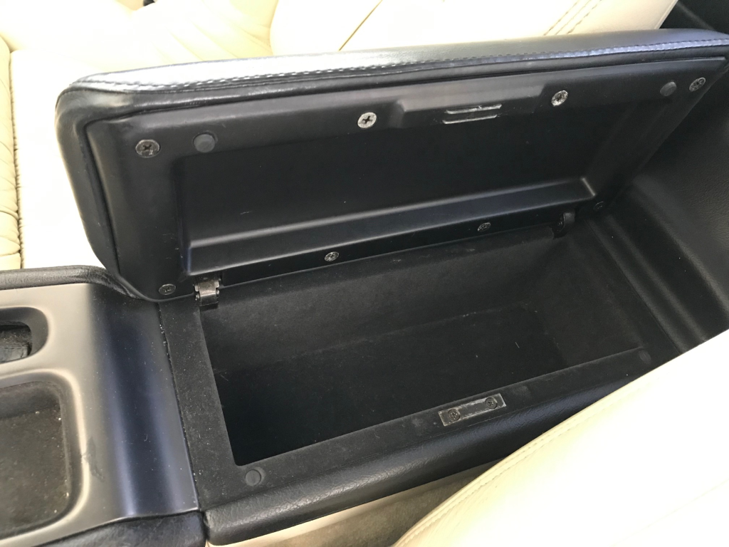 Ivory leather upholstery covering the four-way power seats is contrasted by black leather trim on the dash, steering wheel, shifter, handbrake lever, and door panels. Factory equipment includes power-adjustable sideview mirrors, automatic climate control, and a Bose sound system.