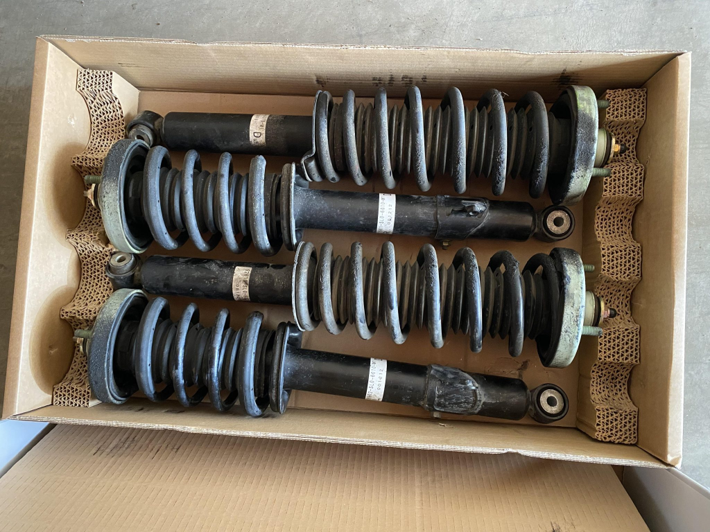 Factory 16″ and 17″ wheels were mounted with 205/45 and 245/40 Yokohama Advan Fleva tires in May 2020. KW Variant 3 adjustable coilovers have been fitted that have lowered the ride height by approximately ½”, and an alignment was also performed at the time of the installation. The stock suspension components are included in the sale.