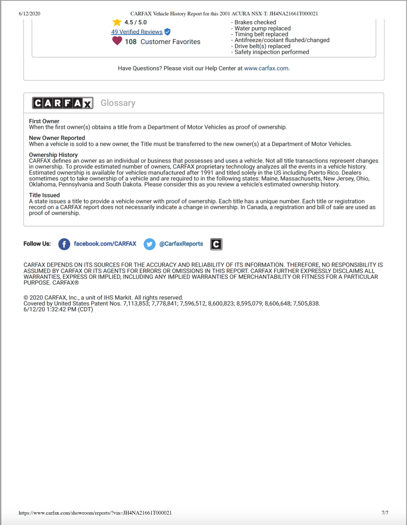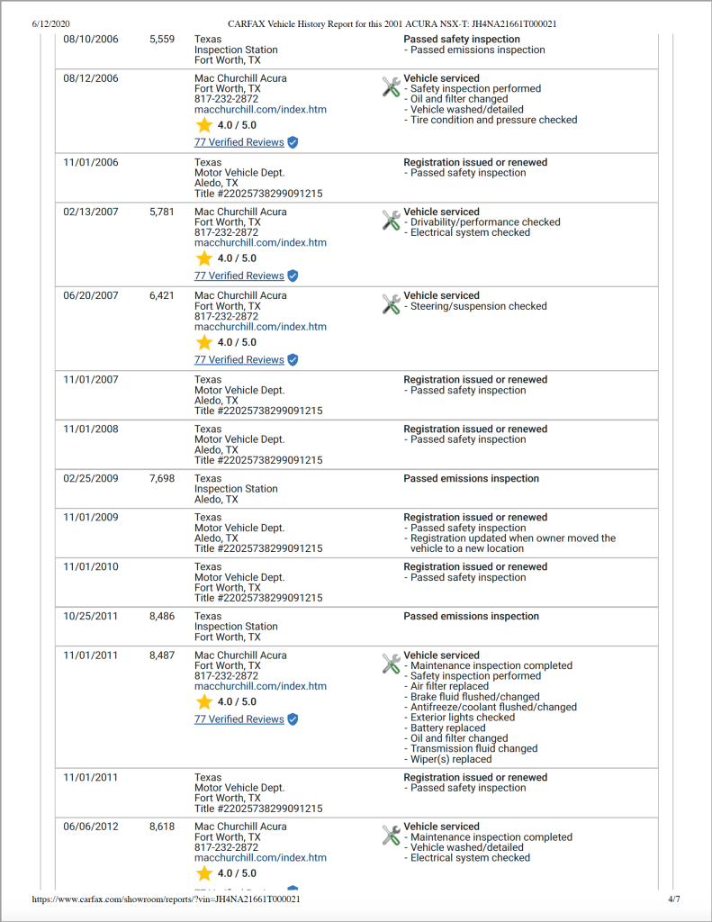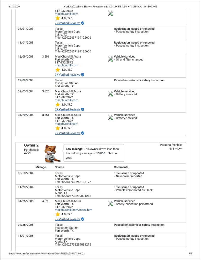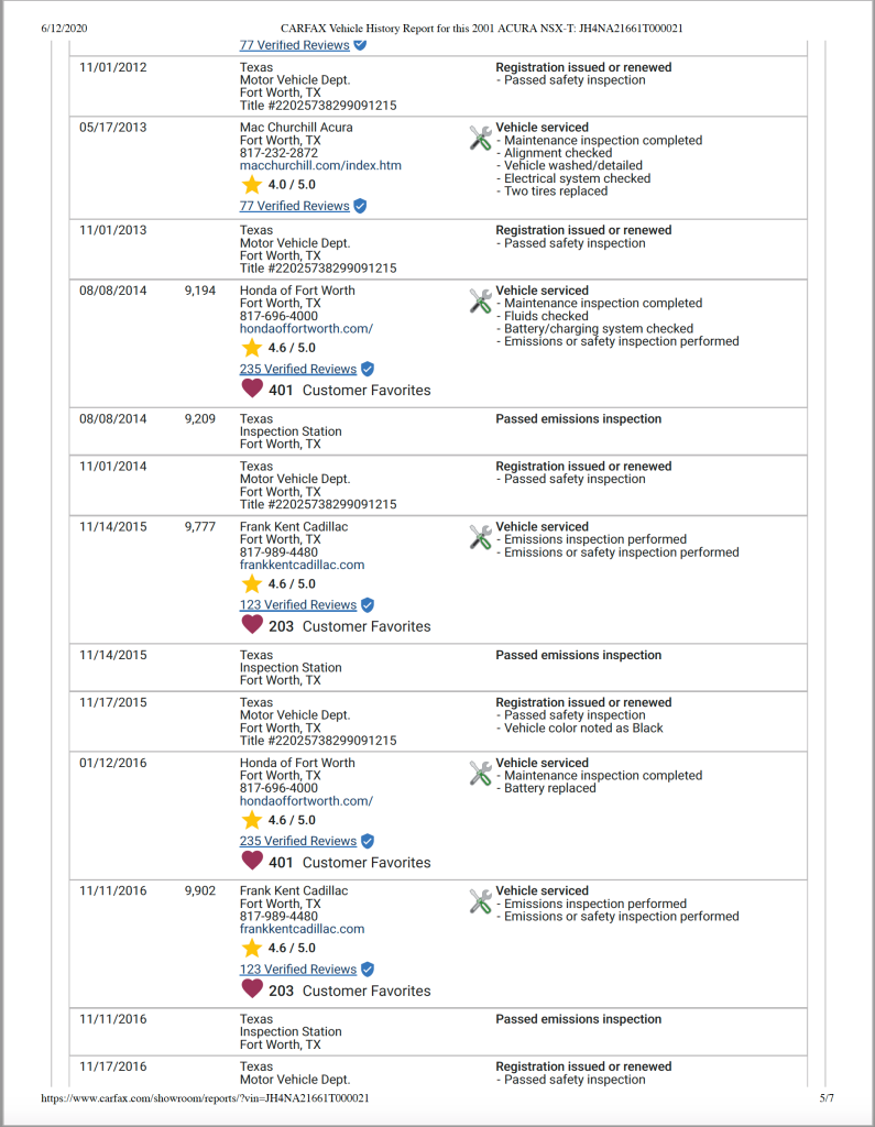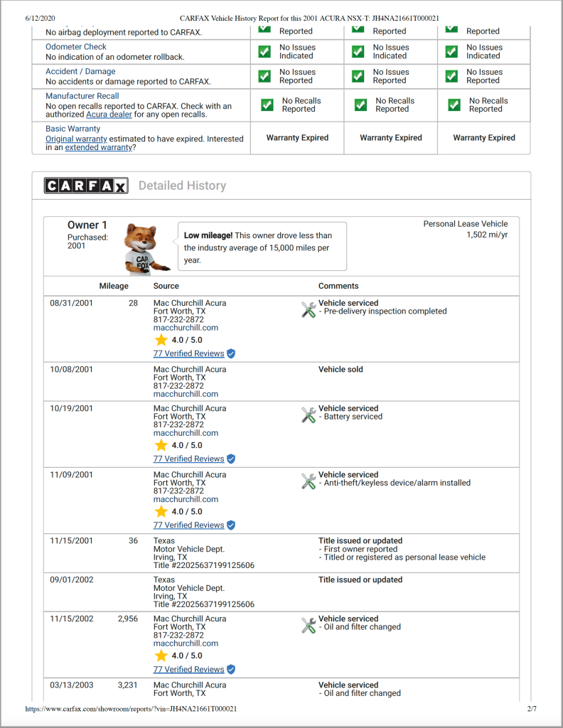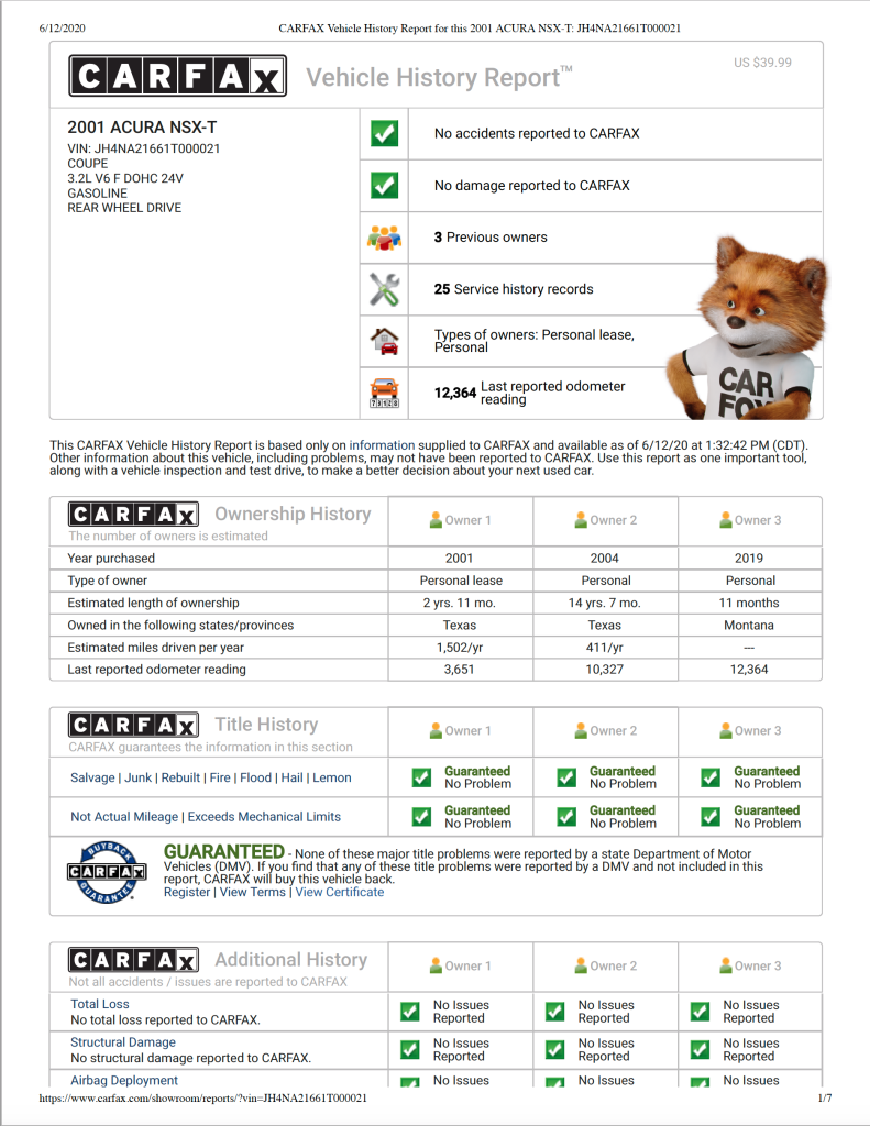 The June 2020 Carfax report shows no accidents or other damage and lists emissions testing, registration, and service history in Texas, Montana, and California.