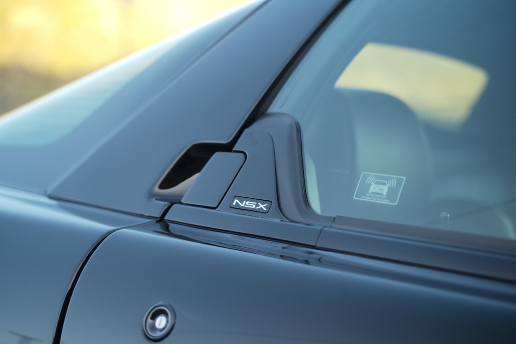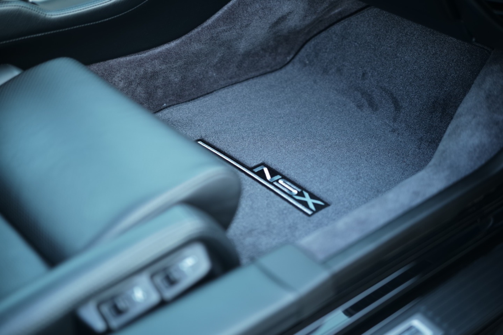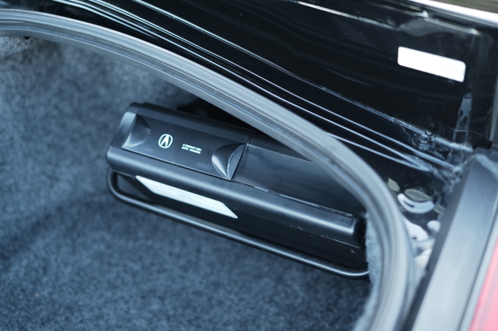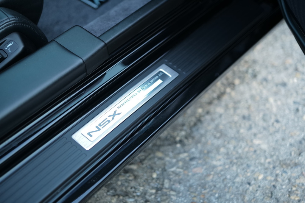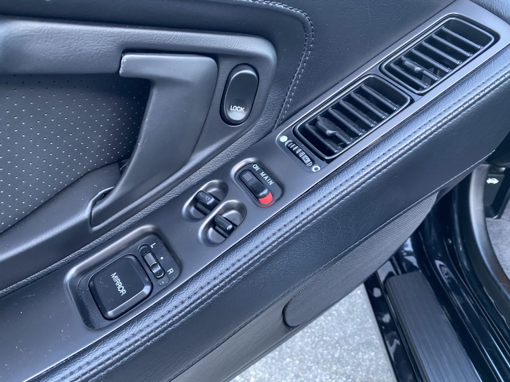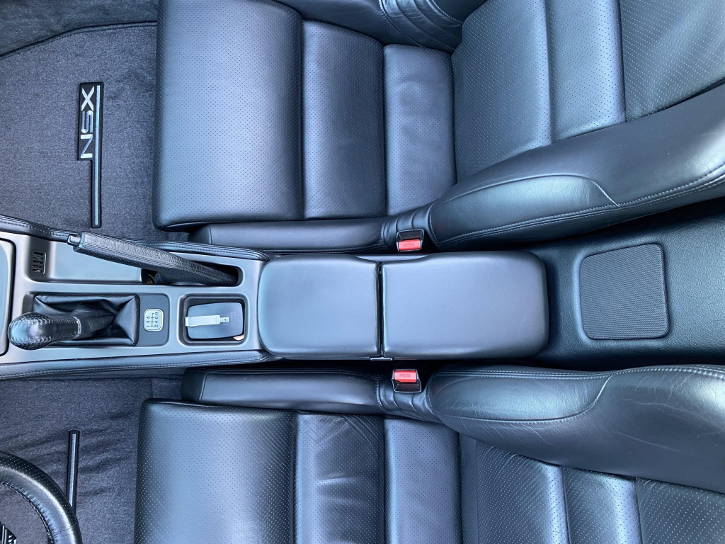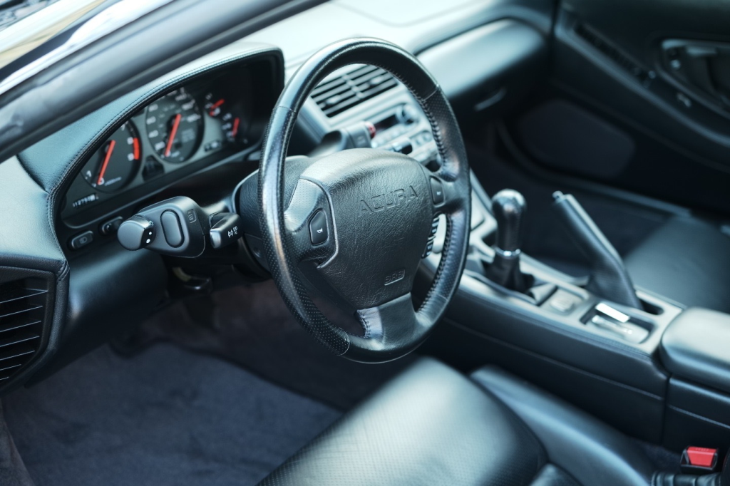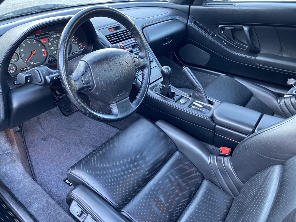 The cockpit is upholstered in onyx leather with a matching dash, door panels, and carpets, the latter of which are protected by NSX-branded floor mats. Amenities include cruise control, automatic climate control, and a factory Bose sound system with a cassette player and a CD changer.