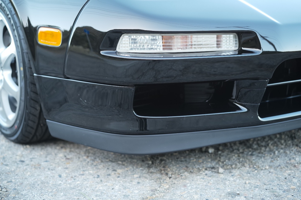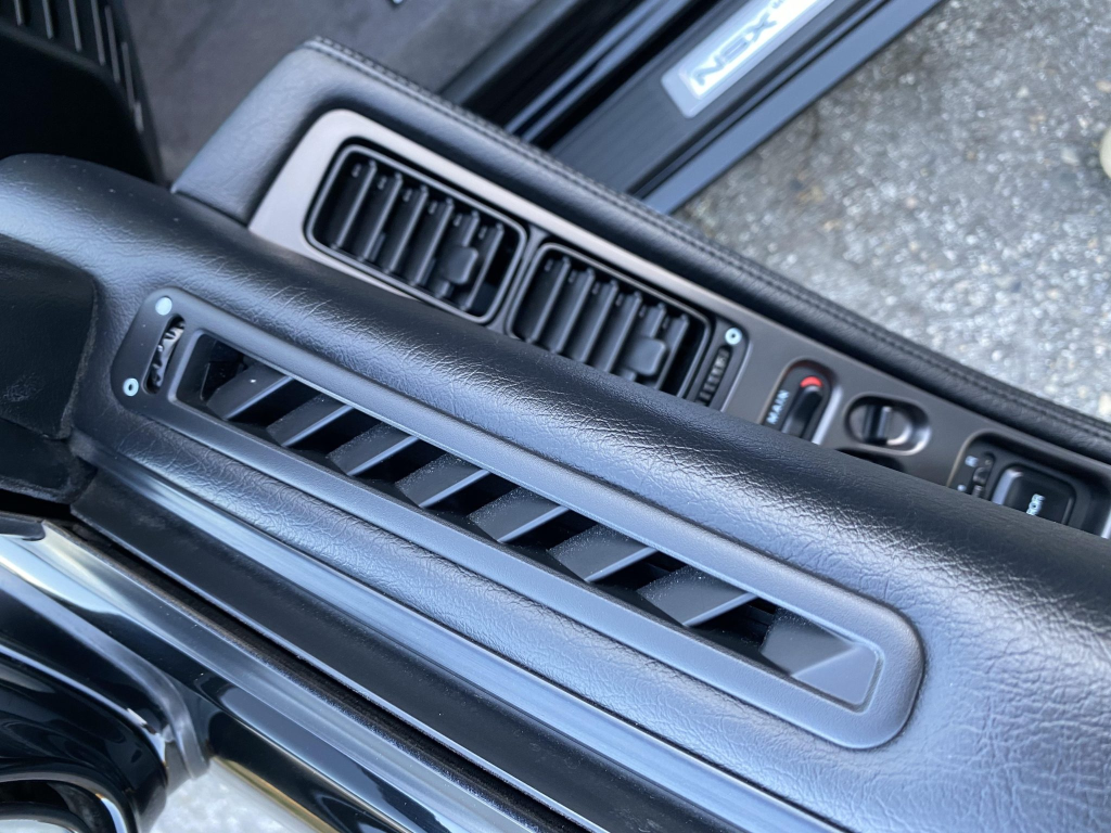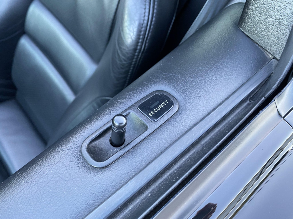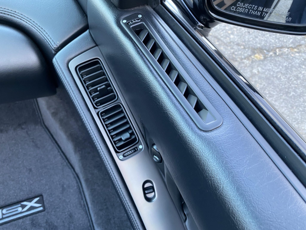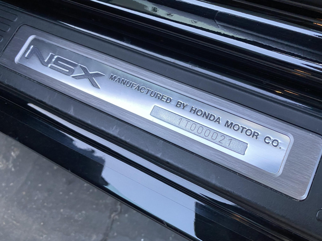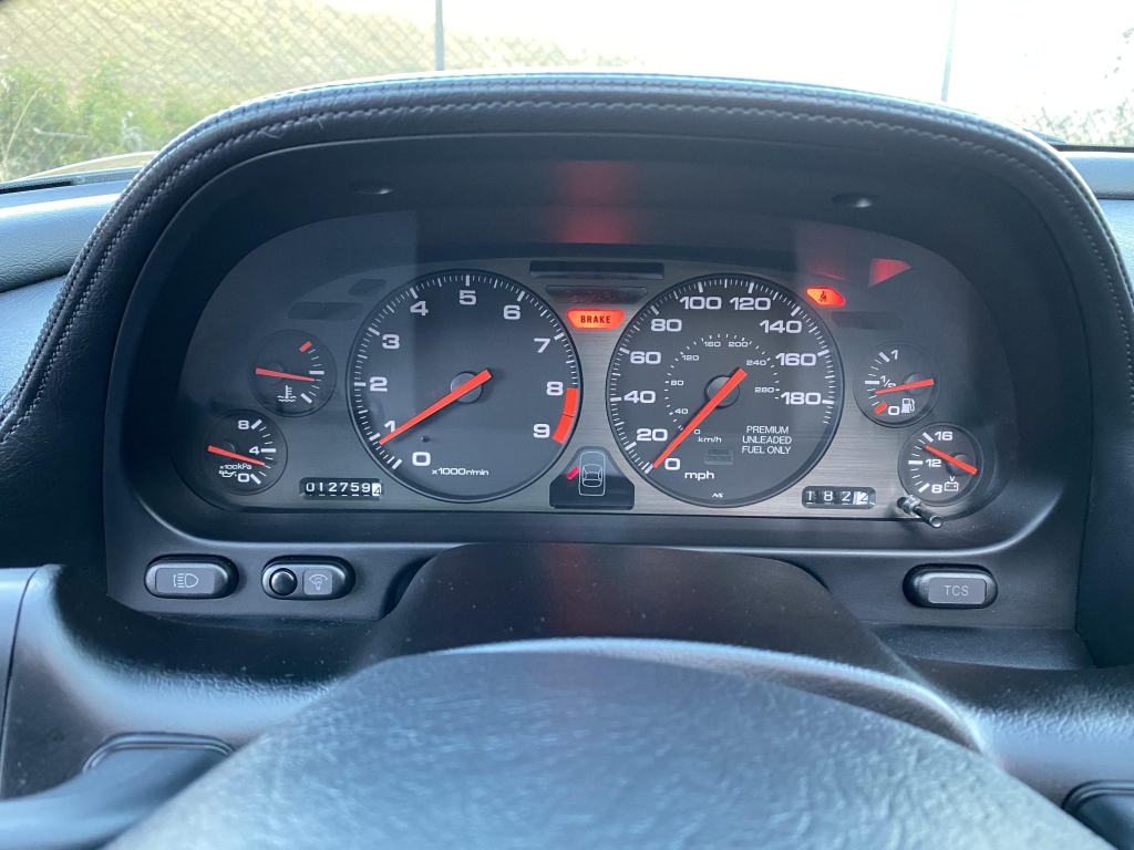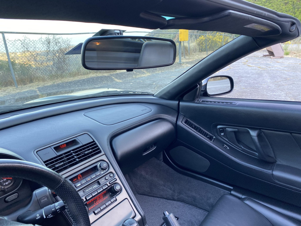 The cockpit is upholstered in onyx leather with a matching dash, door panels, and carpets, the latter of which are protected by NSX-branded floor mats. Amenities include cruise control, automatic climate control, and a factory Bose sound system with a cassette player and a CD changer.