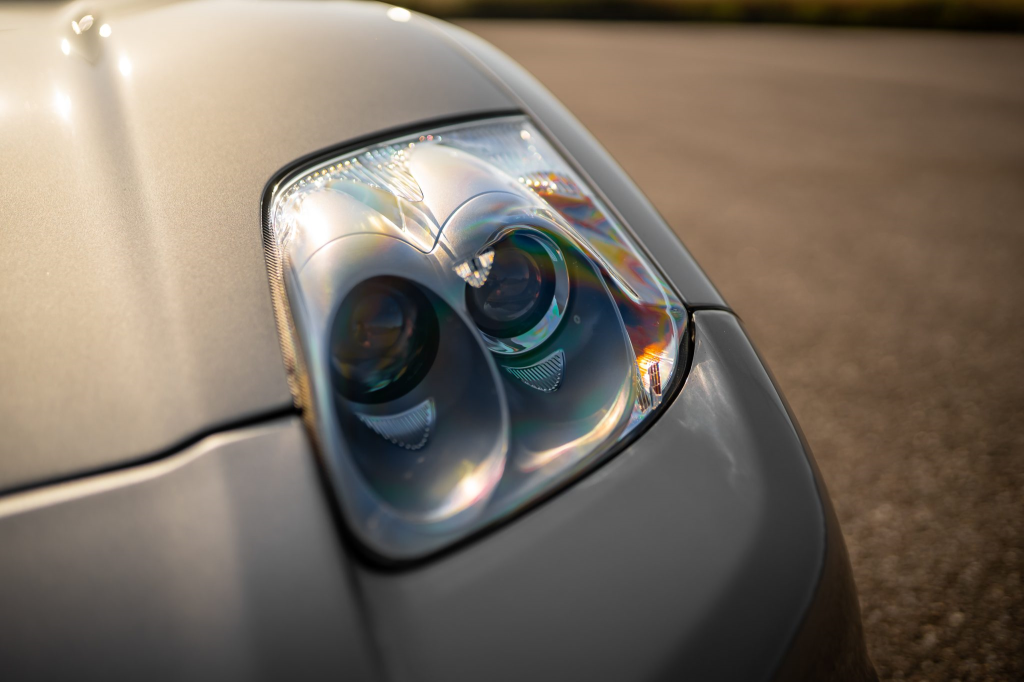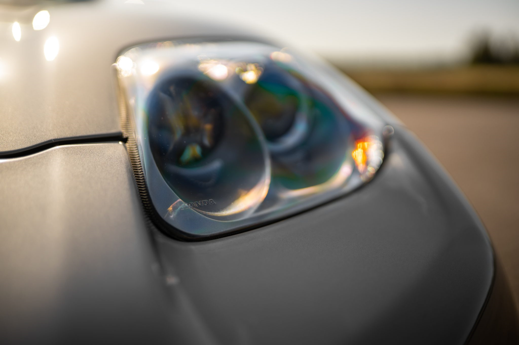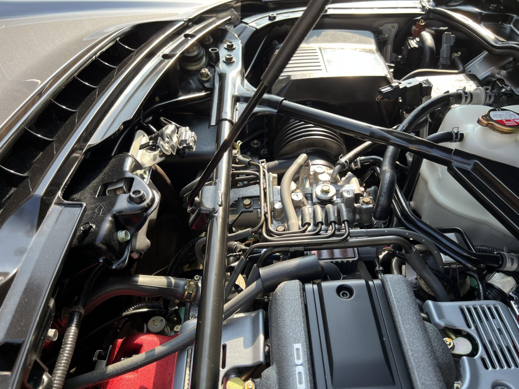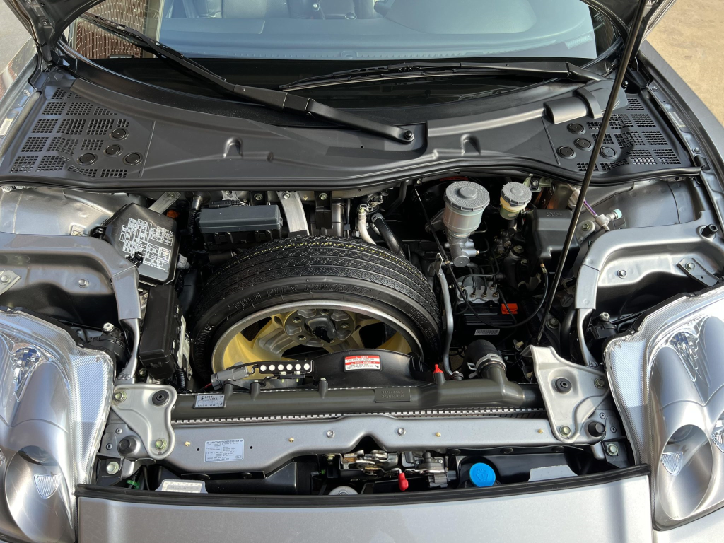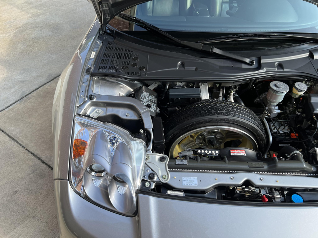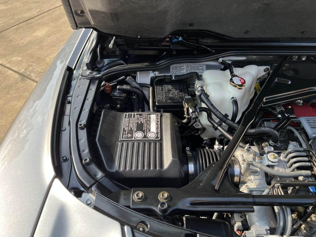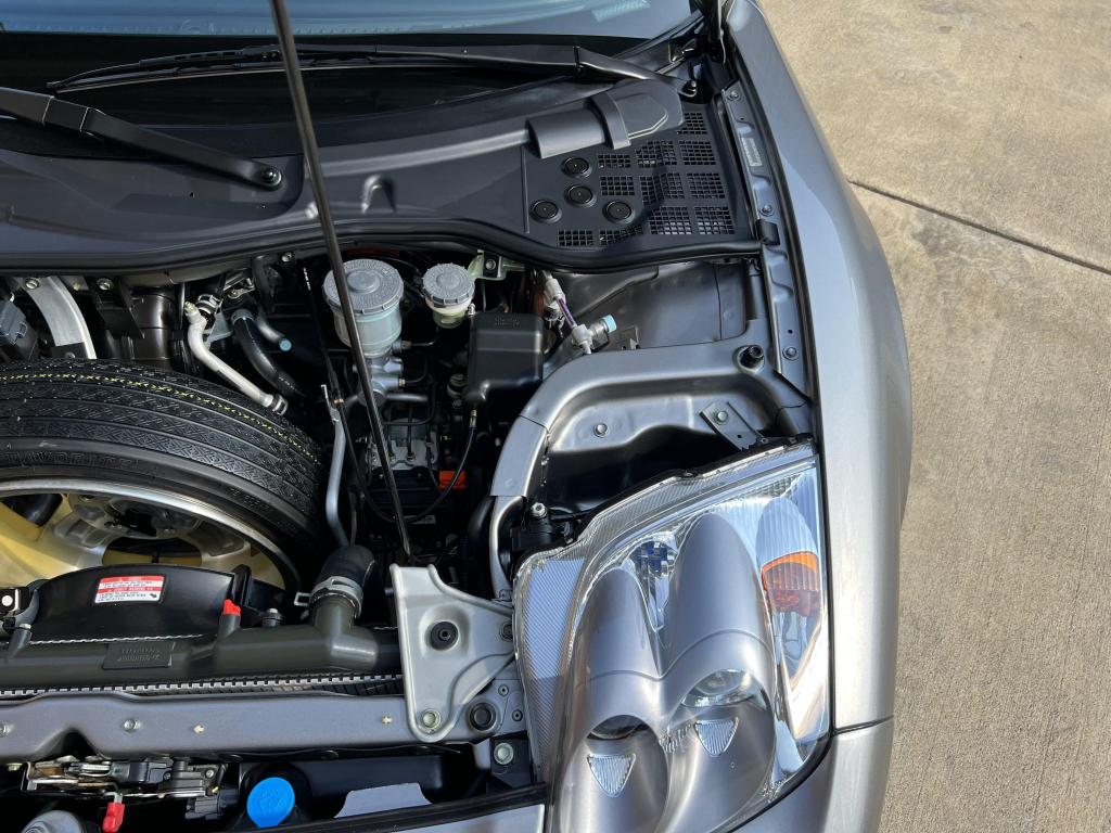The aluminum bodywork is finished in Silverstone Metallic (NH-630M) and features a body-color removable roof panel, xenon headlights, power-adjustable side mirrors, side air intakes, and an integrated rear wing with an LED brake light. The rear bumper cover was refinished in April 2022.