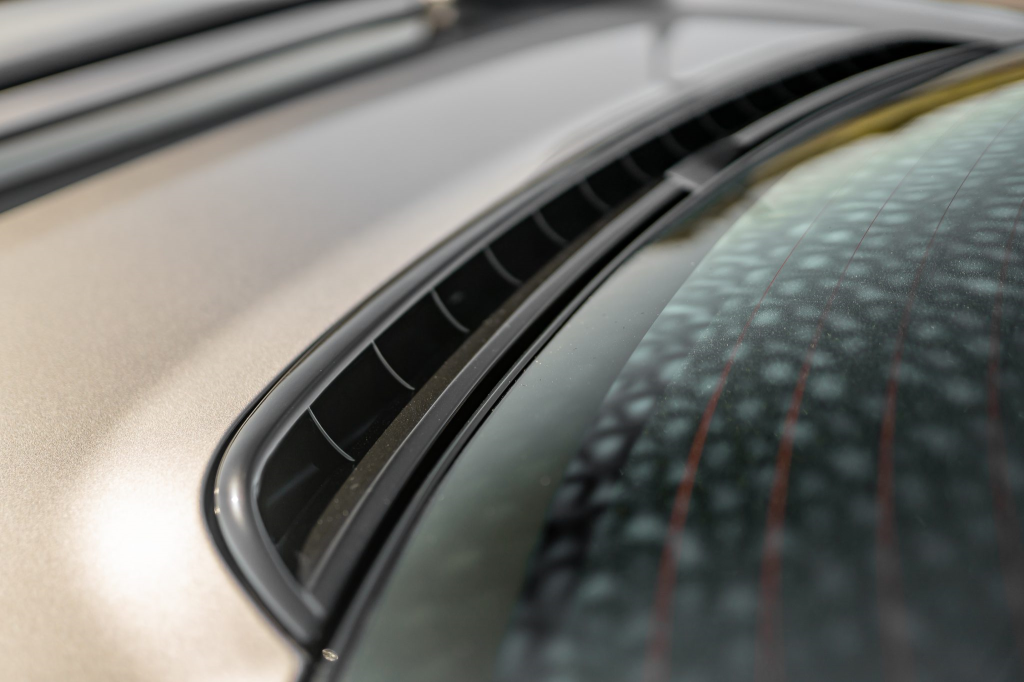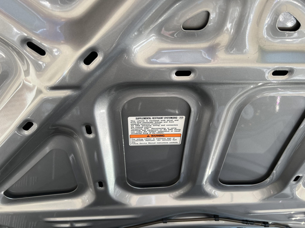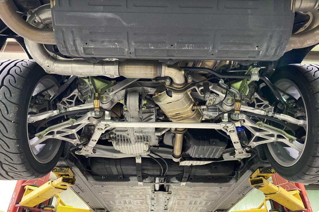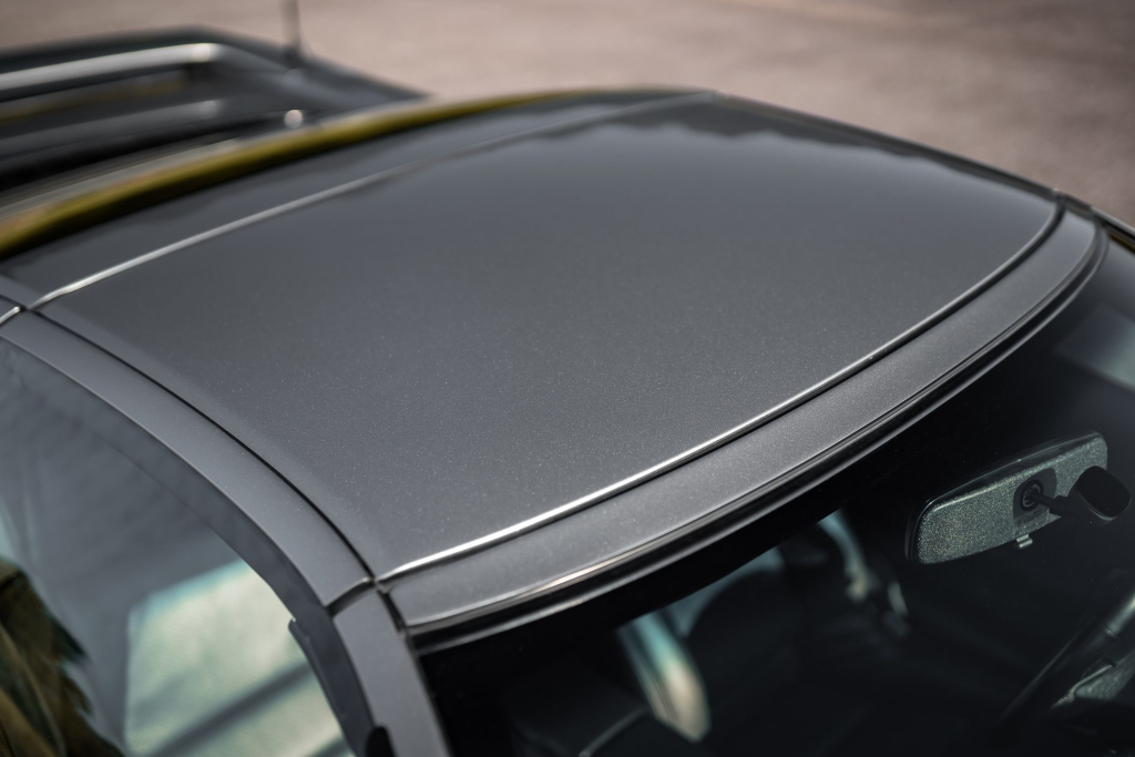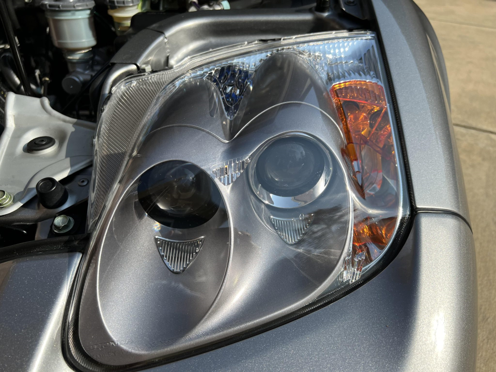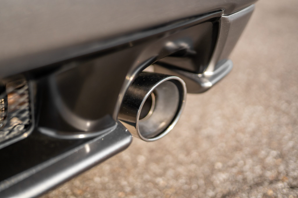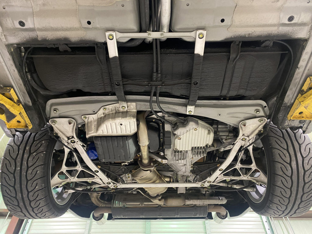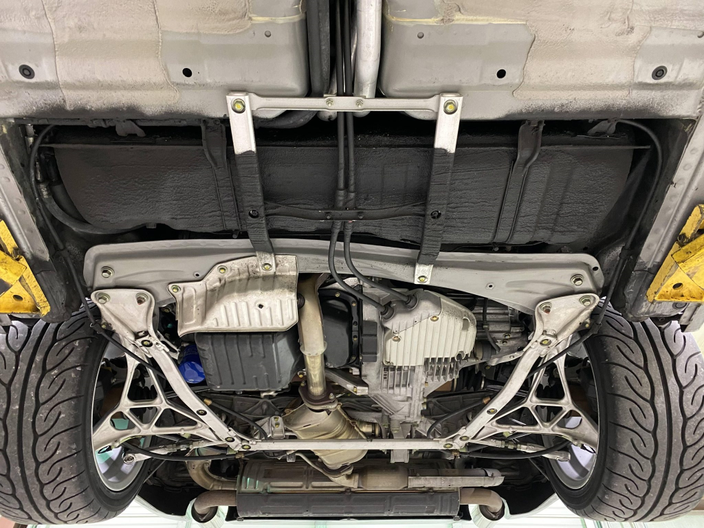 The aluminum bodywork is finished in Silverstone Metallic (NH-630M) and features a body-color removable roof panel, xenon headlights, power-adjustable side mirrors, side air intakes, and an integrated rear wing with an LED brake light. The rear bumper cover was refinished in April 2022.