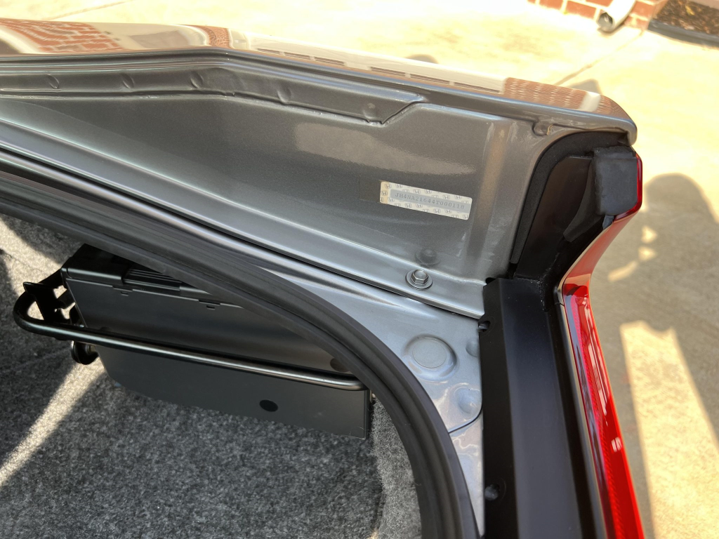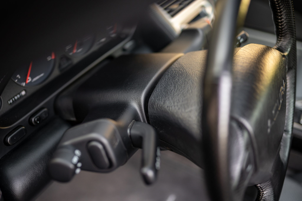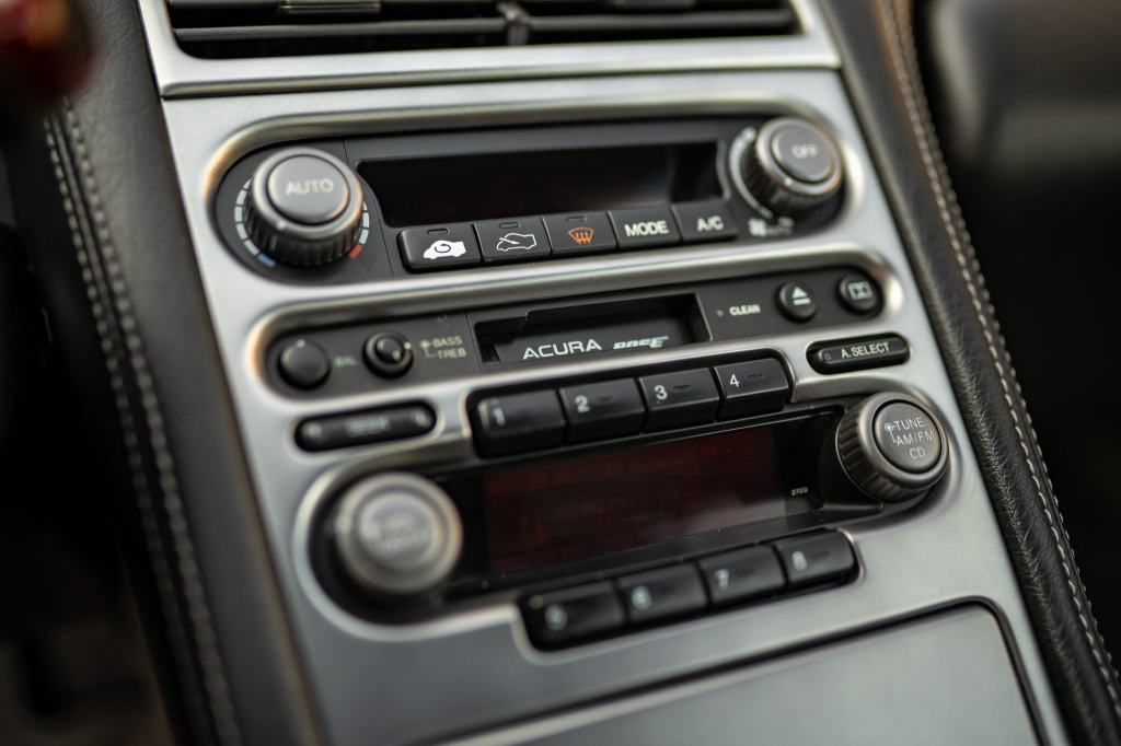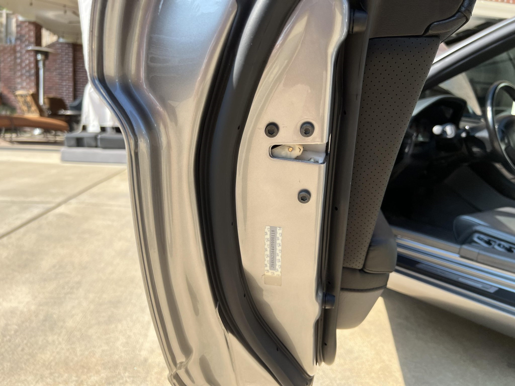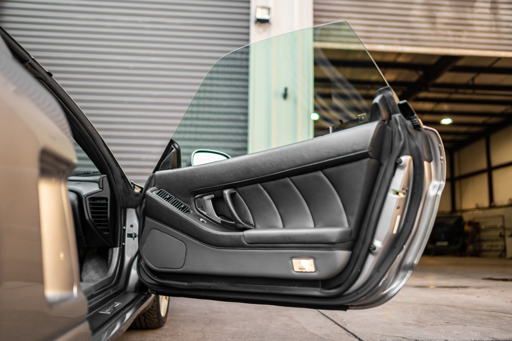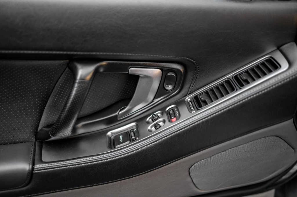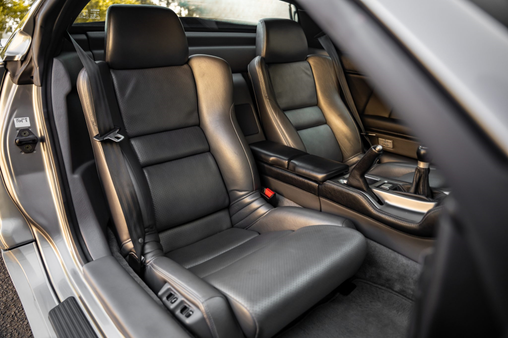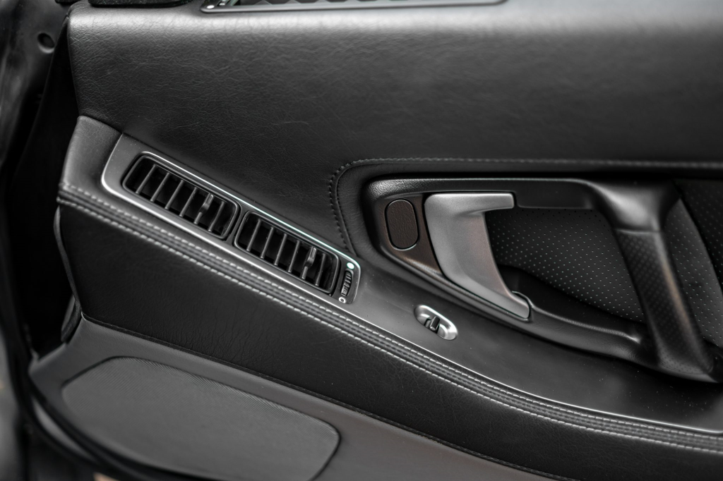 The power-adjustable bolstered bucket seats are upholstered in silver leather contrasted with black leather on the dashboard, center console, and upper door panels. Appointments include automatic climate control, a short-throw shifter, and a cassette stereo linked to a six-disc CD changer and a Bose sound system. The stainless-steel door sill plates are stamped with the car’s serial number. The capacitors for the stereo and amplifiers were replaced in July 2021, and the seat bolsters were re-dyed in February 2022.