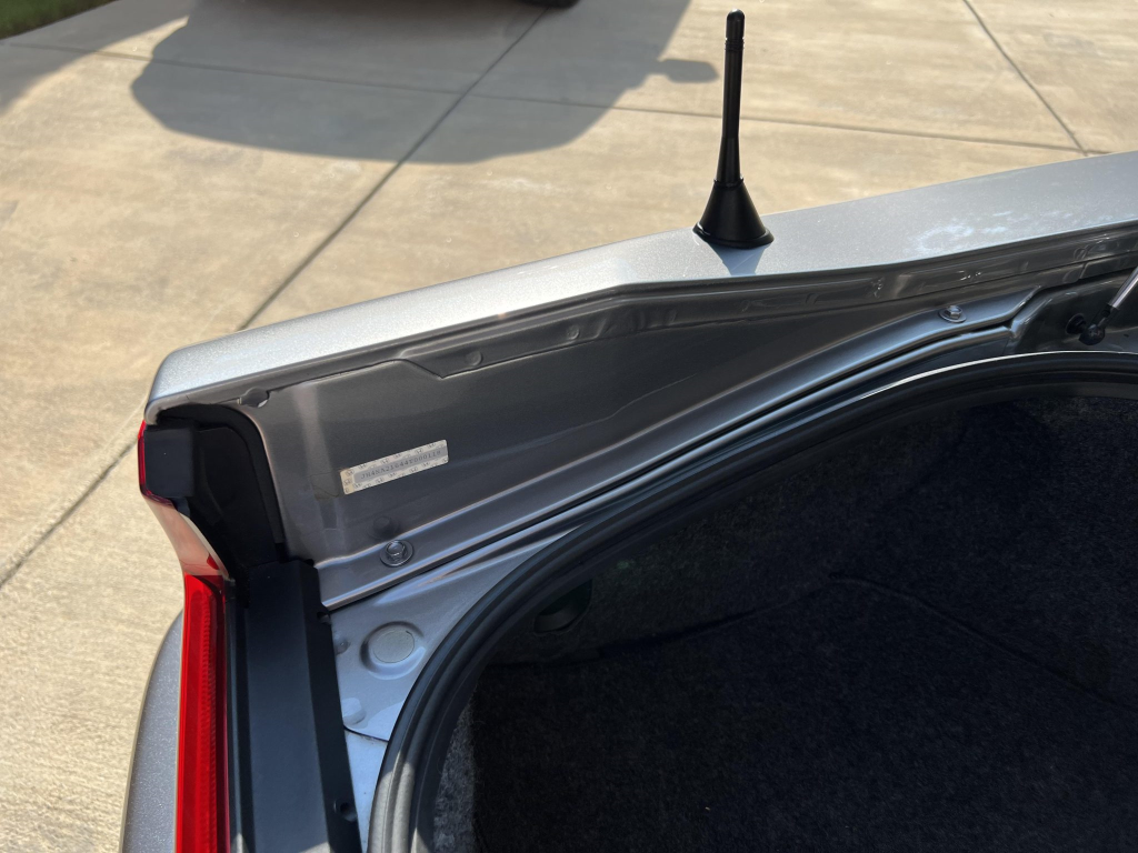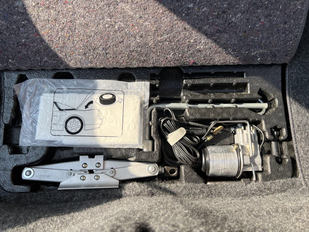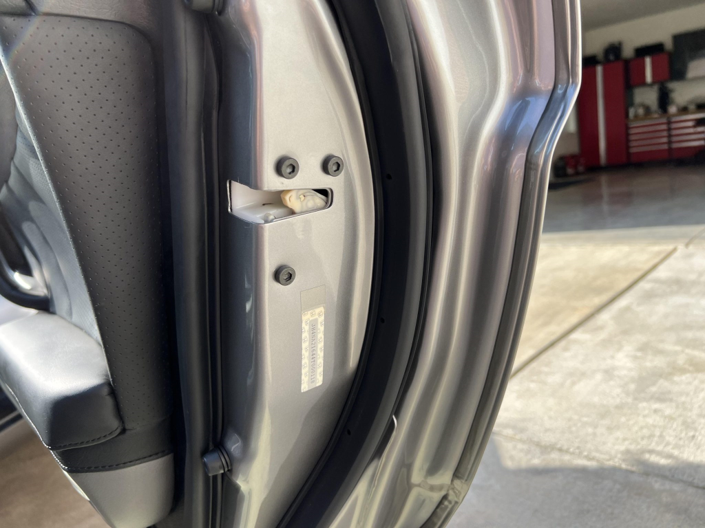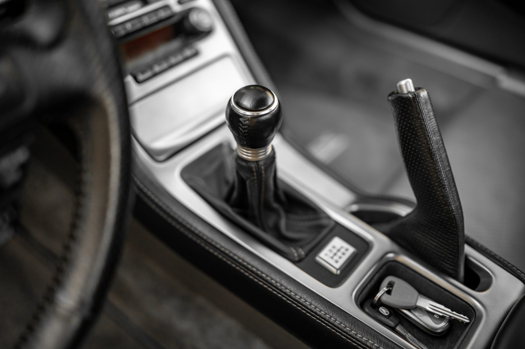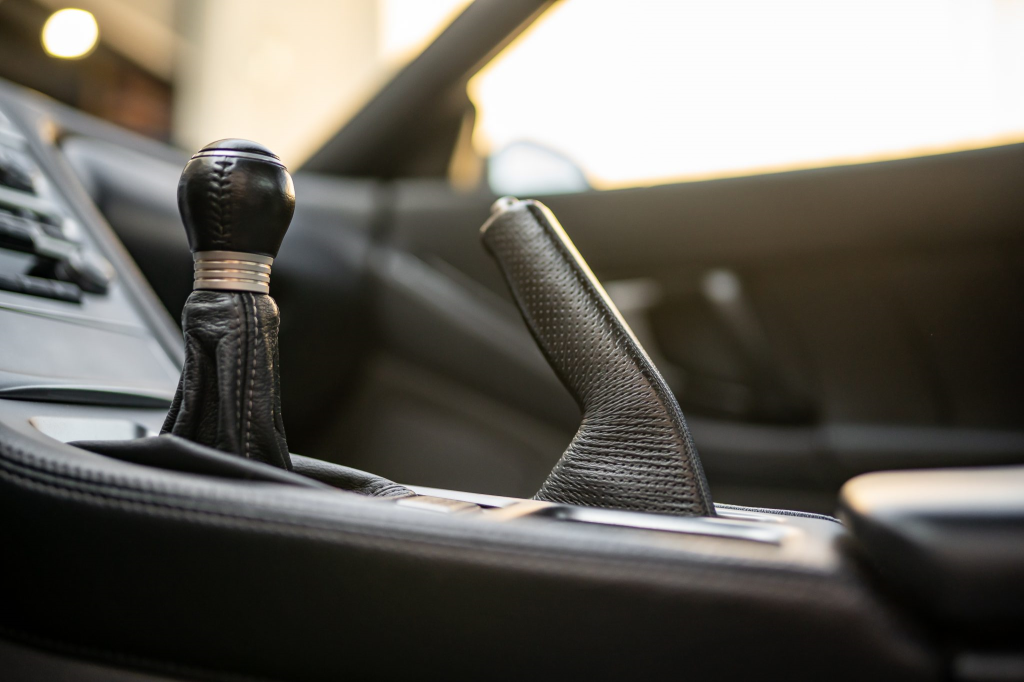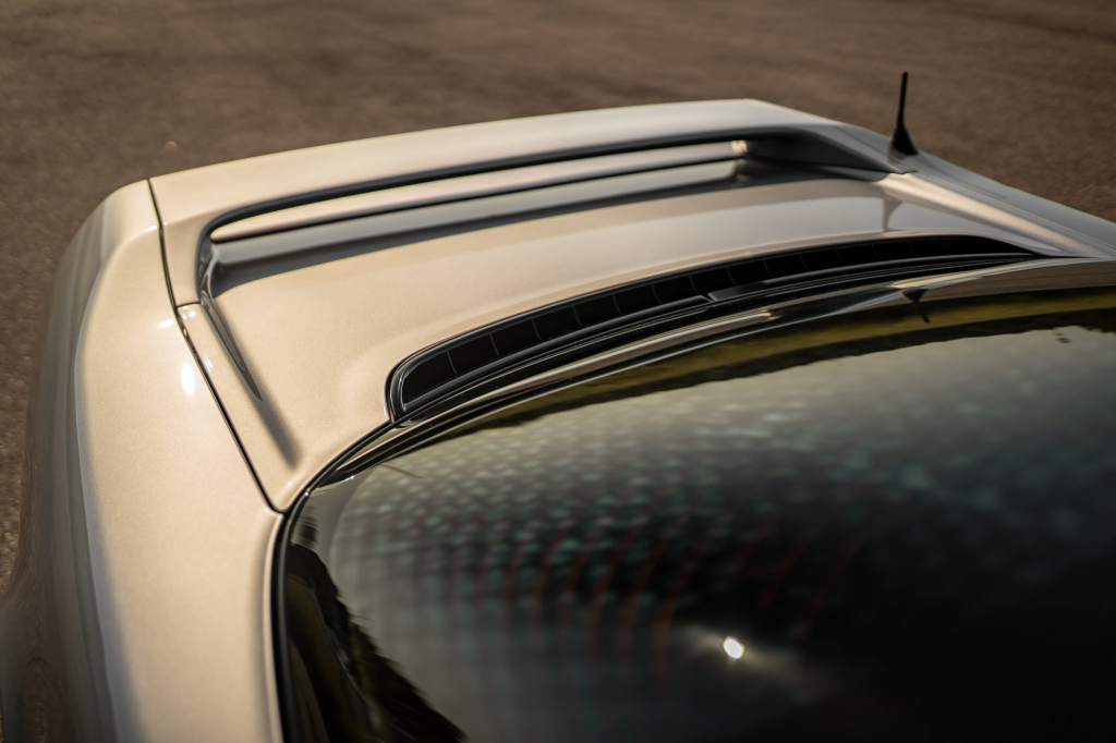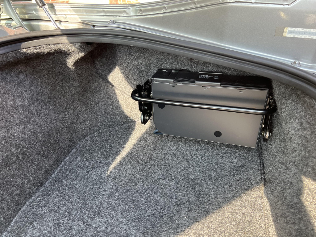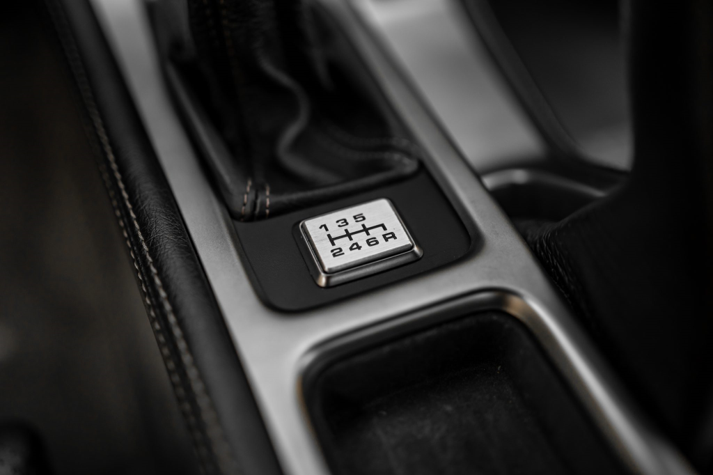 The power-adjustable bolstered bucket seats are upholstered in silver leather contrasted with black leather on the dashboard, center console, and upper door panels. Appointments include automatic climate control, a short-throw shifter, and a cassette stereo linked to a six-disc CD changer and a Bose sound system. The stainless-steel door sill plates are stamped with the car’s serial number. The capacitors for the stereo and amplifiers were replaced in July 2021, and the seat bolsters were re-dyed in February 2022.