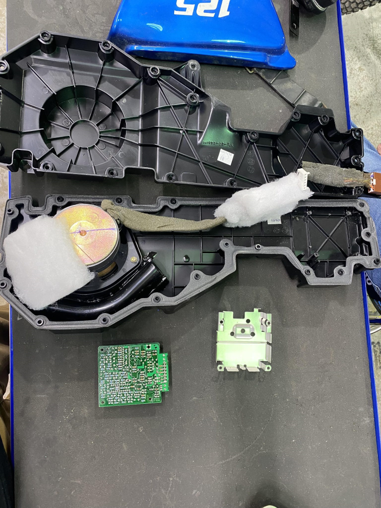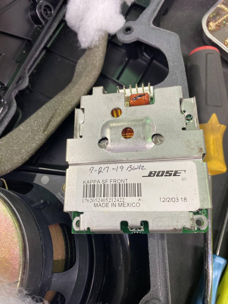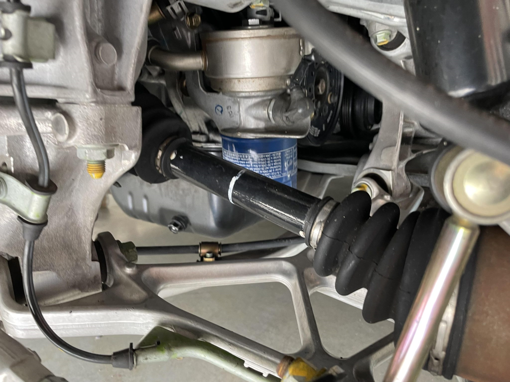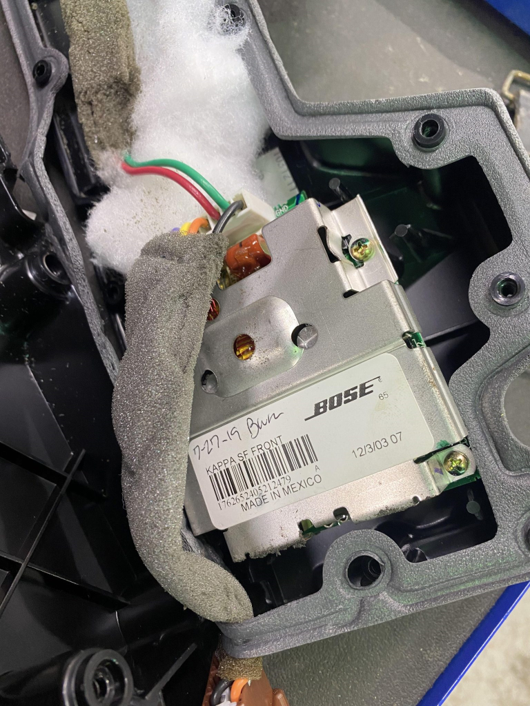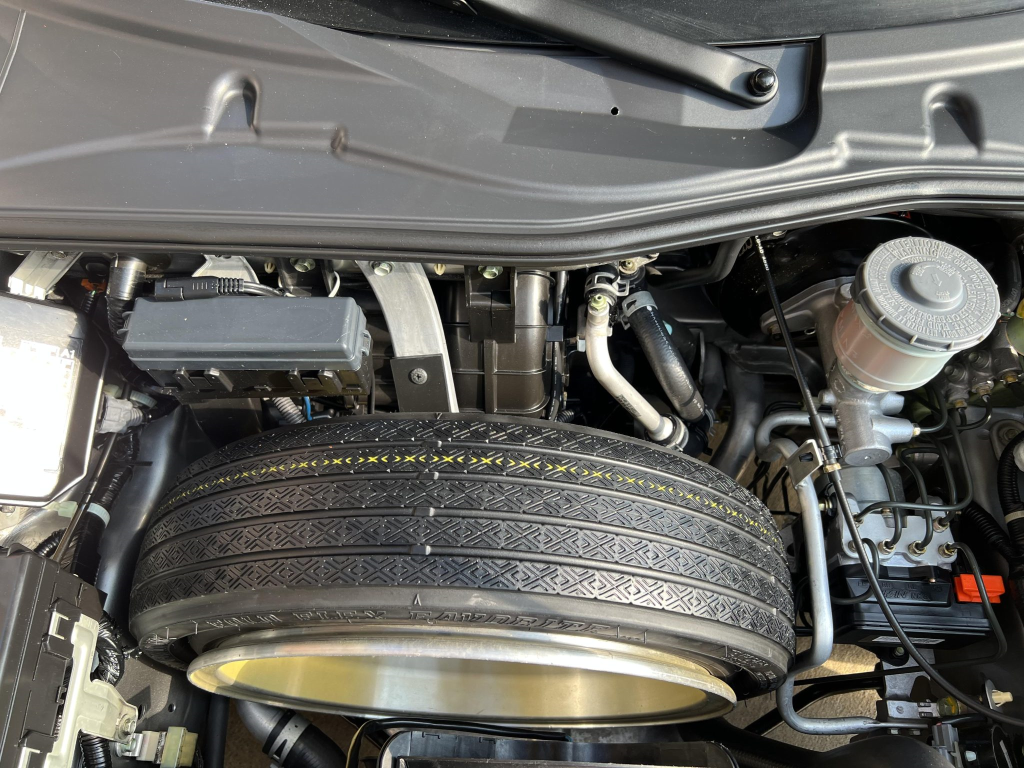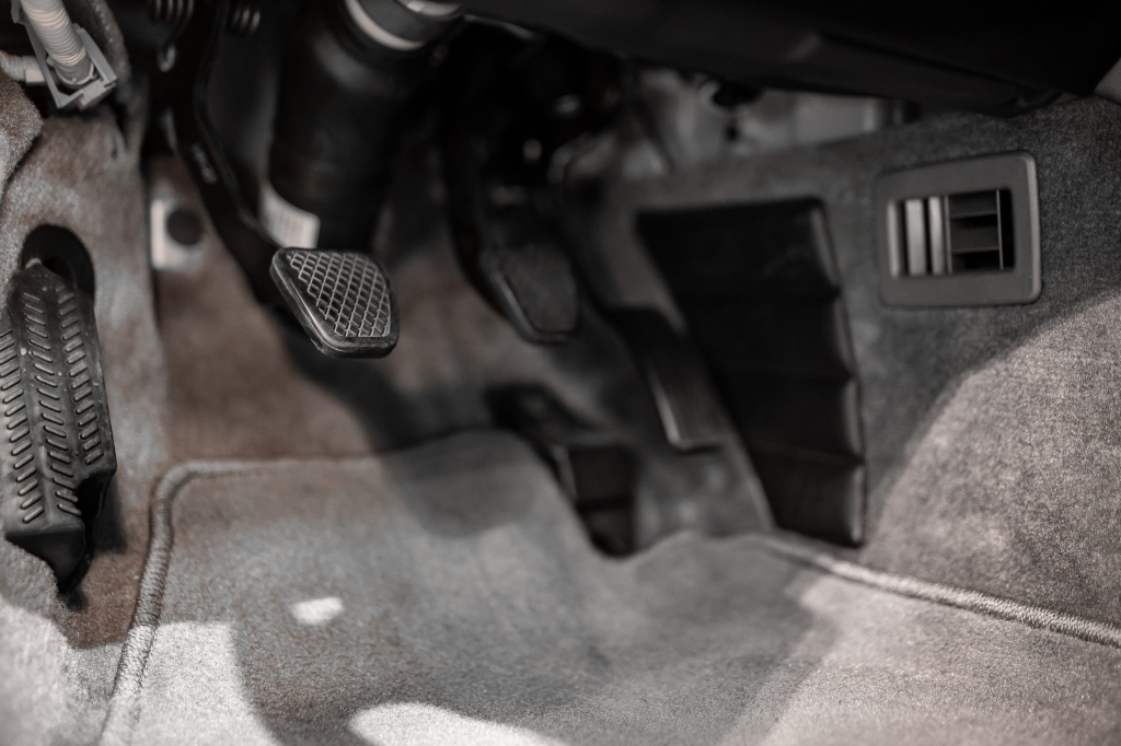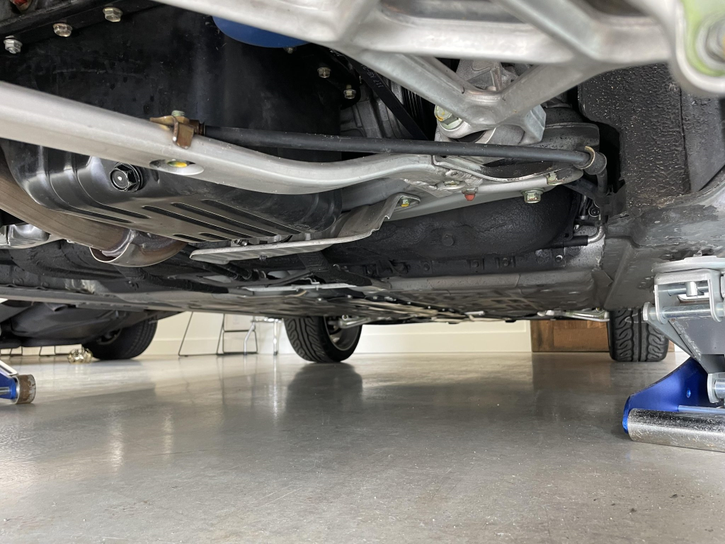 The power-adjustable bolstered bucket seats are upholstered in silver leather contrasted with black leather on the dashboard, center console, and upper door panels. Appointments include automatic climate control, a short-throw shifter, and a cassette stereo linked to a six-disc CD changer and a Bose sound system. The stainless-steel door sill plates are stamped with the car’s serial number. The capacitors for the stereo and amplifiers were replaced in July 2021, and the seat bolsters were re-dyed in February 2022.