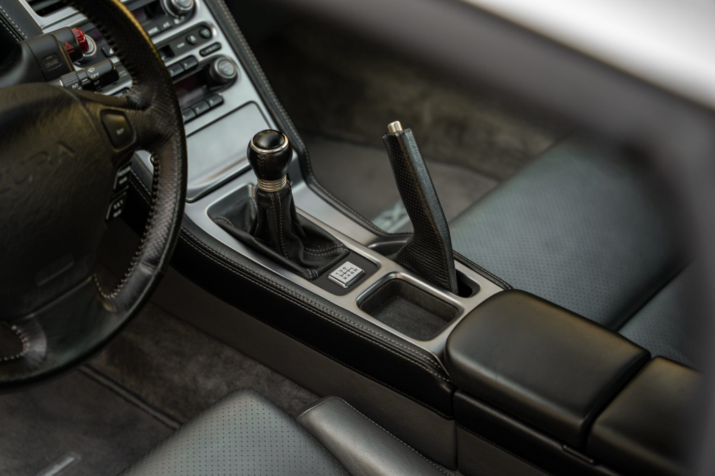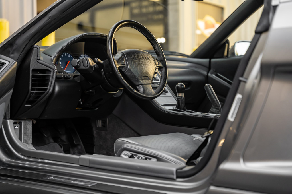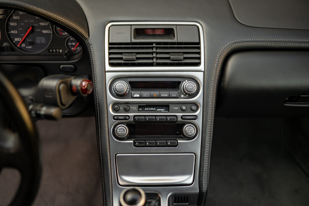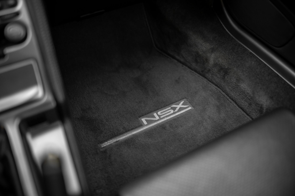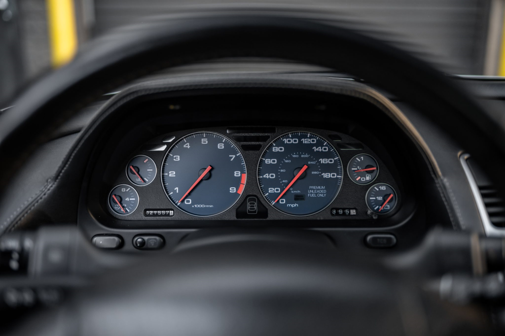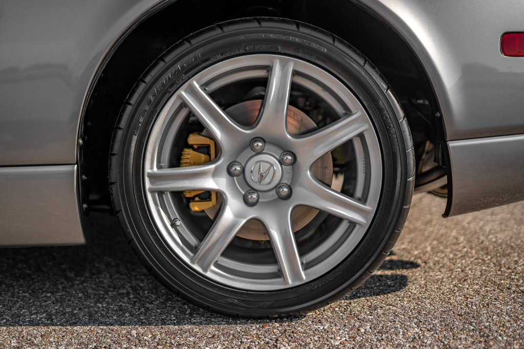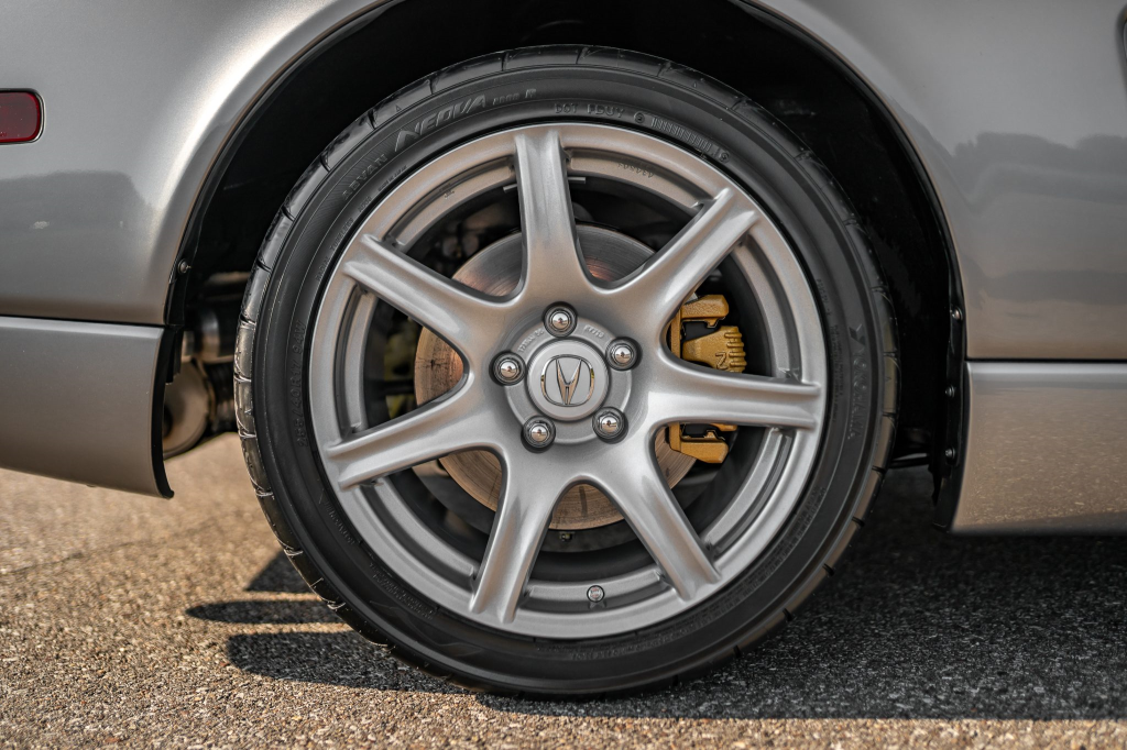 Seven-spoke 17″ forged wheels have been refinished and were wrapped in 215/40 front and 255/40 rear Yokohama Advan Neova tires in 2020. The car features a four-wheel double-wishbone suspension with front and rear stabilizer bars, and braking is handled by gold NSX-branded calipers over a ventilated rotor at each corner. The steering rack was rebuilt in February 2022.