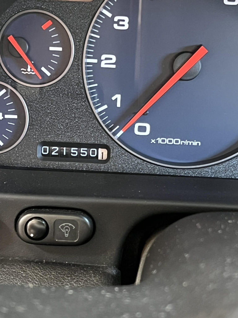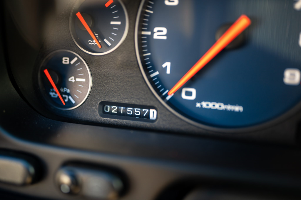 The leather-wrapped steering wheel frames a tachometer with an 8k-rpm redline, a 188-mph speedometer, and gauges for coolant temperature, oil pressure, voltage, and fuel level. The six-digit odometer shows 22k miles, approximately 1k of which were added under current ownership.