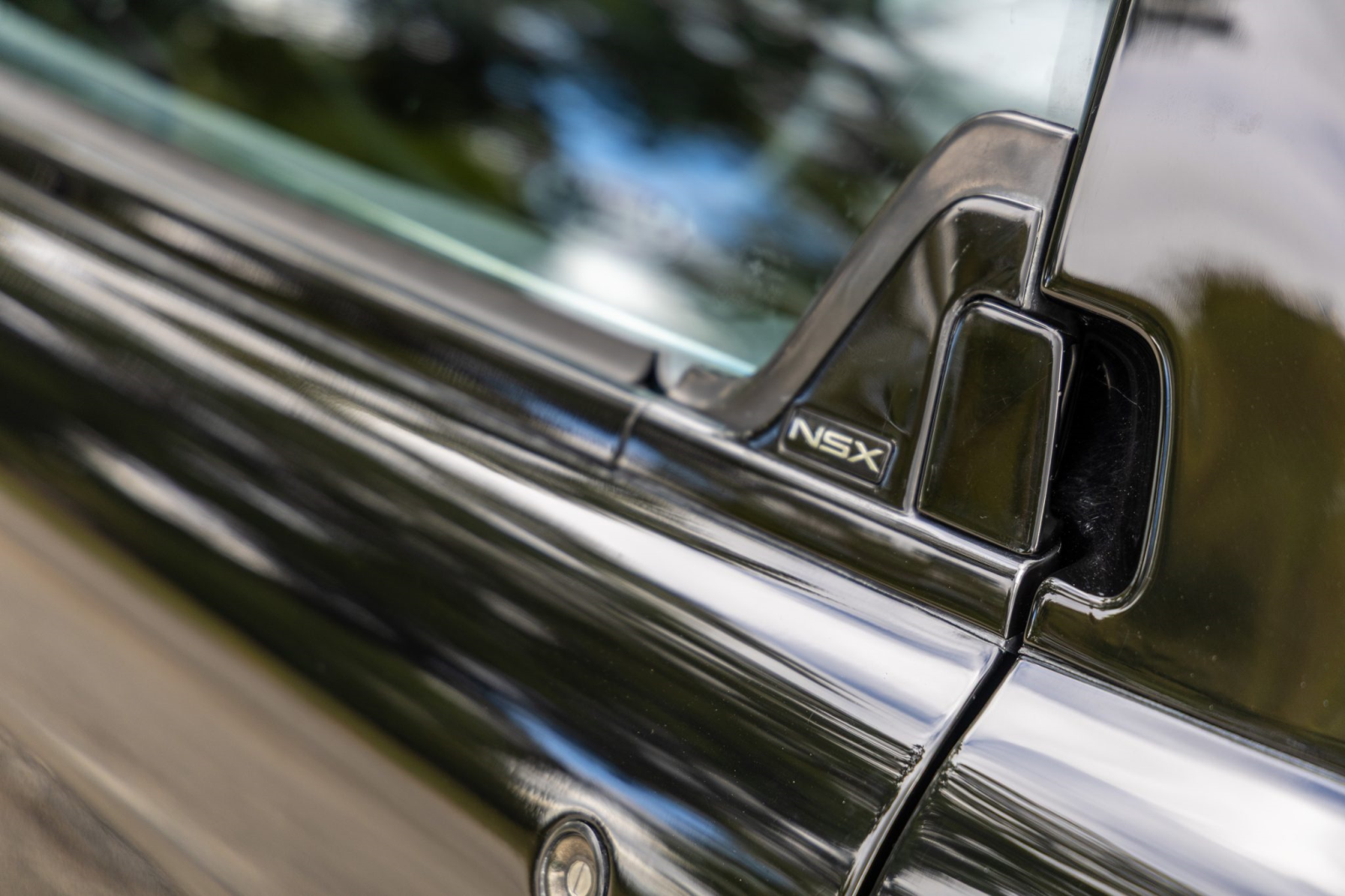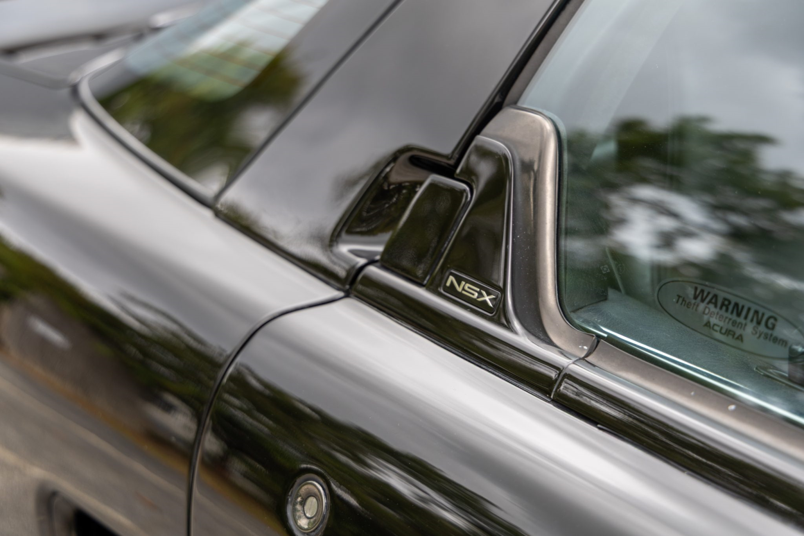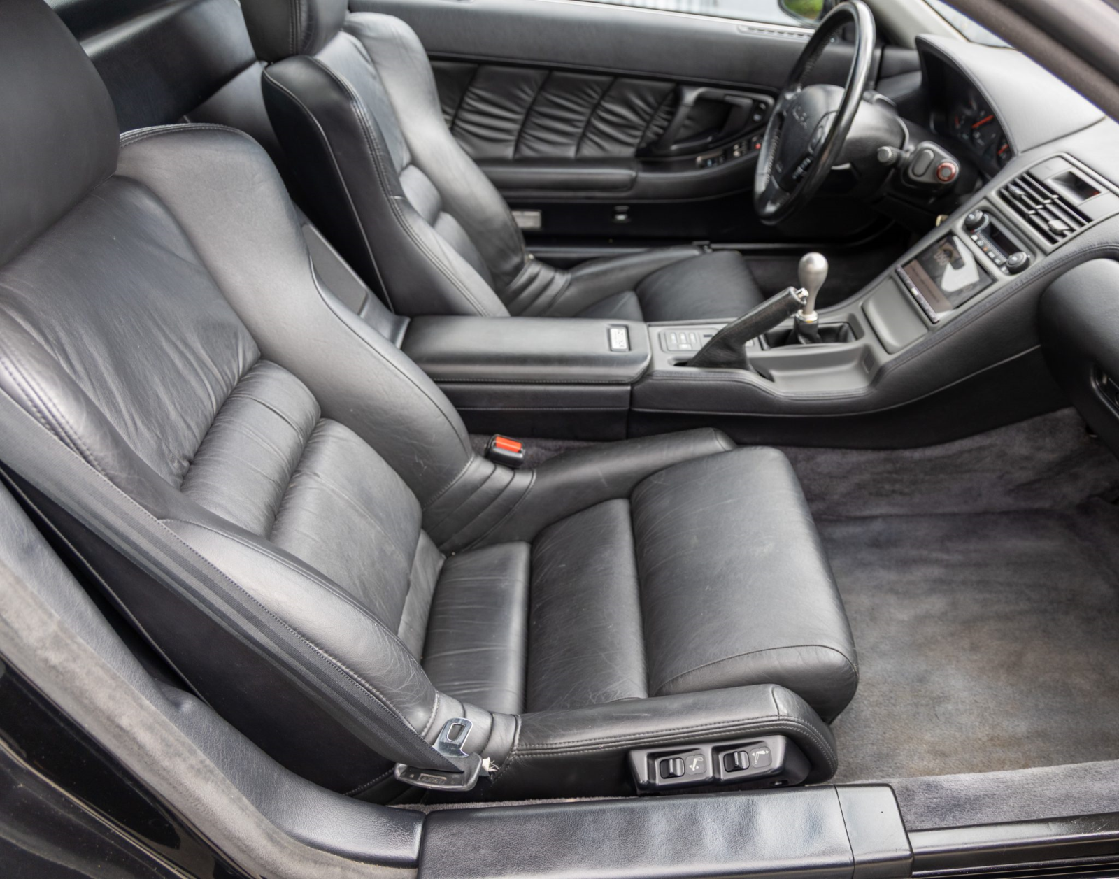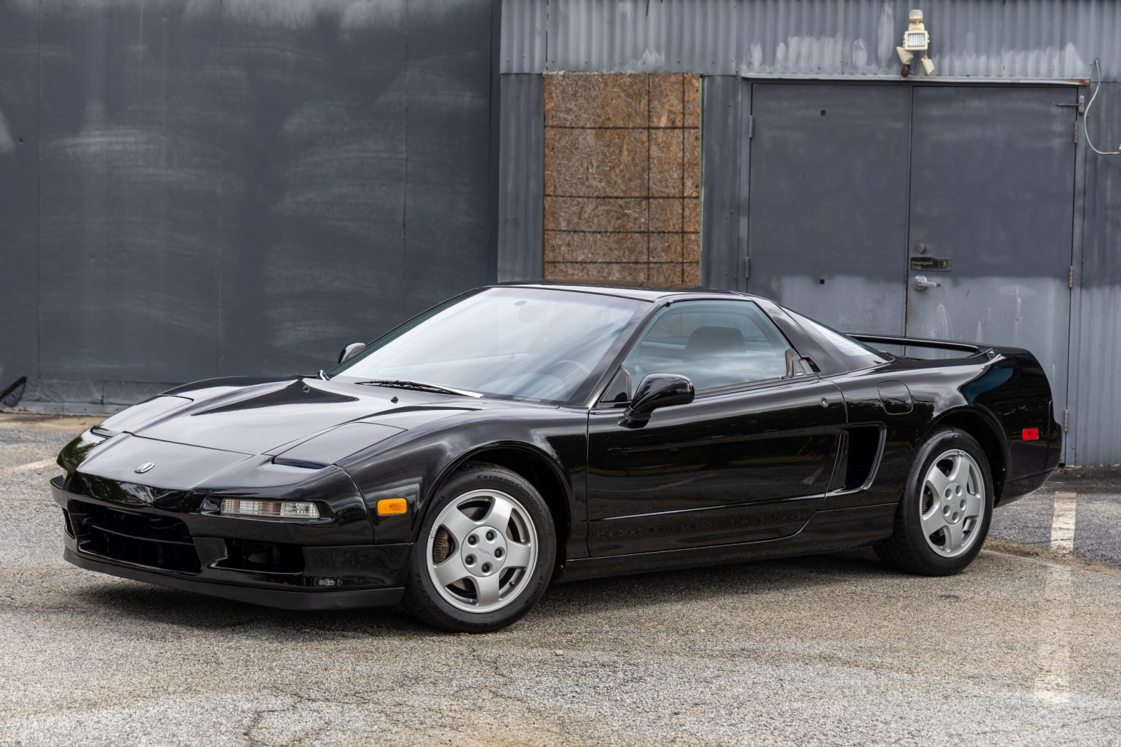 The NSX featured aluminum bodywork, and this example is finished in Berlina Black. Exterior details include pop-up headlights, an integrated rear wing, side air intakes, power-adjustable side mirrors, and dual exhaust outlets.