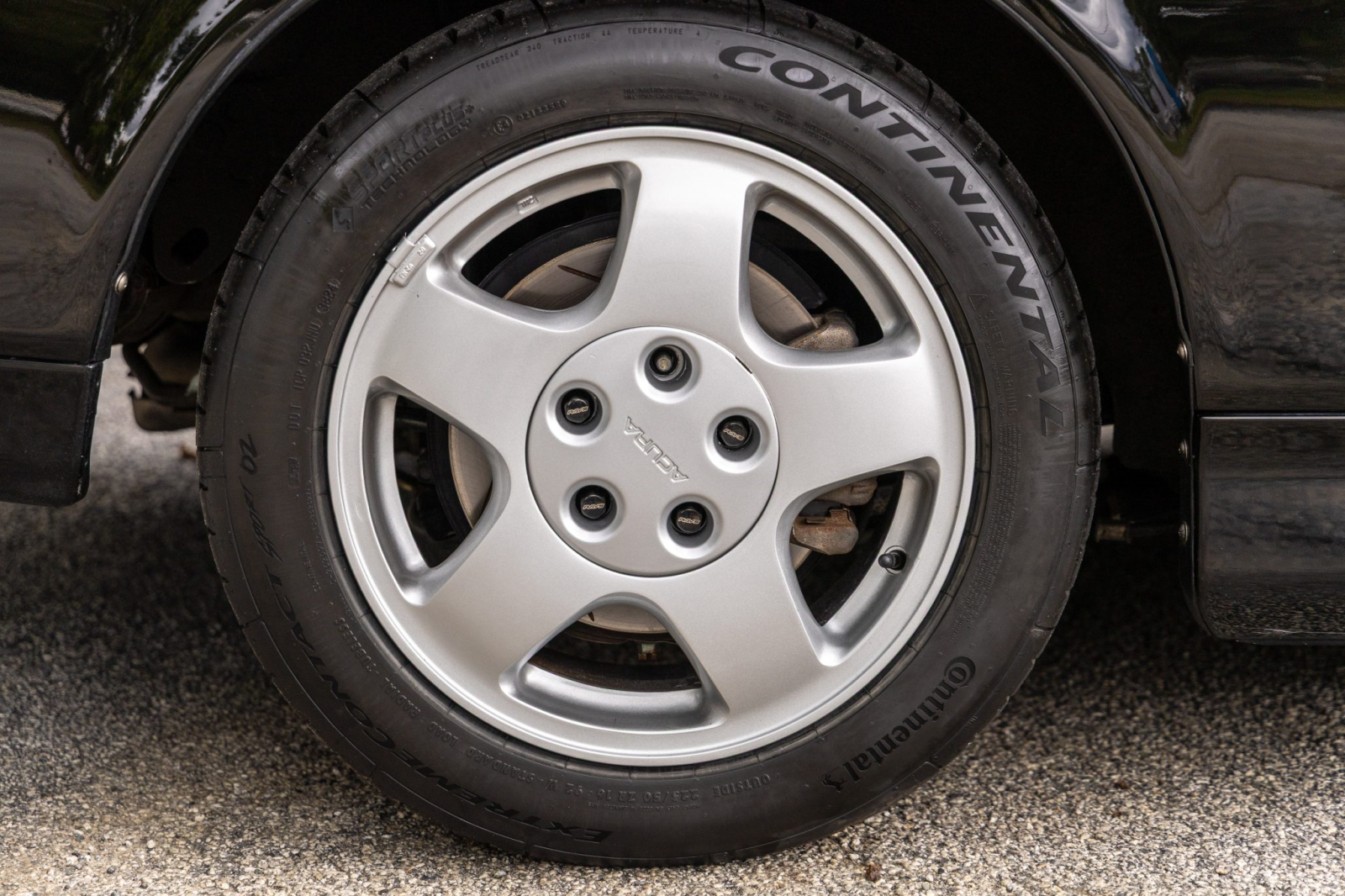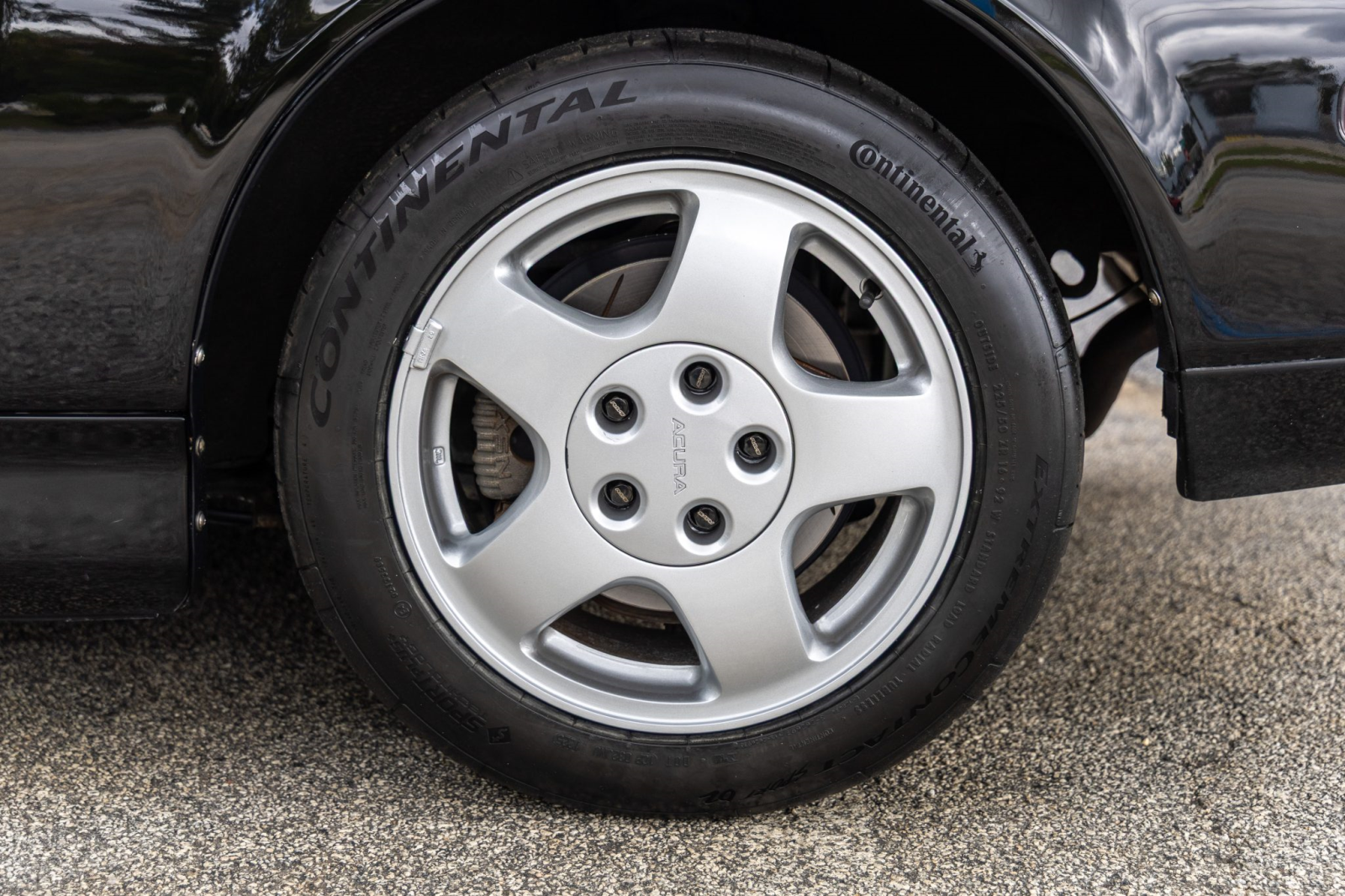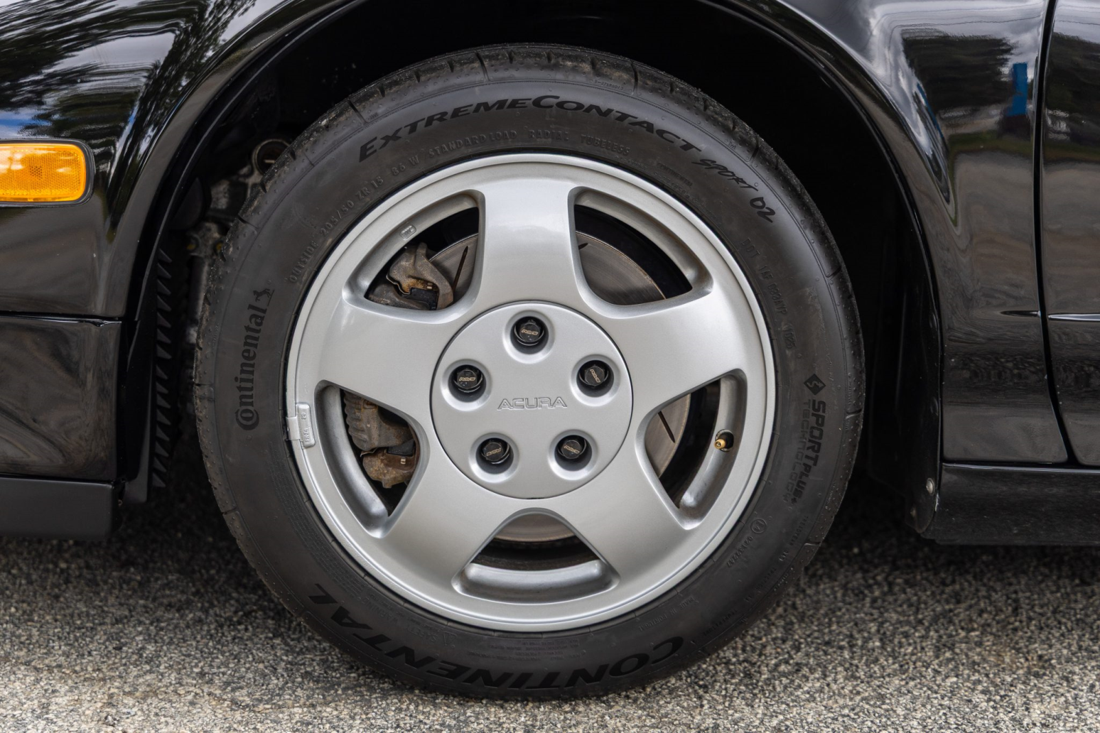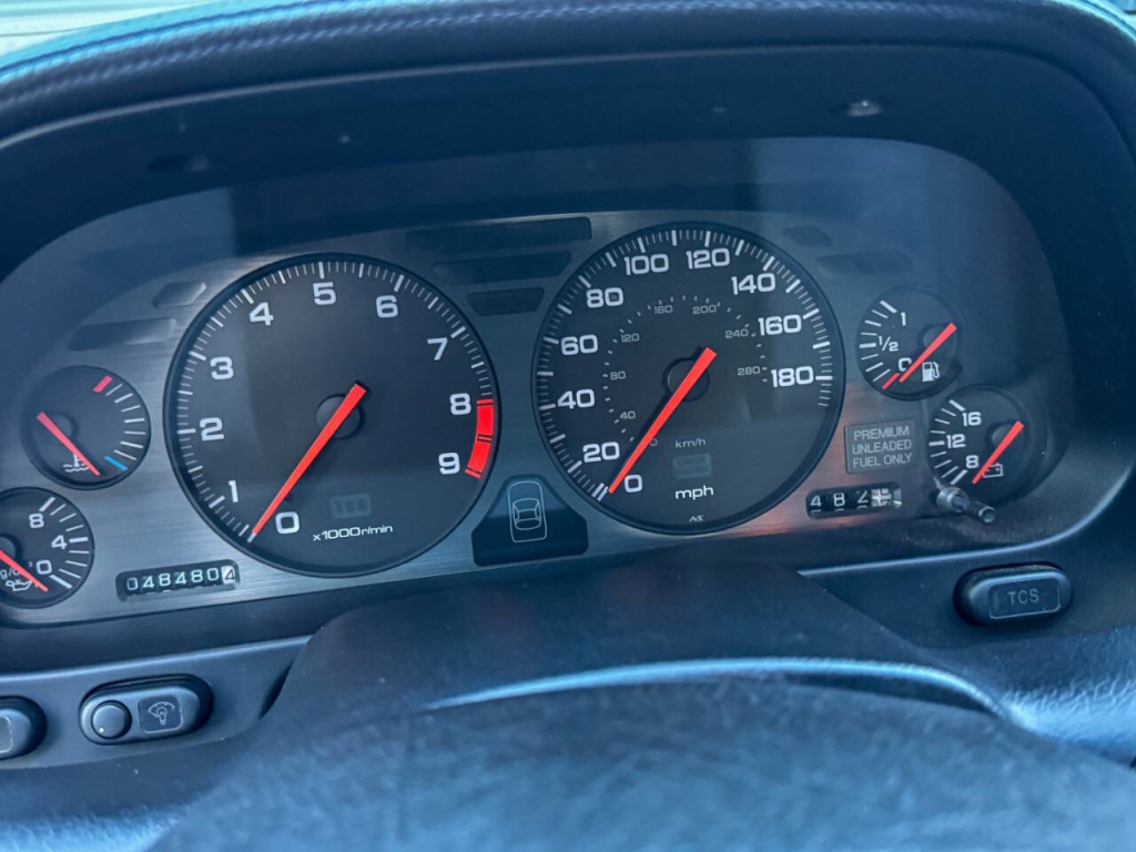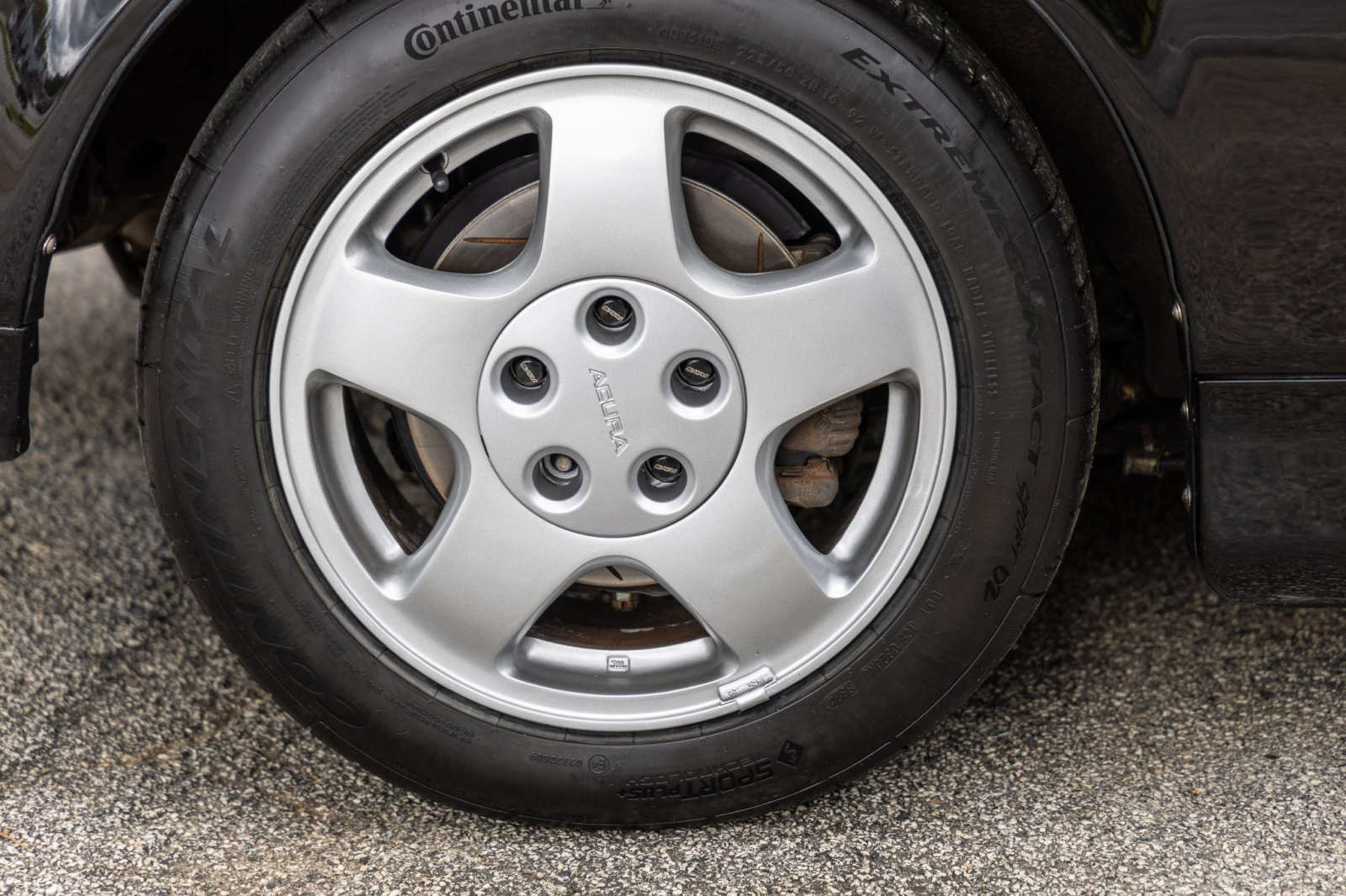 Staggered-diameter 15″ and 16″ five-spoke forged wheels wear Continental tires that were mounted in preparation for the sale. The car features a four-wheel double-wishbone suspension with front and rear stabilizer bars, and braking is handled by NSX-branded calipers over slotted rotors at each corner.