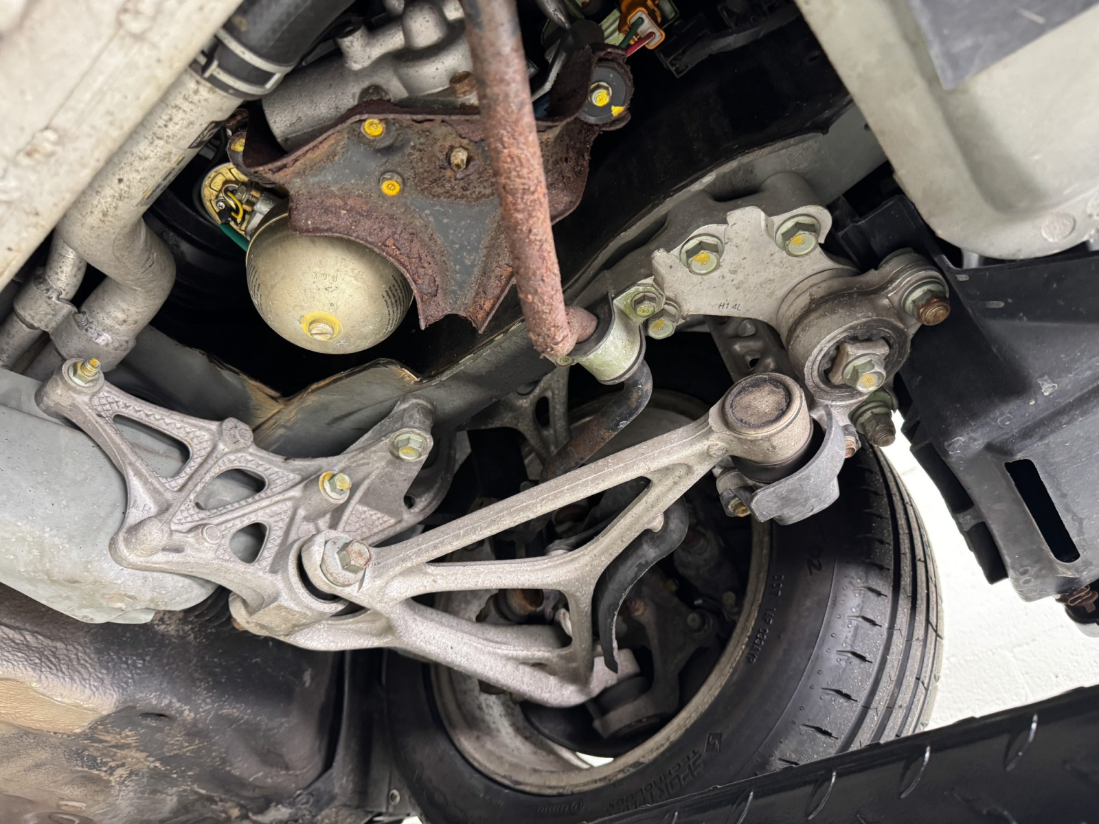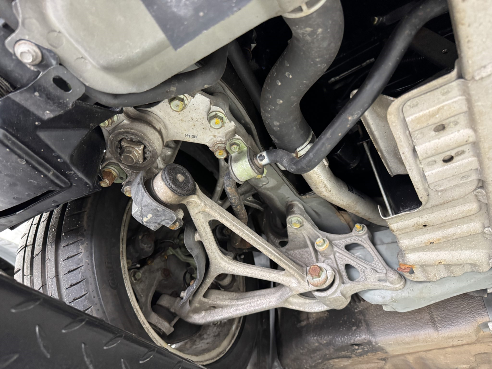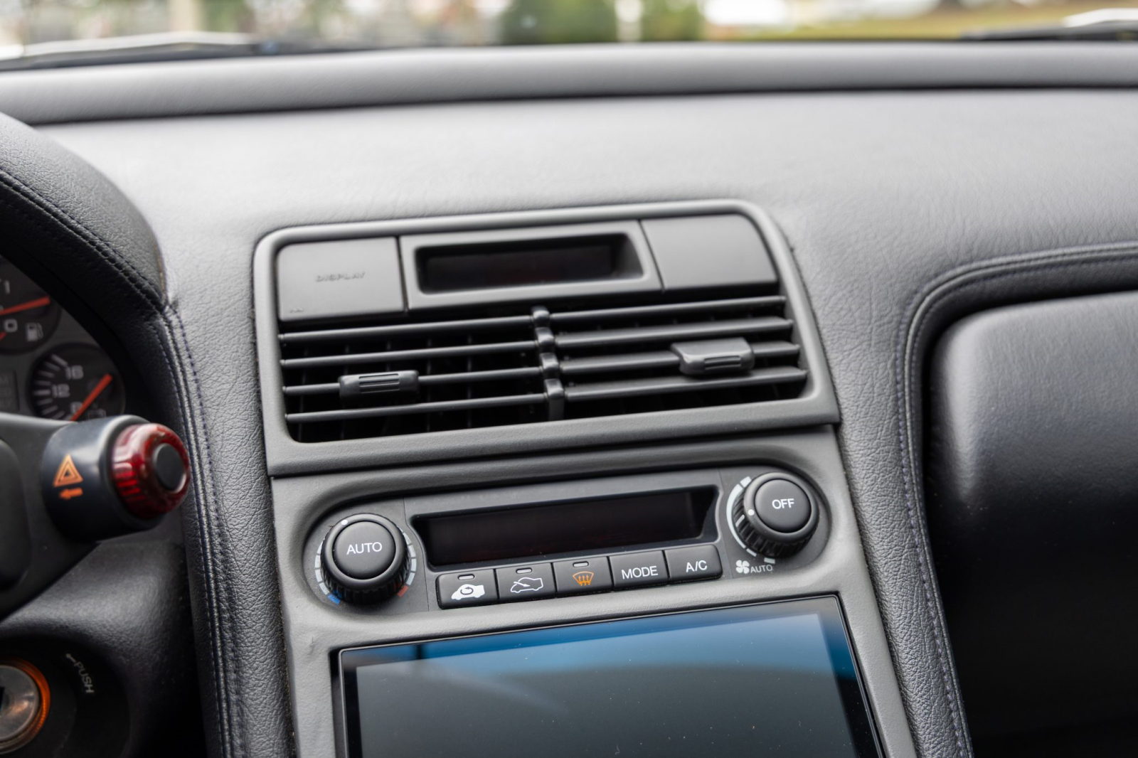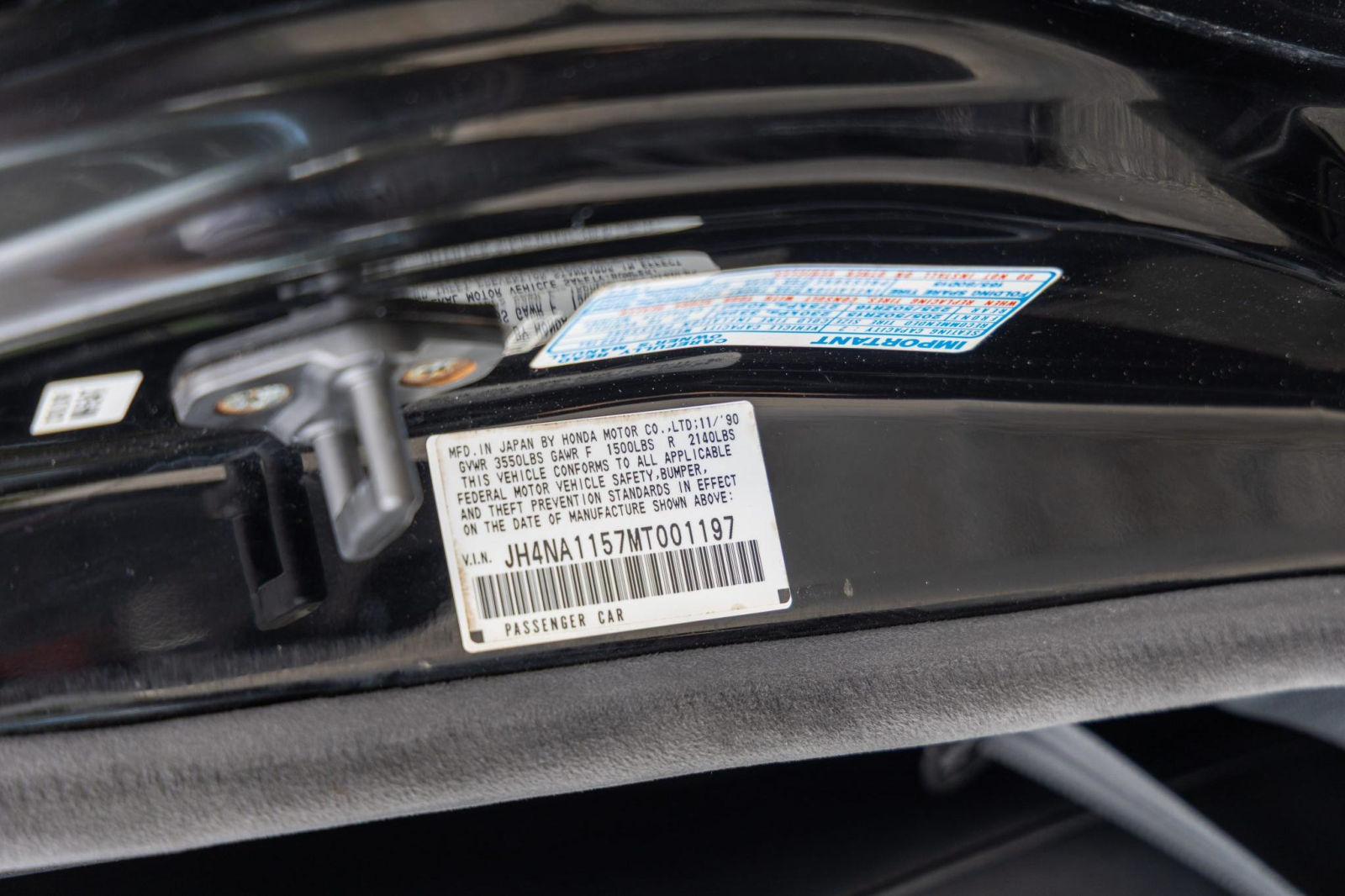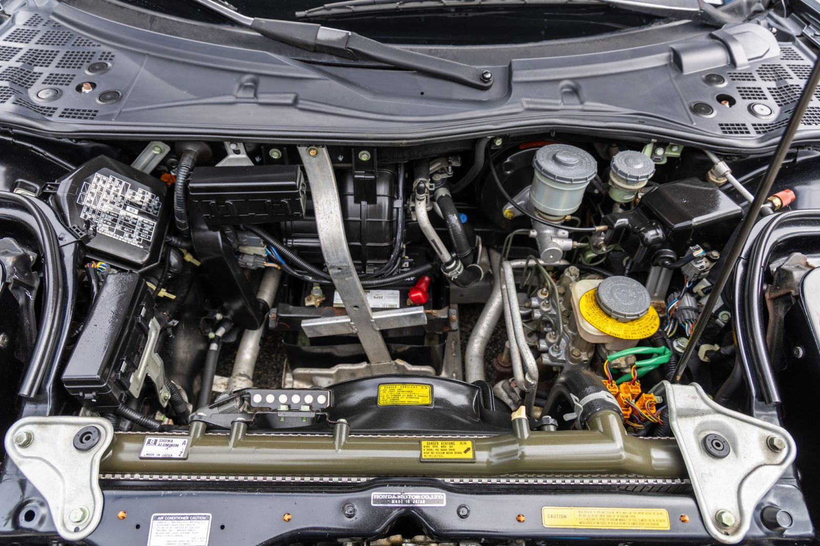 Staggered-diameter 15″ and 16″ five-spoke forged wheels wear Continental tires that were mounted in preparation for the sale. The car features a four-wheel double-wishbone suspension with front and rear stabilizer bars, and braking is handled by NSX-branded calipers over slotted rotors at each corner.