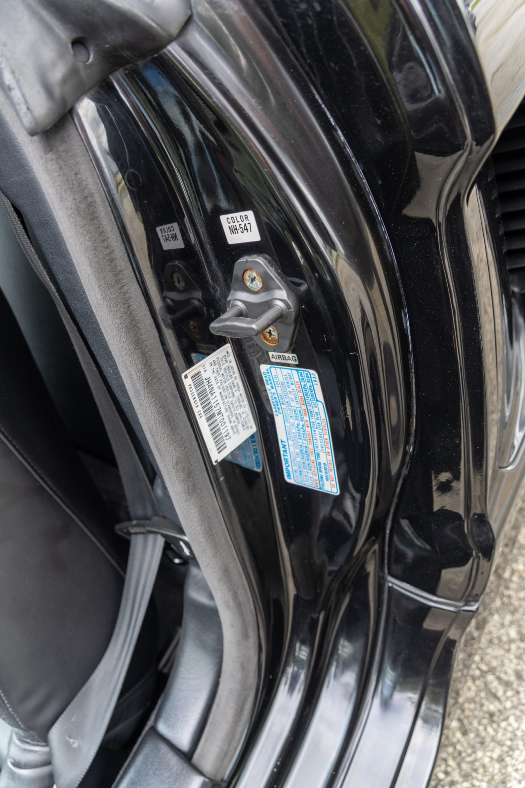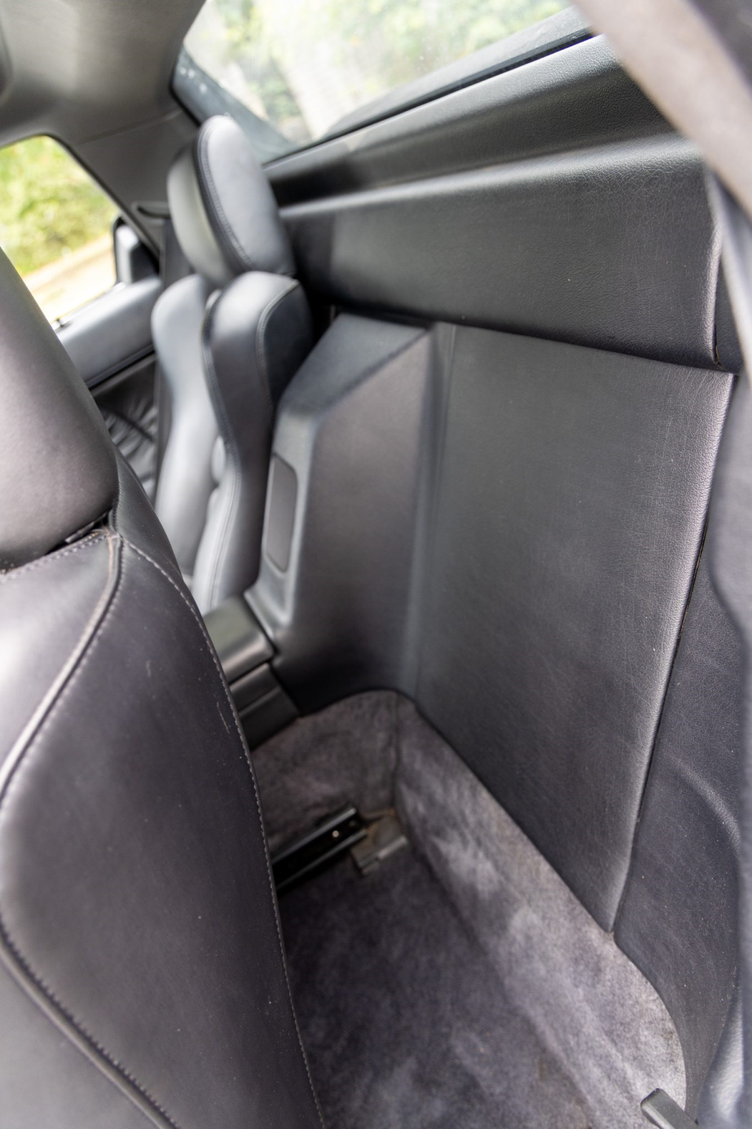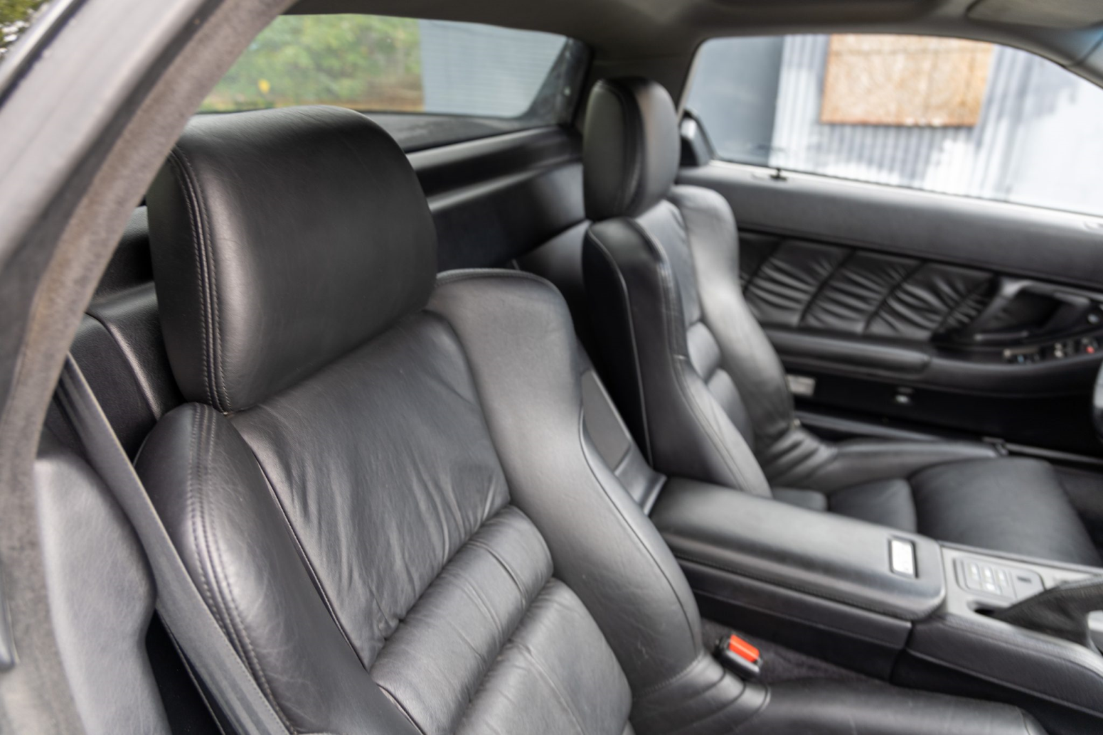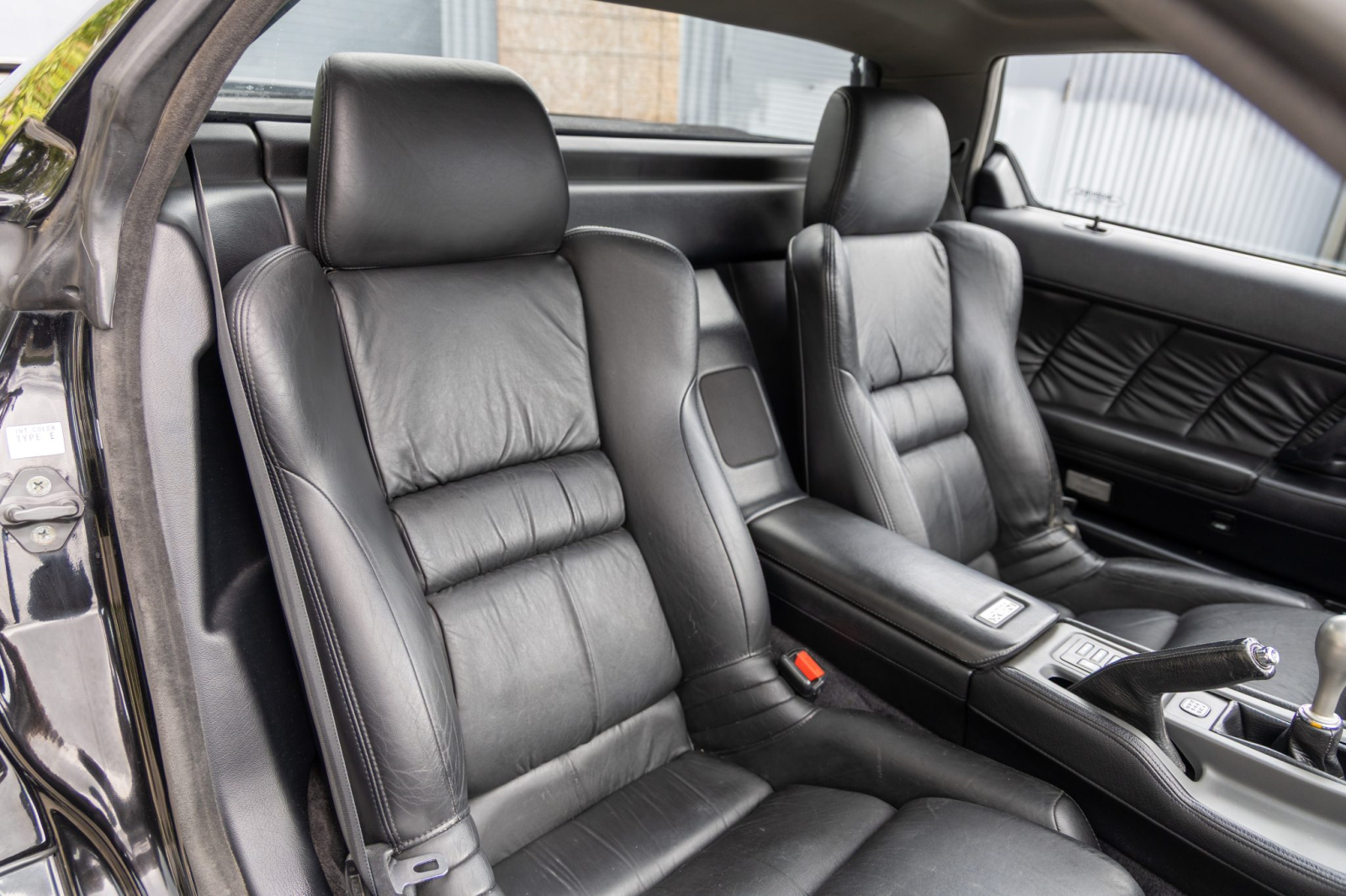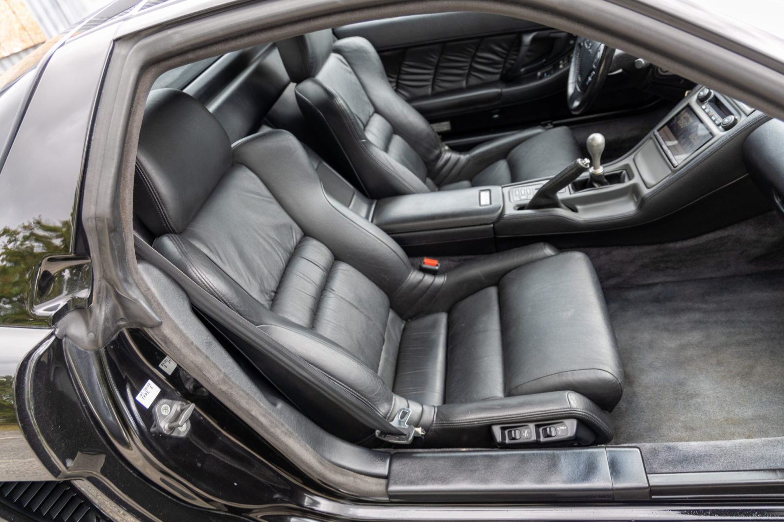 The cabin features power-adjustable sport seats upholstered in black leather. Interior amenities include automatic climate control, cruise control, an aluminum shift knob, a Bose sound system, and a Sony head unit. The stainless-steel door sill plates are stamped with the car’s serial number.