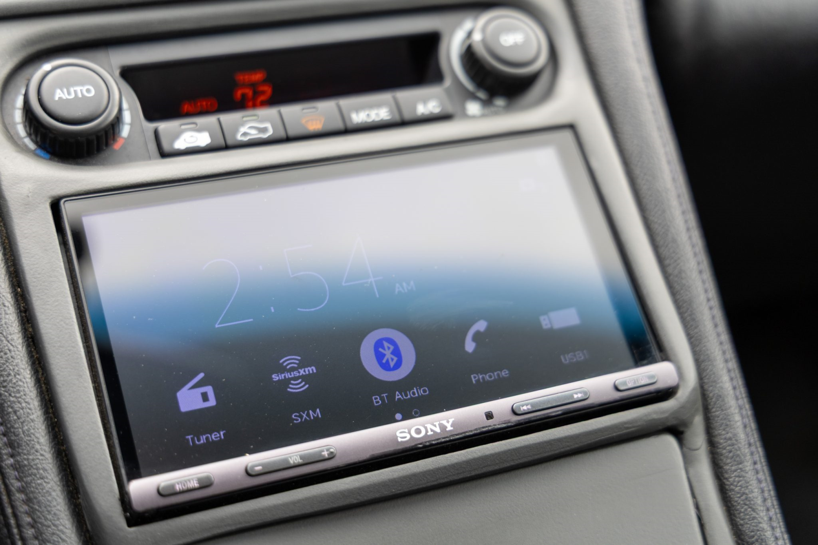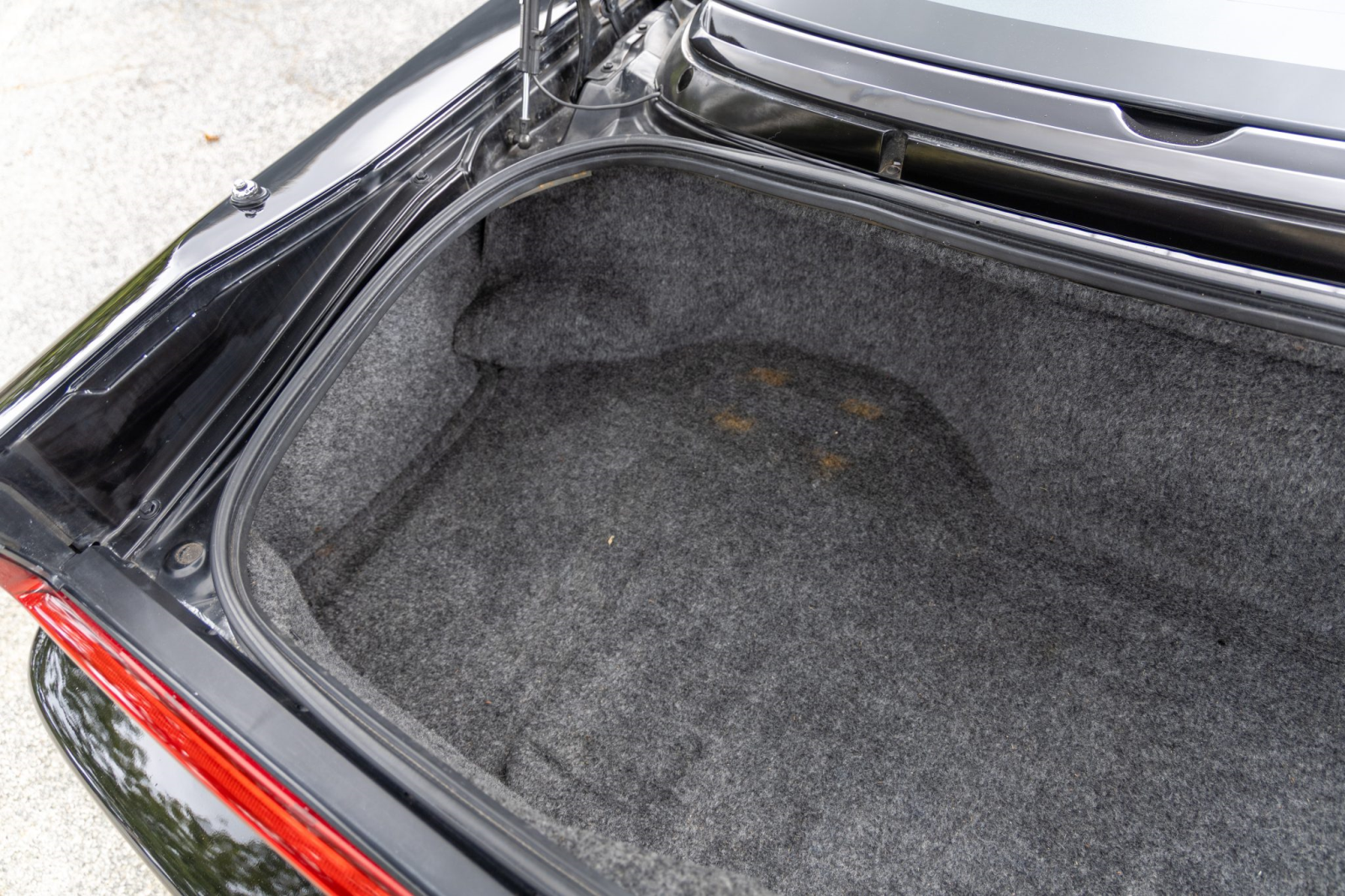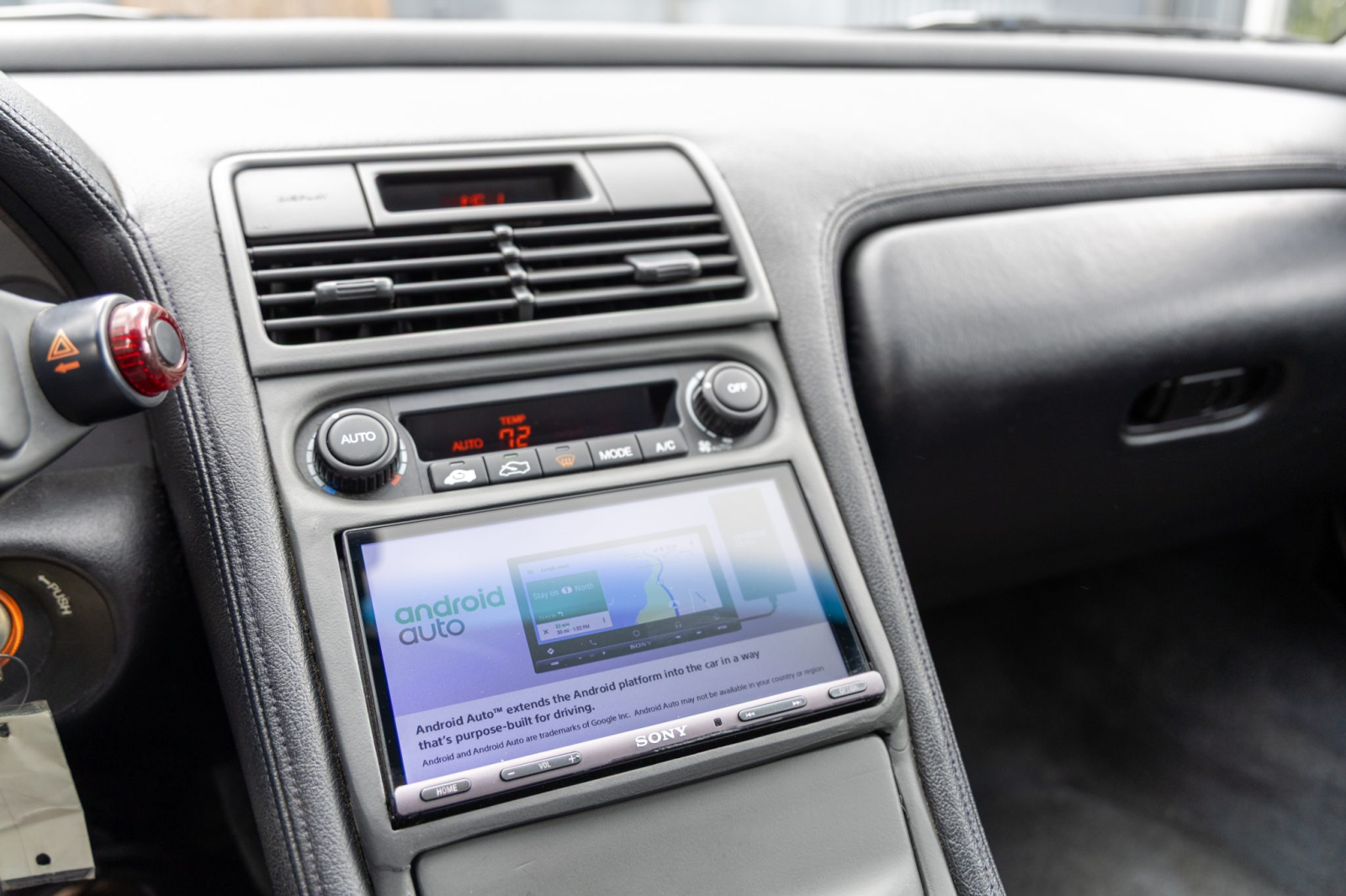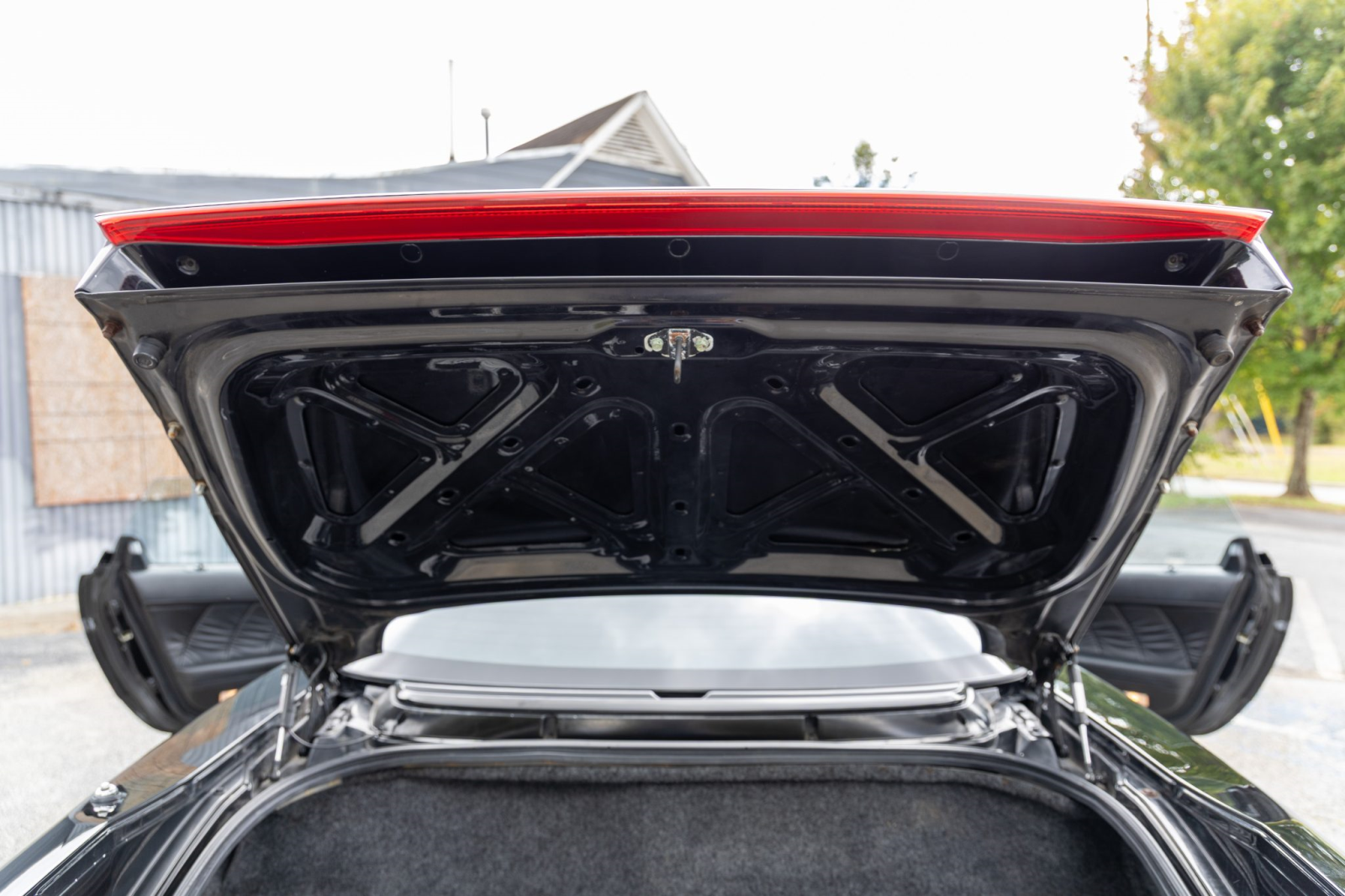 The cabin features power-adjustable sport seats upholstered in black leather. Interior amenities include automatic climate control, cruise control, an aluminum shift knob, a Bose sound system, and a Sony head unit. The stainless-steel door sill plates are stamped with the car’s serial number.