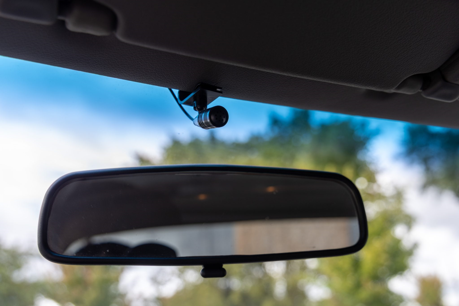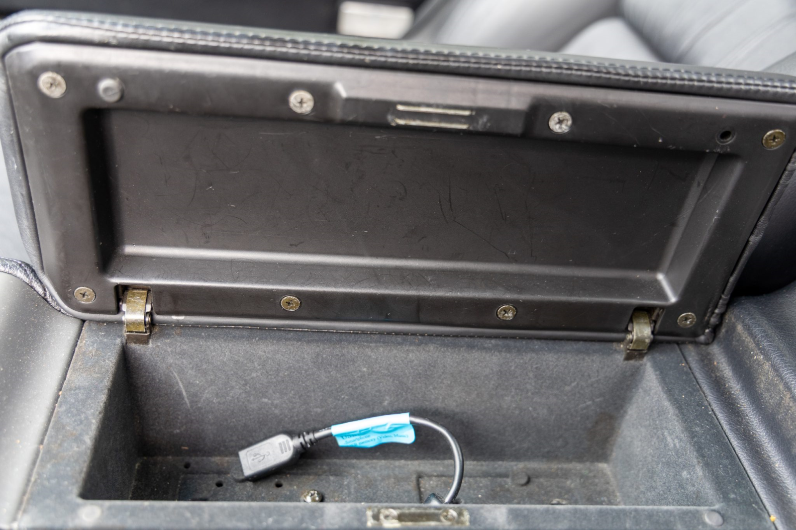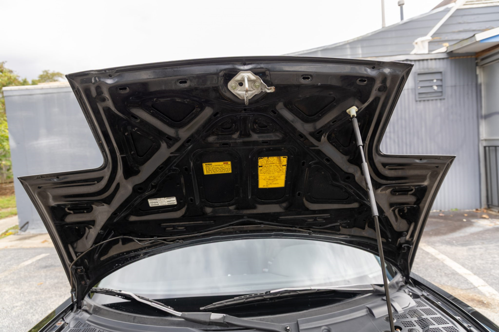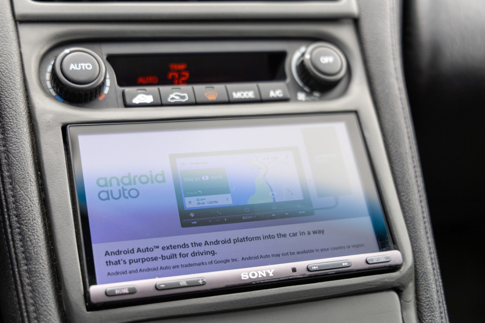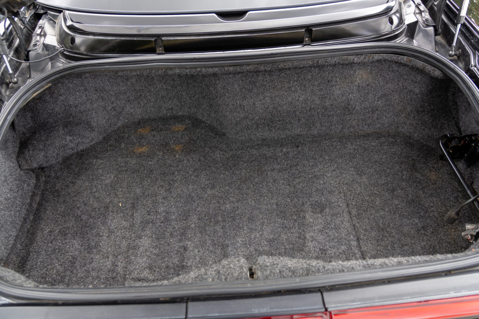 The cabin features power-adjustable sport seats upholstered in black leather. Interior amenities include automatic climate control, cruise control, an aluminum shift knob, a Bose sound system, and a Sony head unit. The stainless-steel door sill plates are stamped with the car’s serial number.