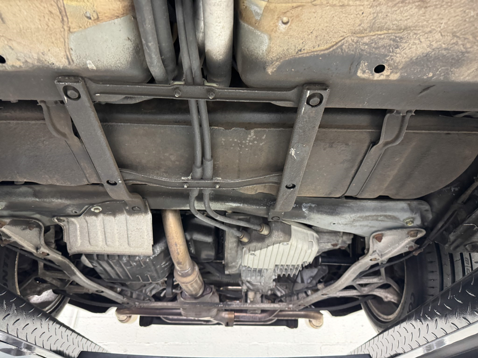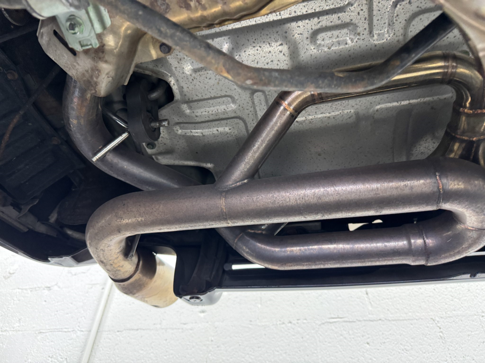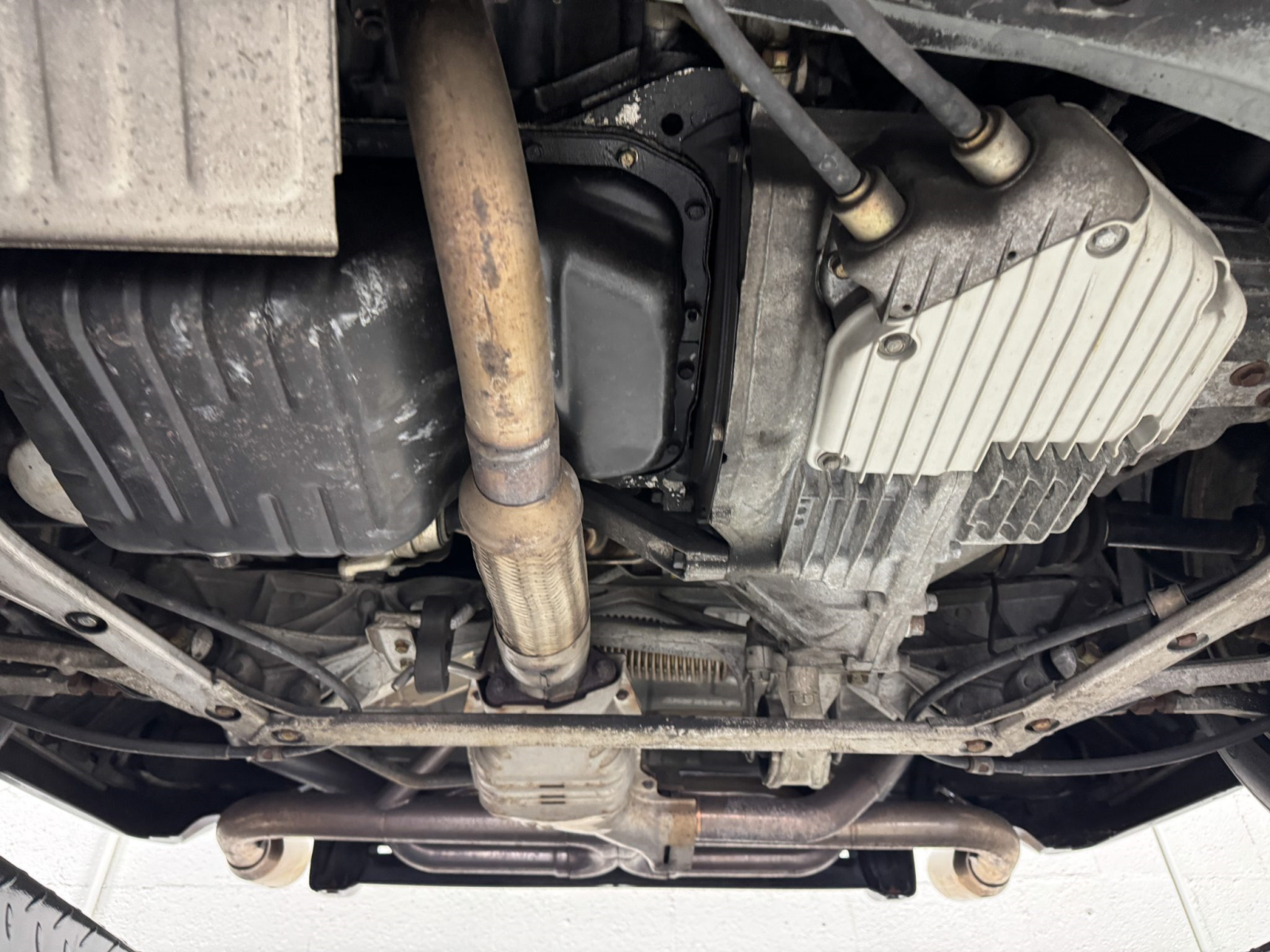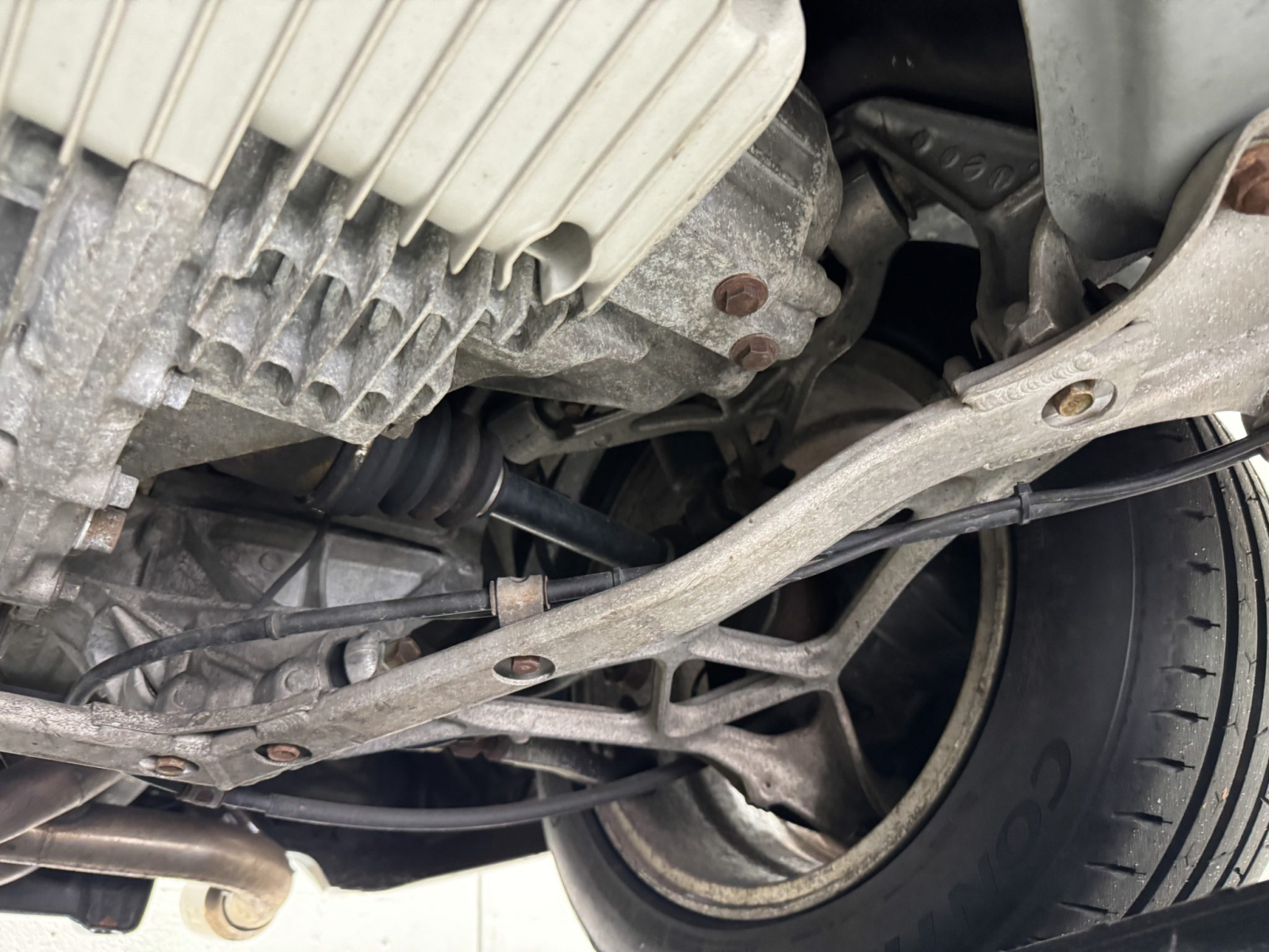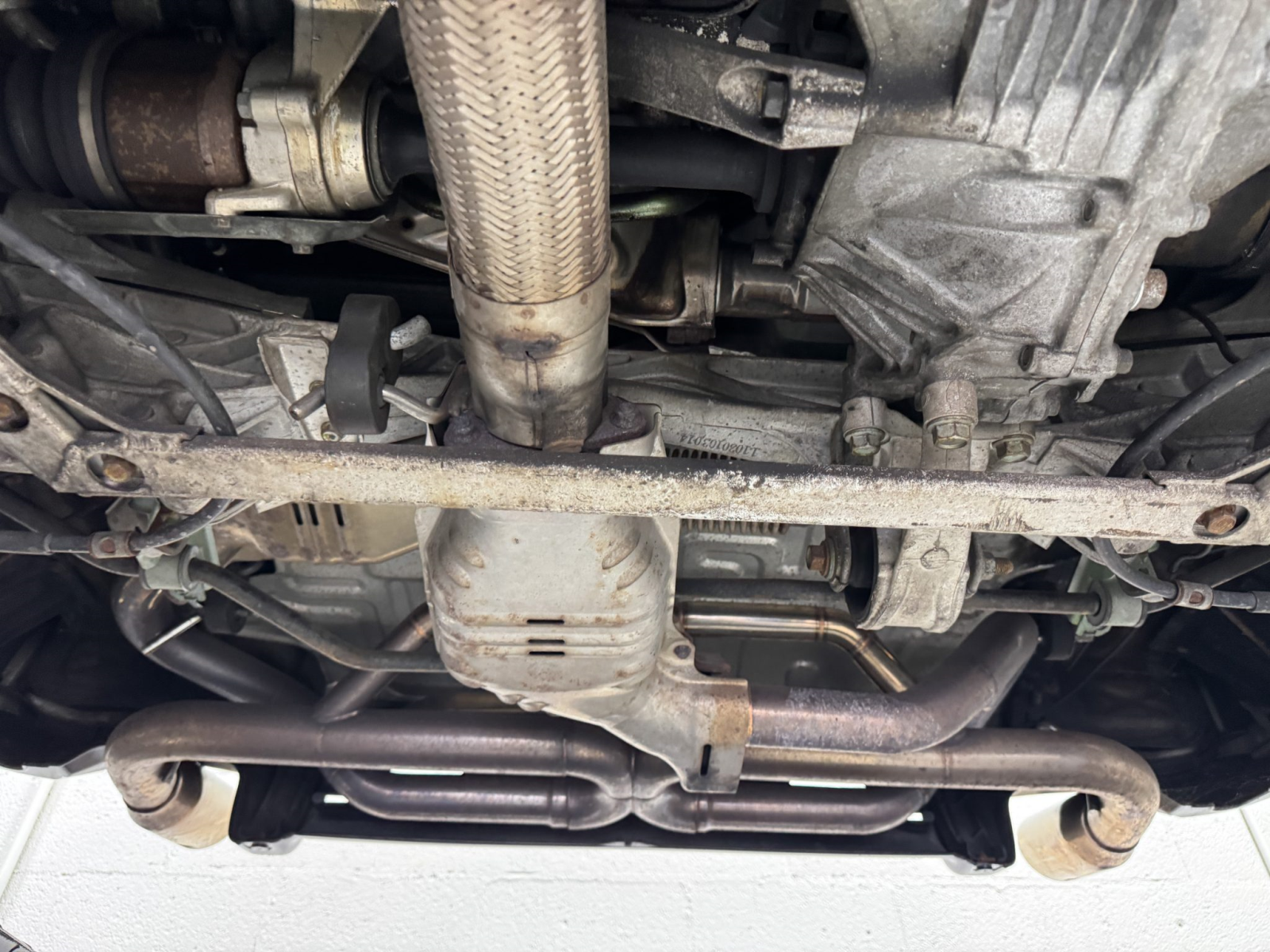 Power is routed to the rear wheels via a five-speed manual transaxle and a limited-slip differential. An aftermarket exhaust system has been fitted. A photo showing transaxle serial number J4A4-1001746 is provided in the gallery, indicating that the unit falls outside the snap ring failure range.