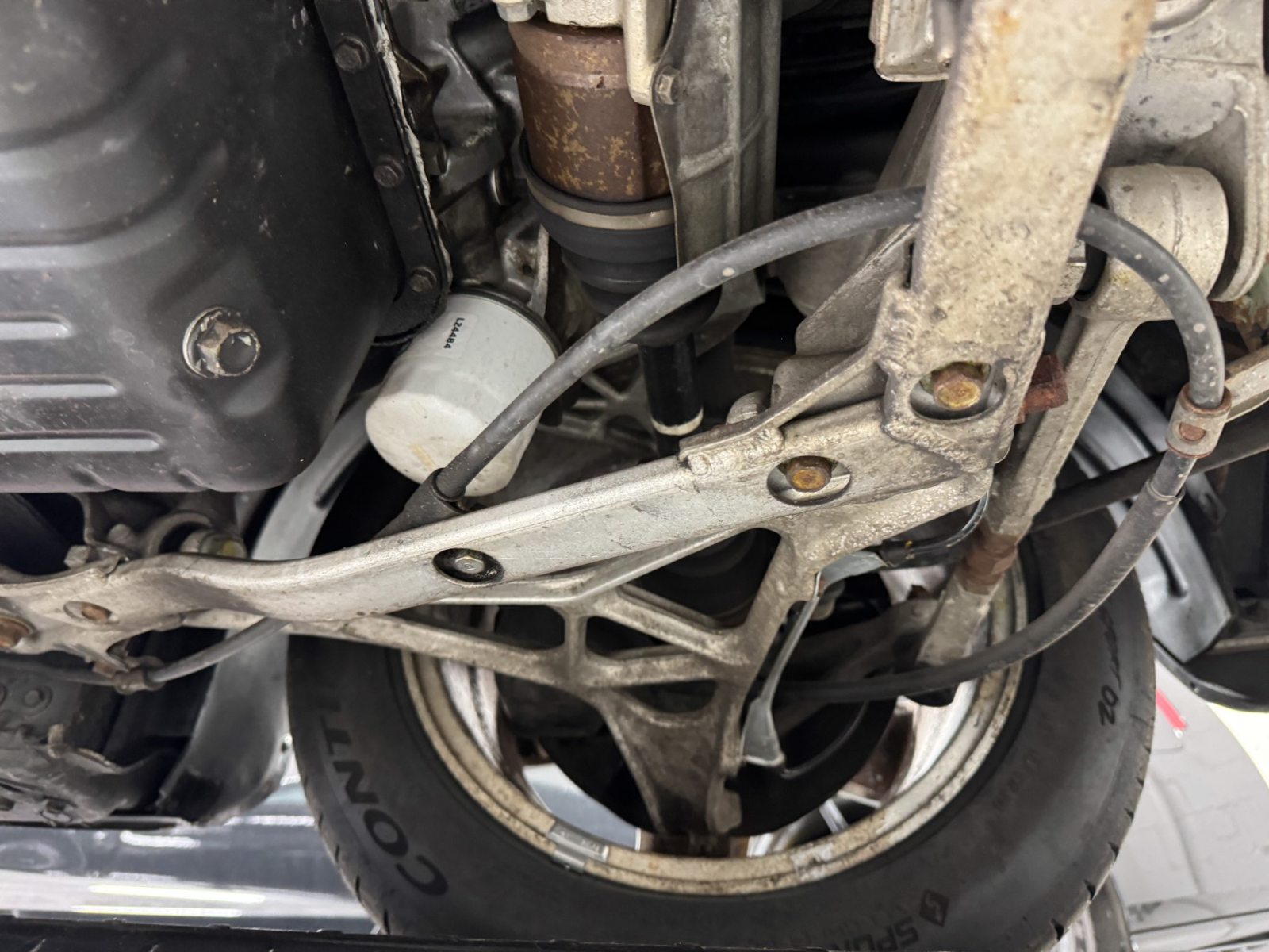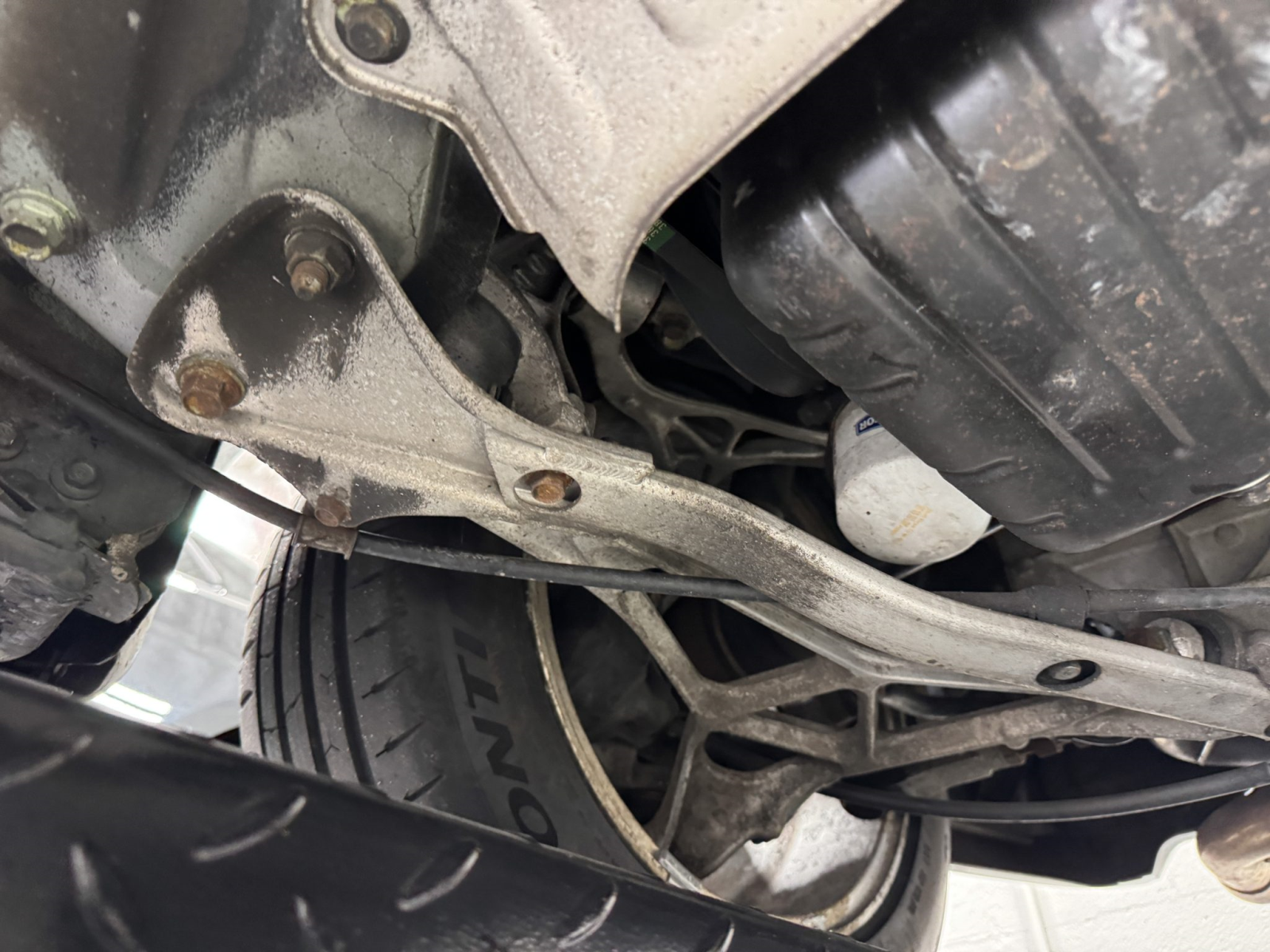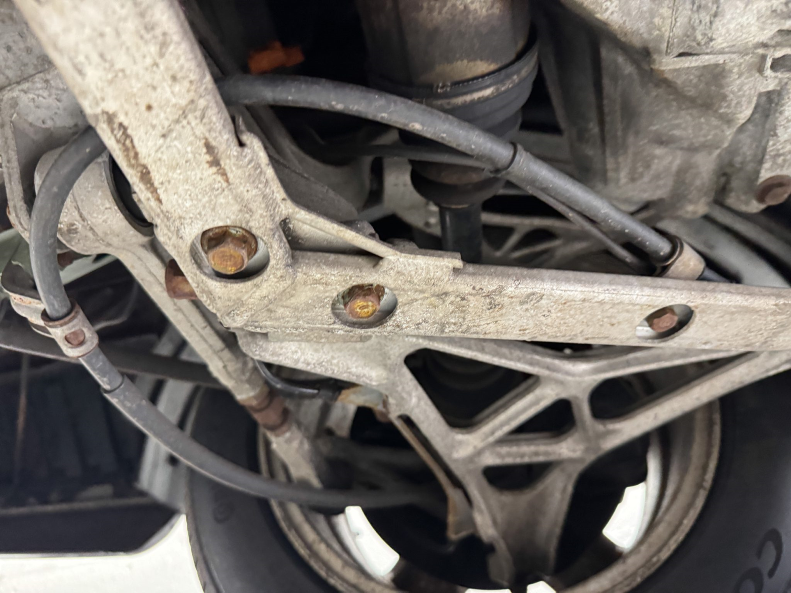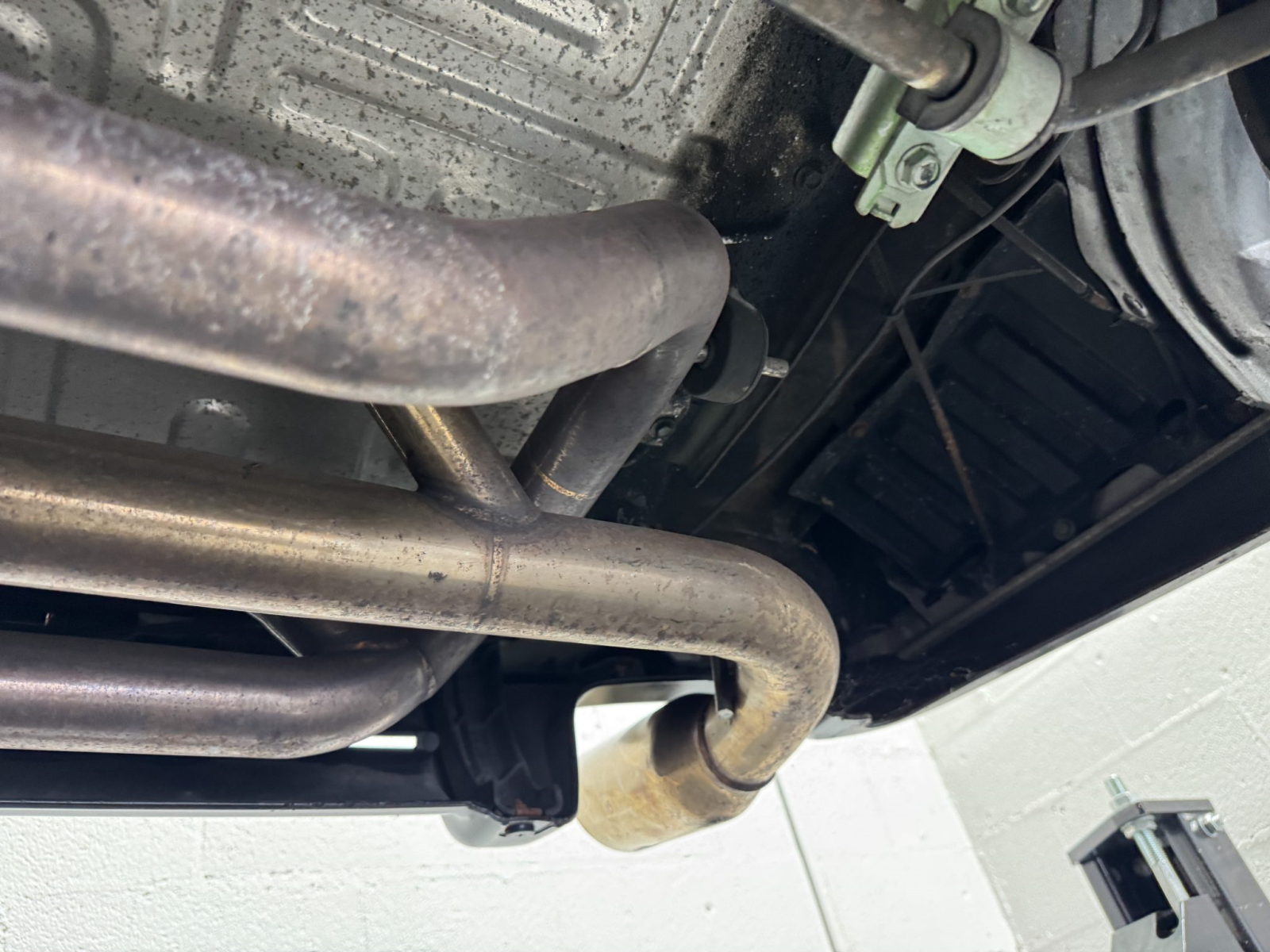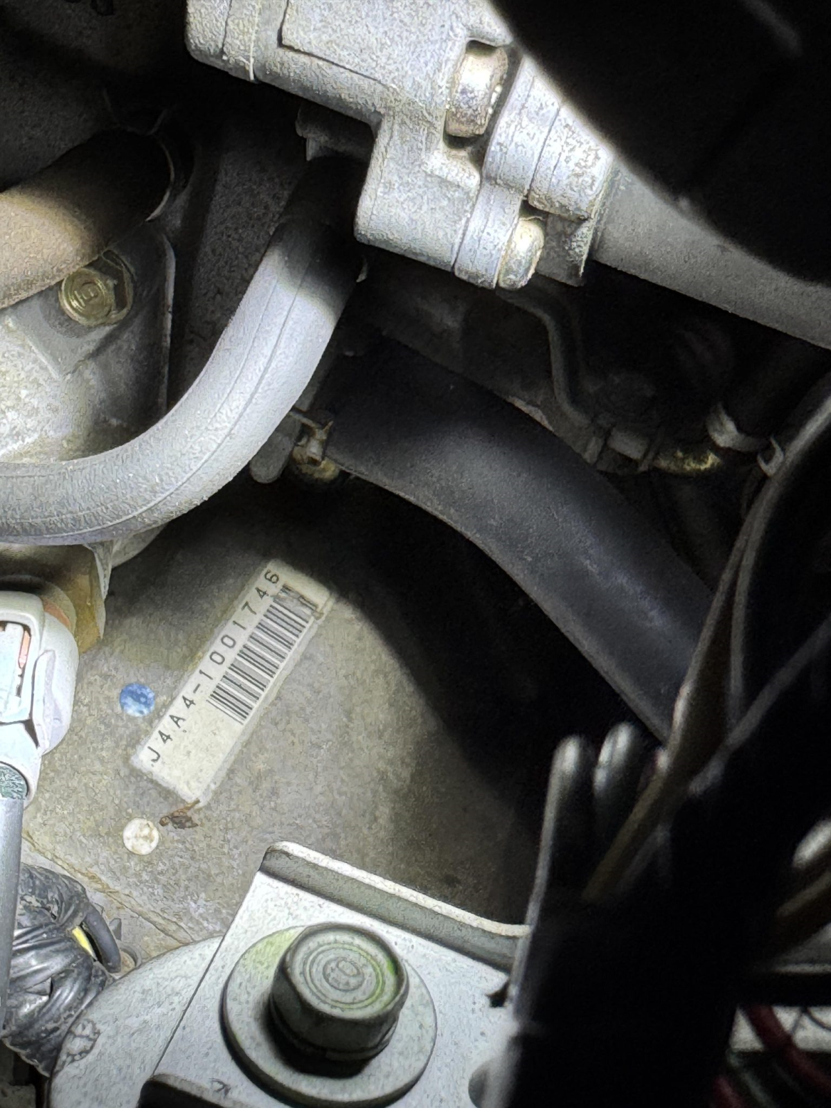 Power is routed to the rear wheels via a five-speed manual transaxle and a limited-slip differential. An aftermarket exhaust system has been fitted. A photo showing transaxle serial number J4A4-1001746 is provided in the gallery, indicating that the unit falls outside the snap ring failure range.