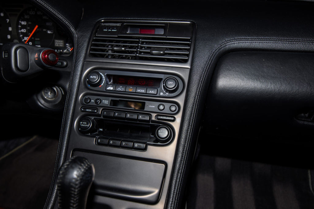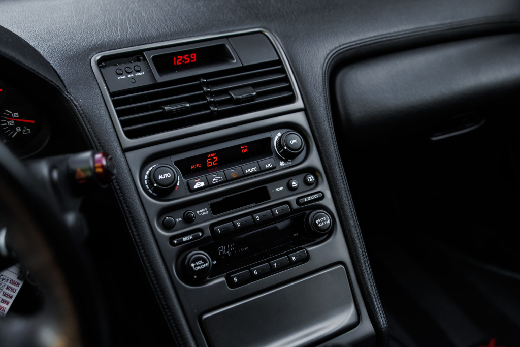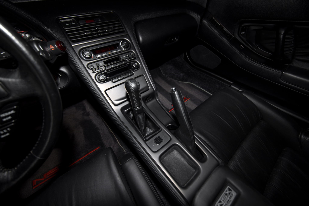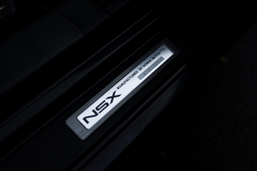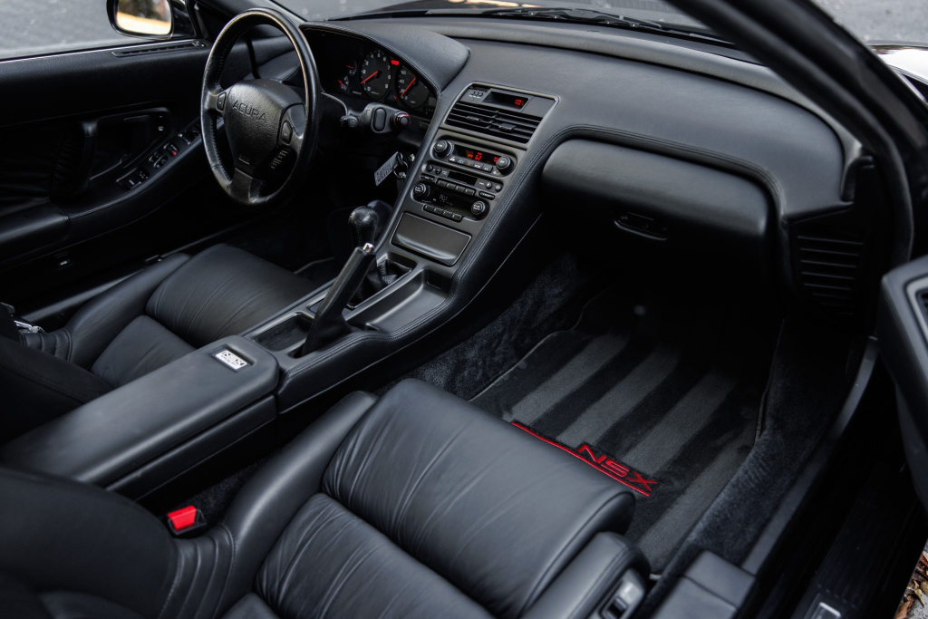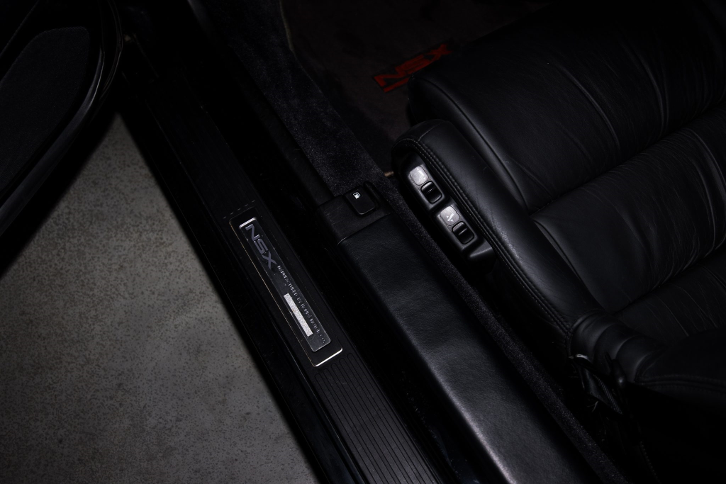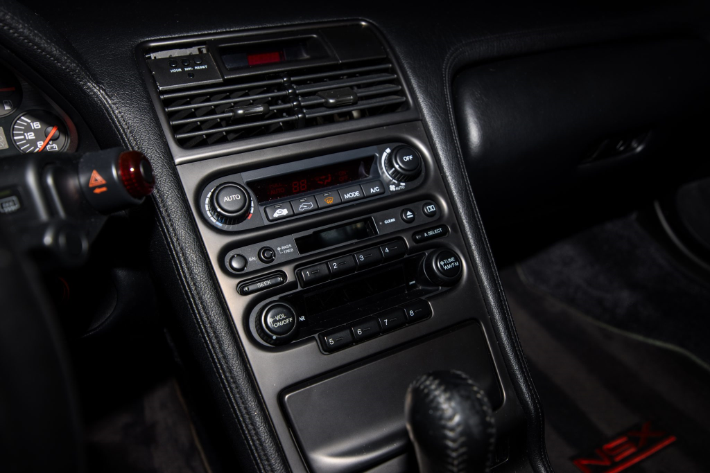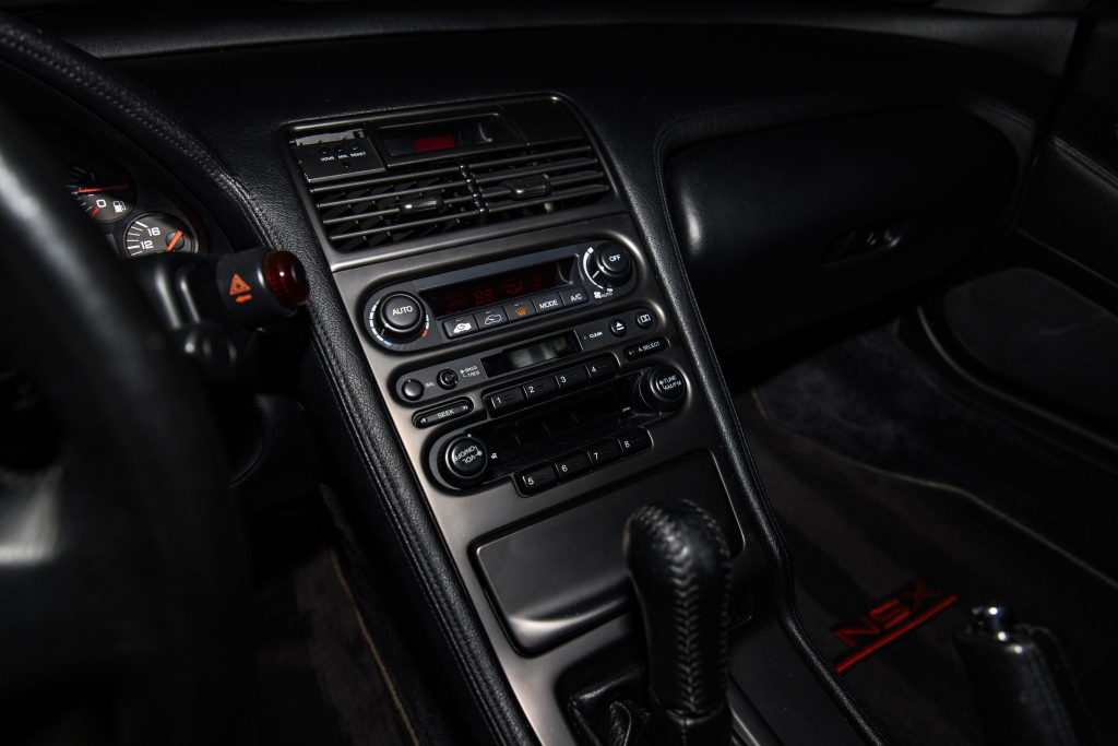 The power-adjustable sport seats are upholstered in black leather, while NSX-branded floor mats line the footwells. The stereo was modified by Willman’s Electronics in July 2021, and additional appointments include automatic climate control, cruise control, a CD changer, and a Bose sound system. The stainless-steel door sill plates are stamped with the car’s serial number. The air conditioning system has been converted to utilize R134a refrigerant, and the system was recharged in October 2025.