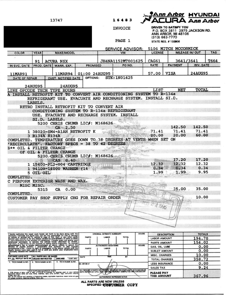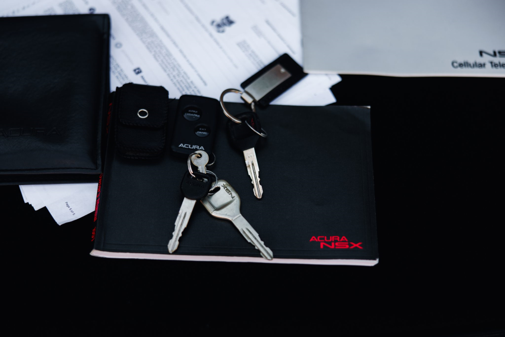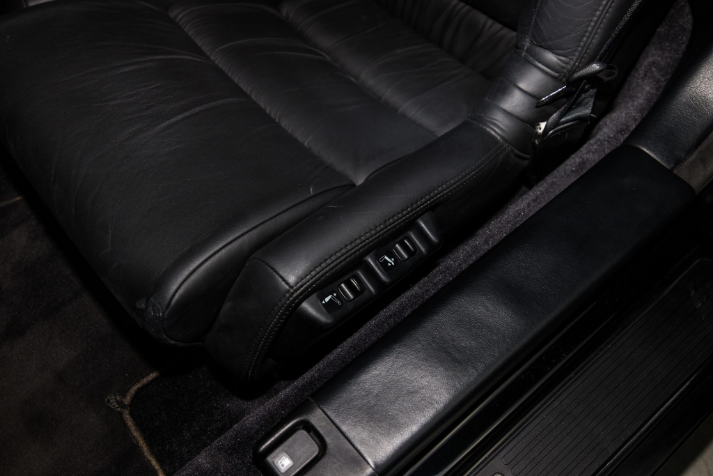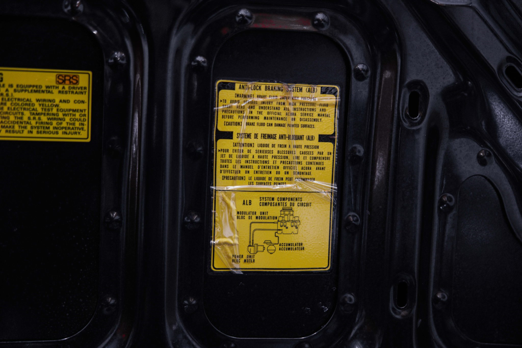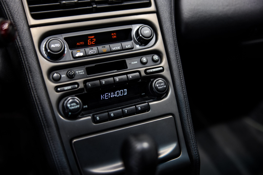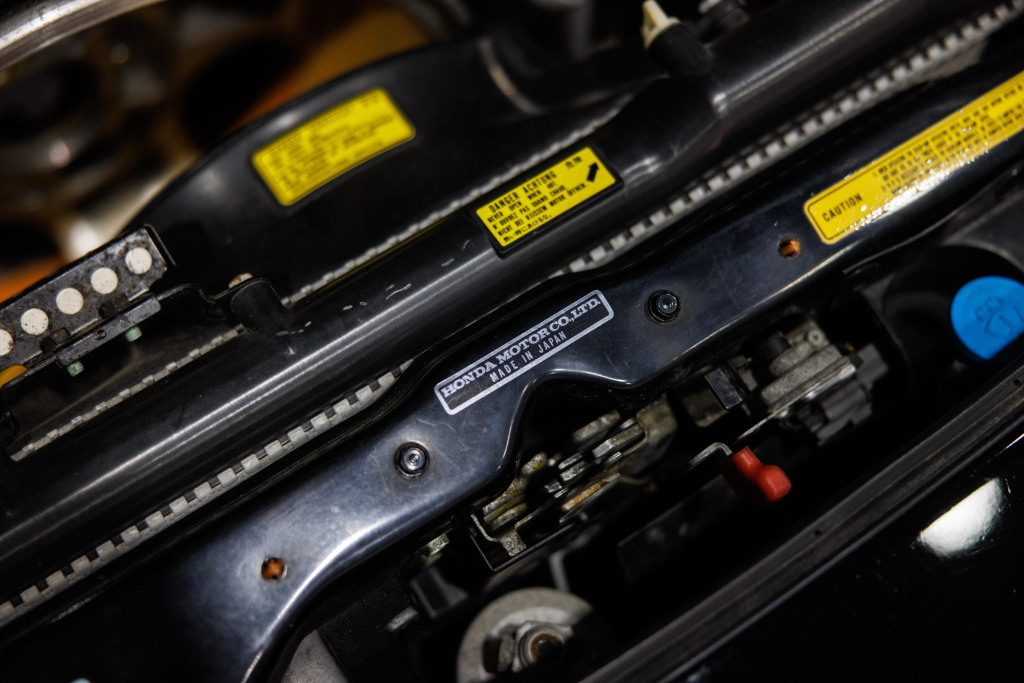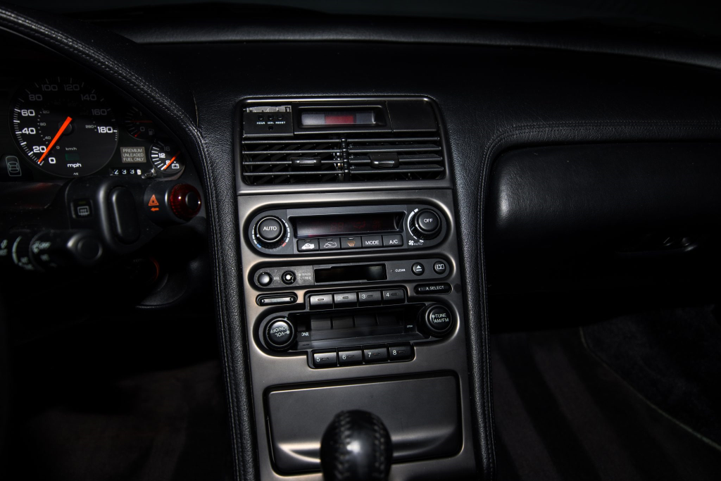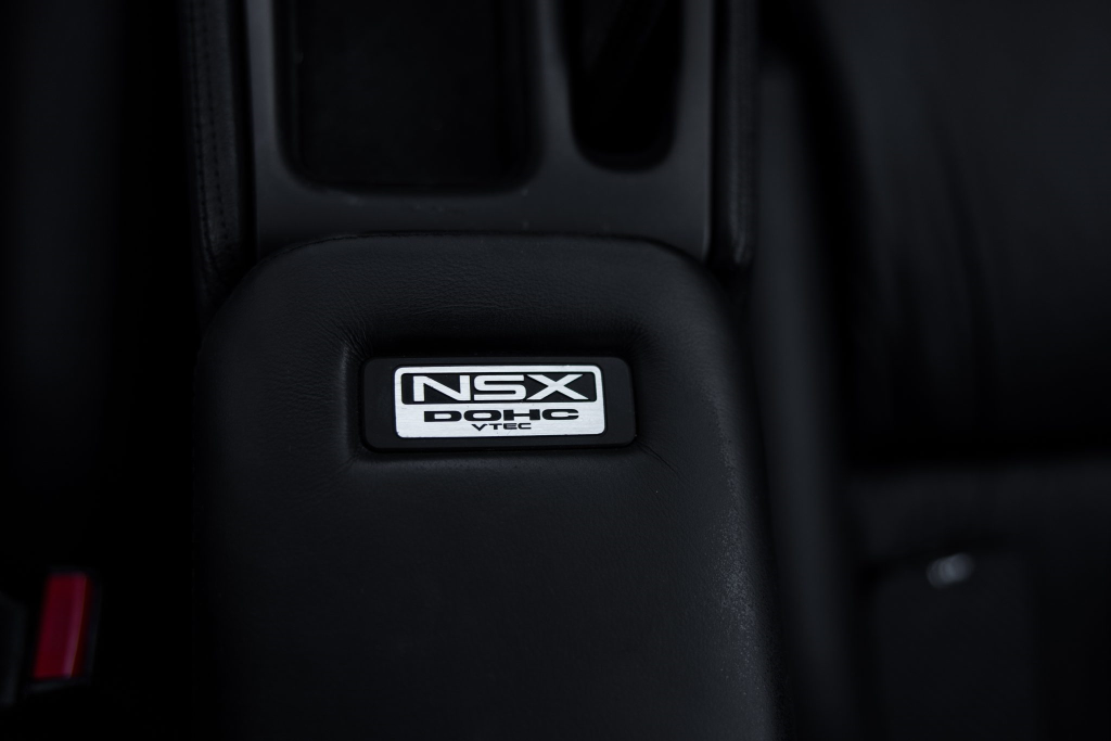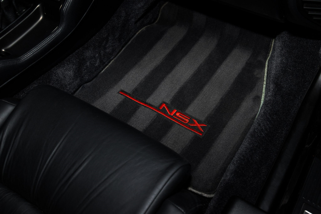 The power-adjustable sport seats are upholstered in black leather, while NSX-branded floor mats line the footwells. The stereo was modified by Willman’s Electronics in July 2021, and additional appointments include automatic climate control, cruise control, a CD changer, and a Bose sound system. The stainless-steel door sill plates are stamped with the car’s serial number. The air conditioning system has been converted to utilize R134a refrigerant, and the system was recharged in October 2025.