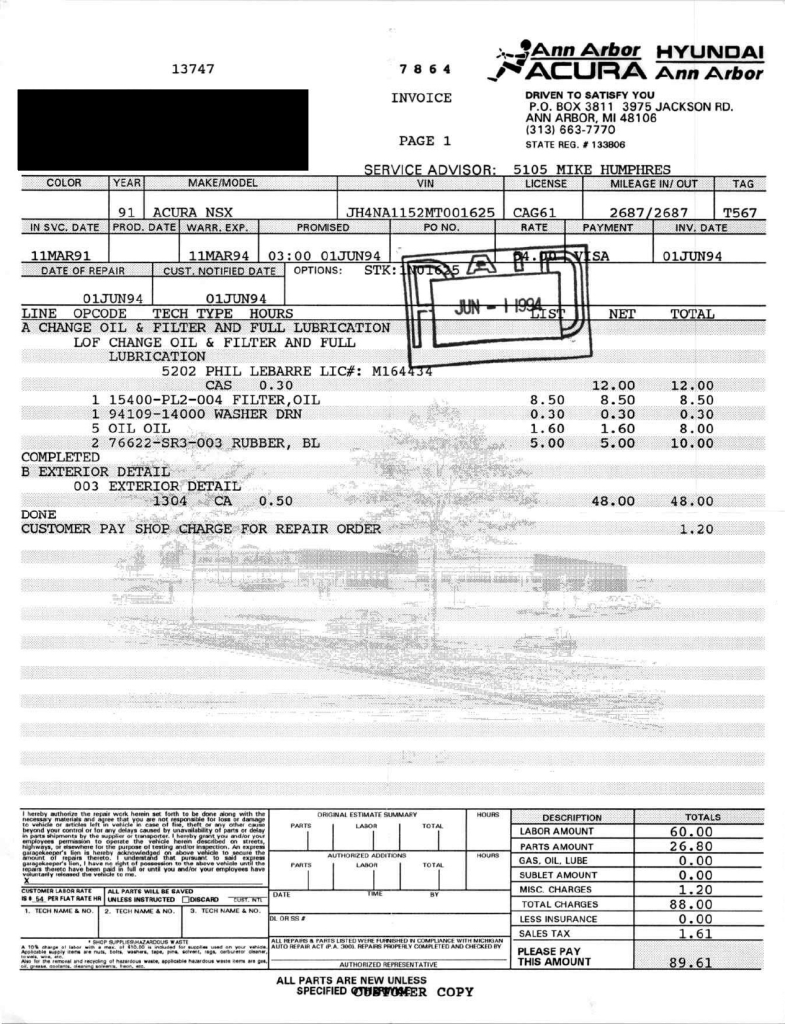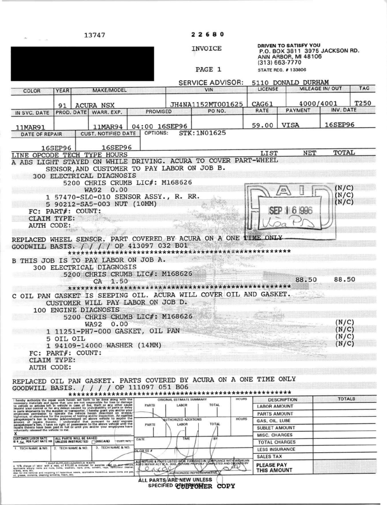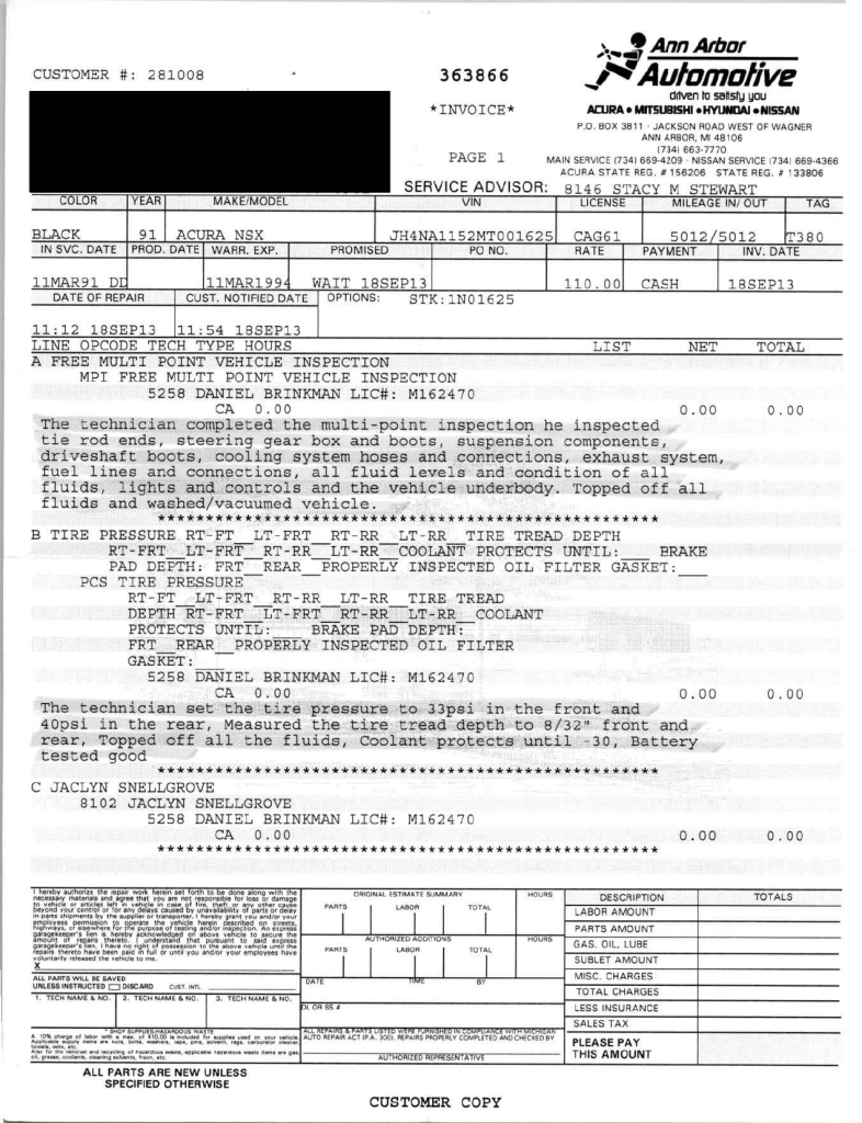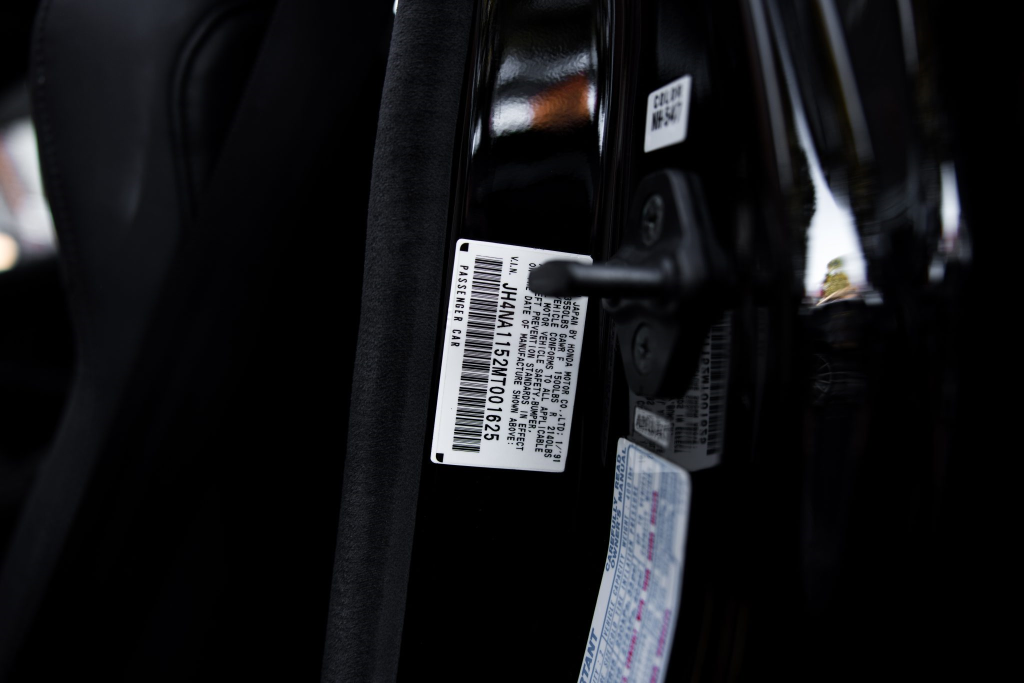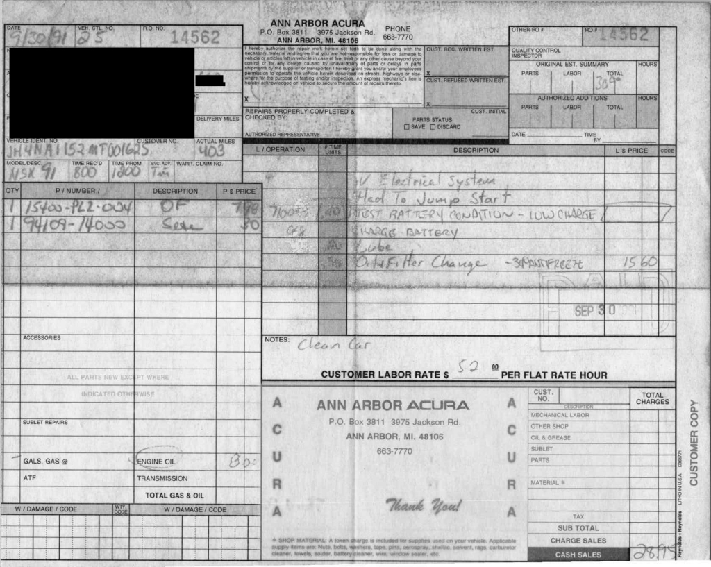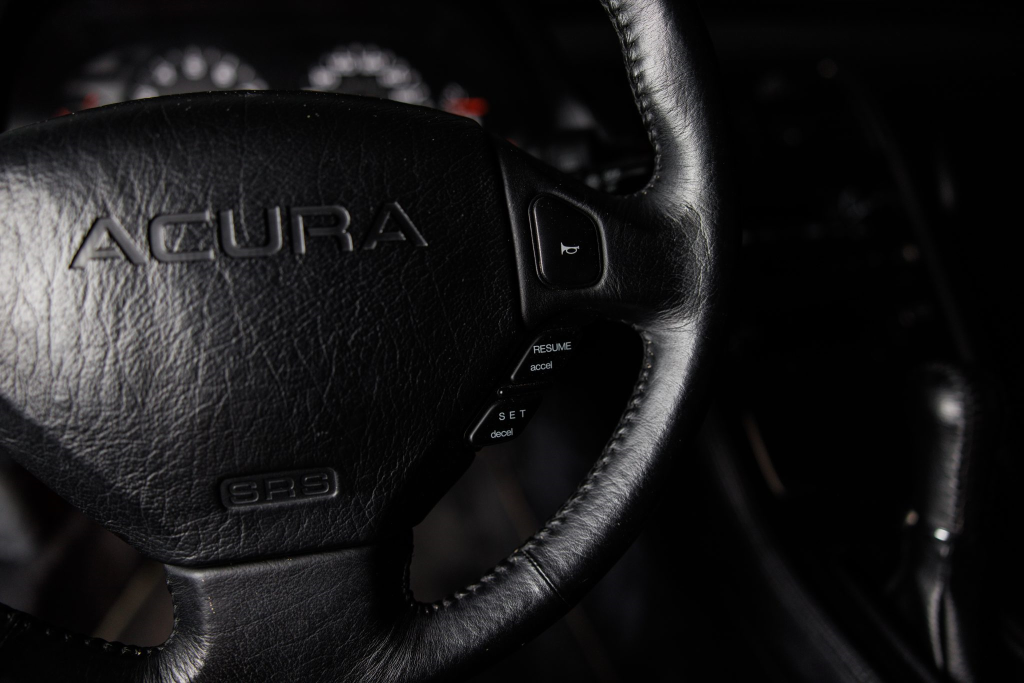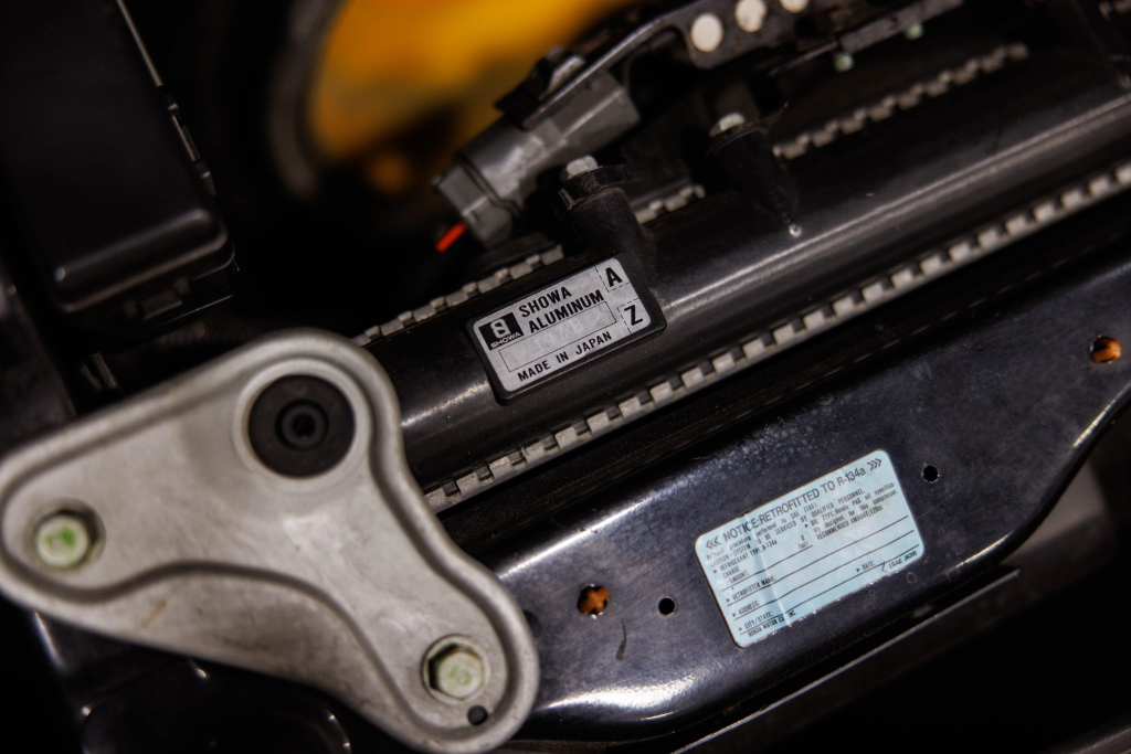 The power-adjustable sport seats are upholstered in black leather, while NSX-branded floor mats line the footwells. The stereo was modified by Willman’s Electronics in July 2021, and additional appointments include automatic climate control, cruise control, a CD changer, and a Bose sound system. The stainless-steel door sill plates are stamped with the car’s serial number. The air conditioning system has been converted to utilize R134a refrigerant, and the system was recharged in October 2025.