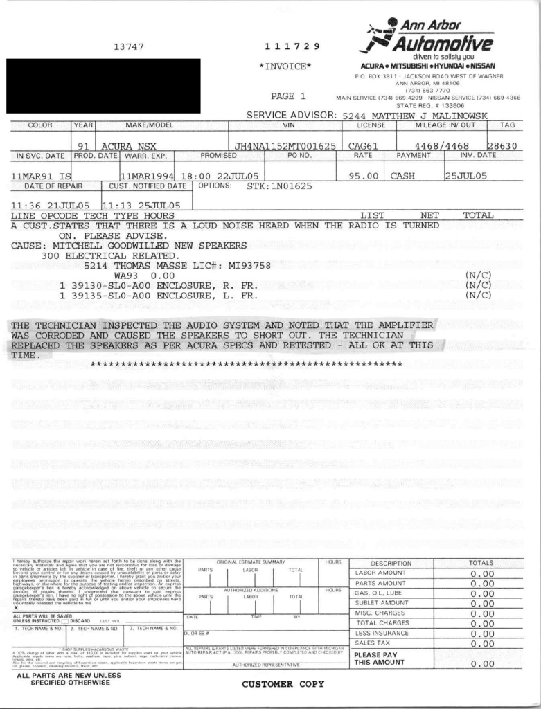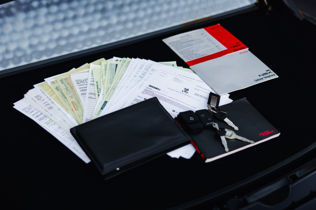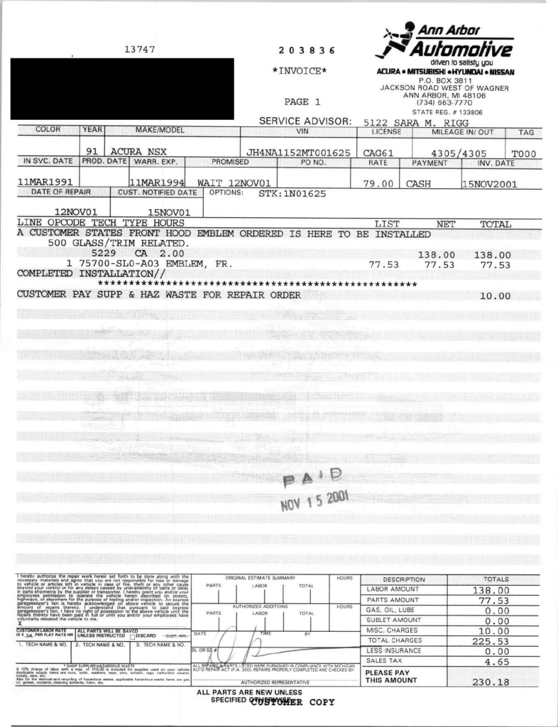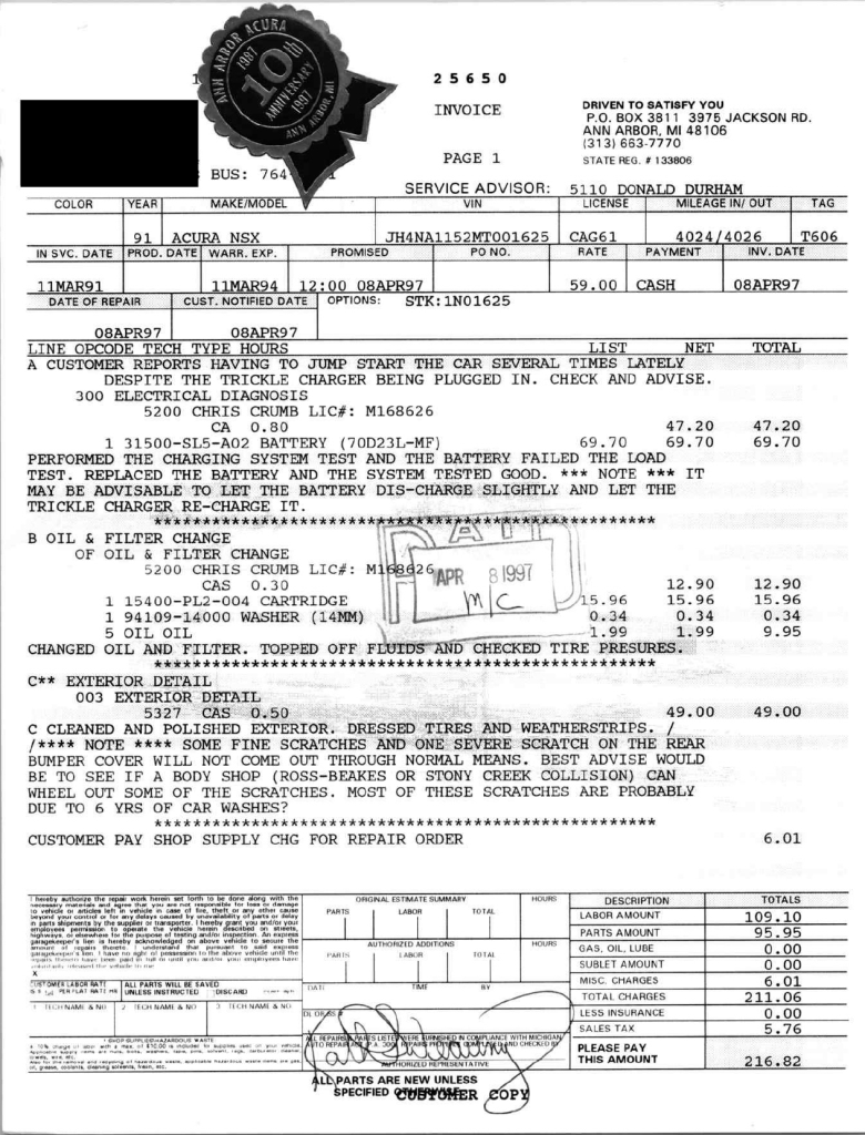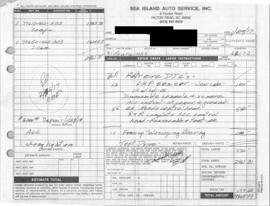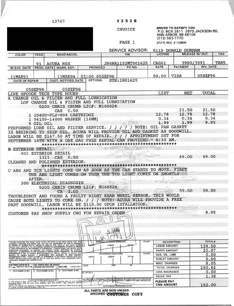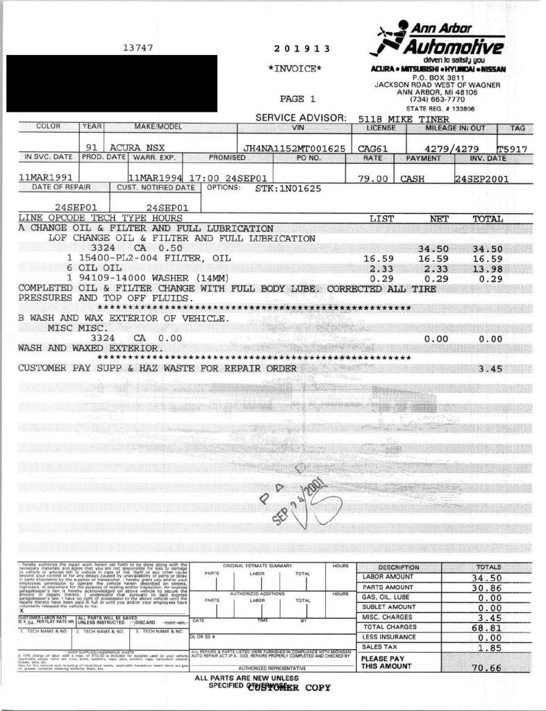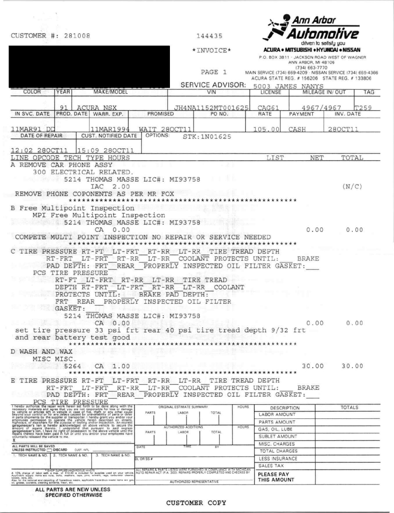The power-adjustable sport seats are upholstered in black leather, while NSX-branded floor mats line the footwells. The stereo was modified by Willman’s Electronics in July 2021, and additional appointments include automatic climate control, cruise control, a CD changer, and a Bose sound system. The stainless-steel door sill plates are stamped with the car’s serial number. The air conditioning system has been converted to utilize R134a refrigerant, and the system was recharged in October 2025.