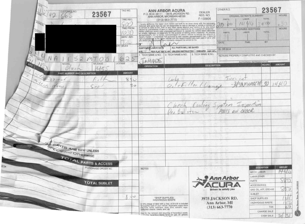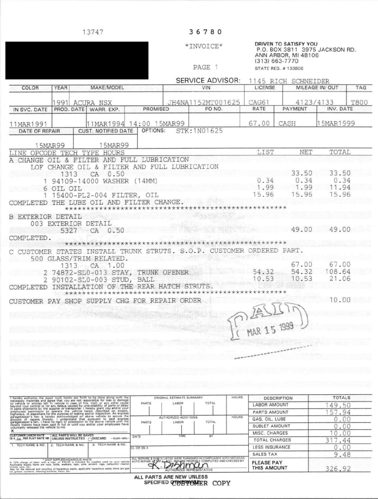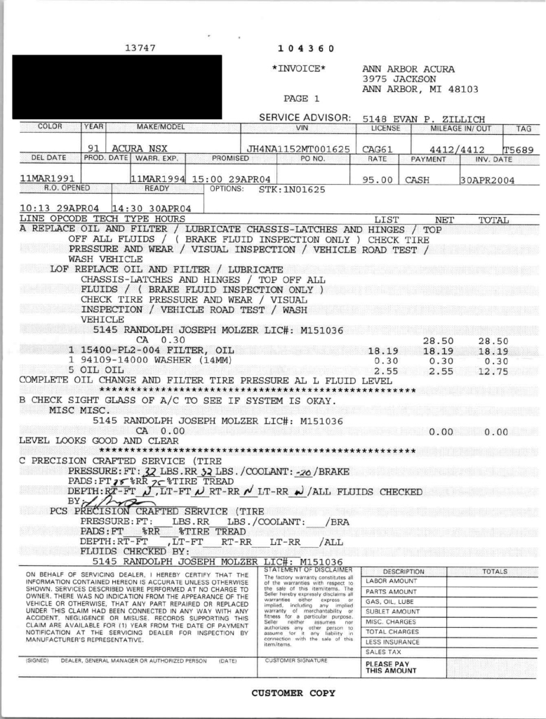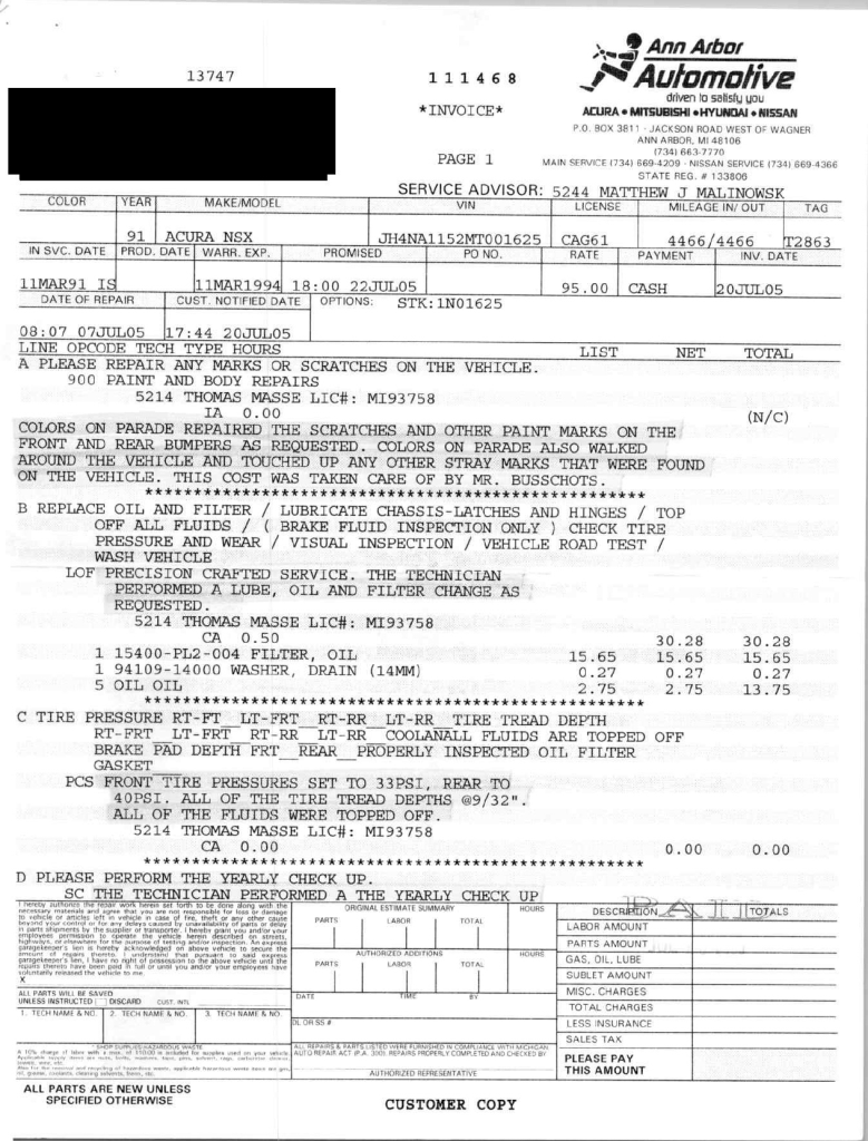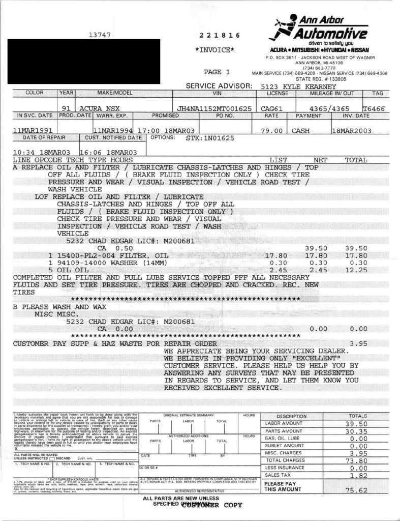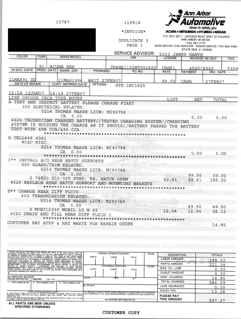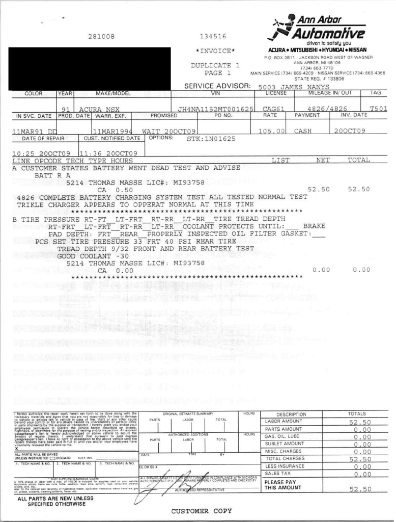The power-adjustable sport seats are upholstered in black leather, while NSX-branded floor mats line the footwells. The stereo was modified by Willman’s Electronics in July 2021, and additional appointments include automatic climate control, cruise control, a CD changer, and a Bose sound system. The stainless-steel door sill plates are stamped with the car’s serial number. The air conditioning system has been converted to utilize R134a refrigerant, and the system was recharged in October 2025.