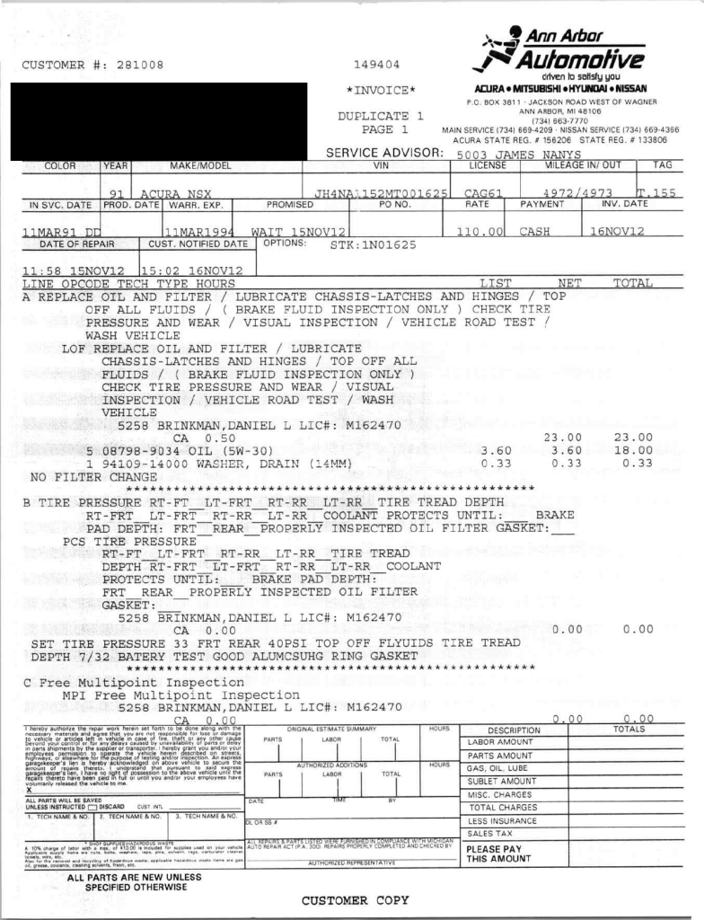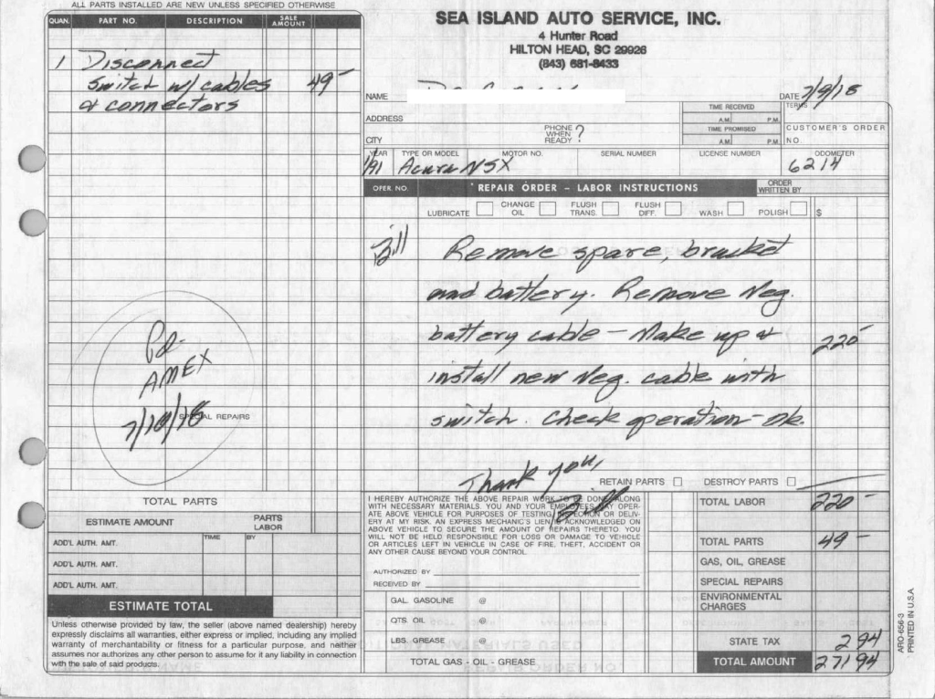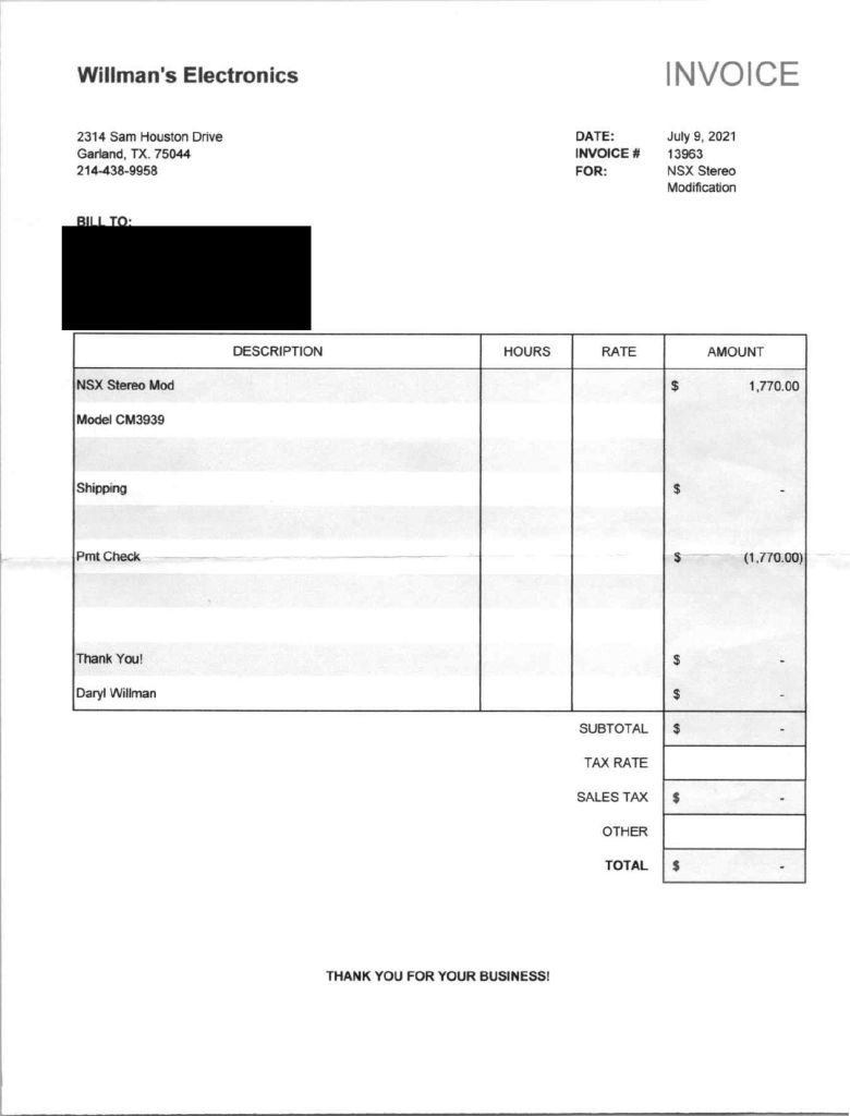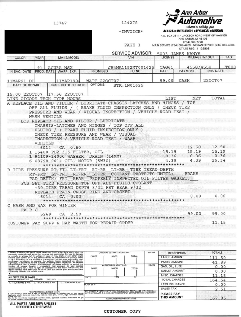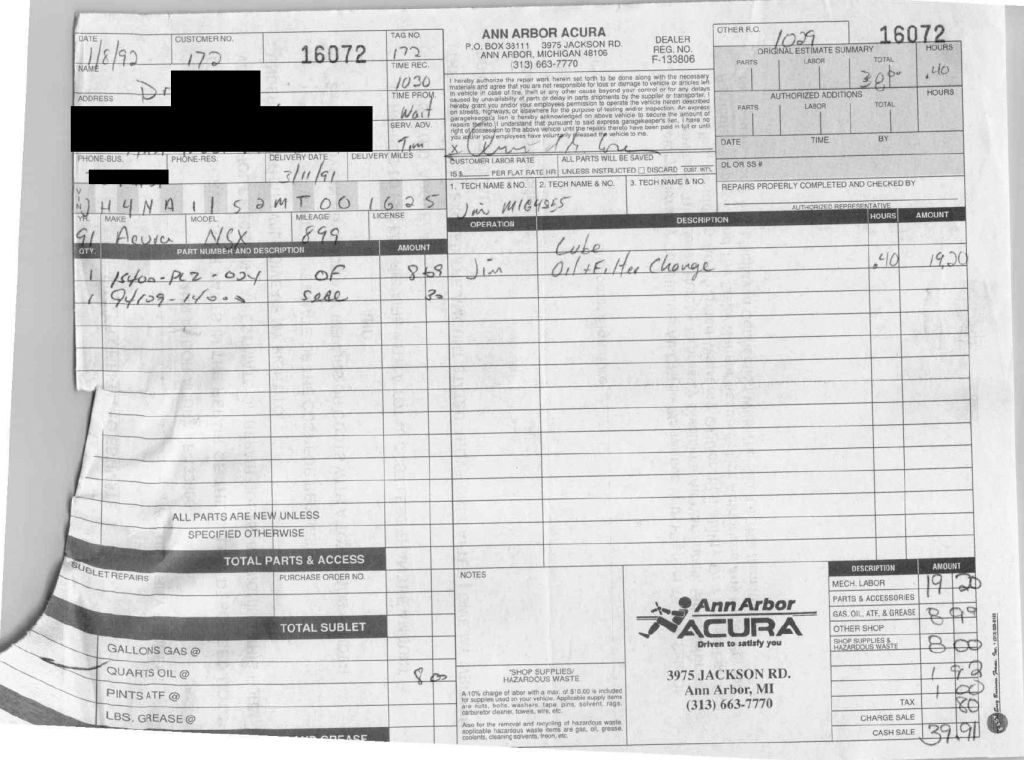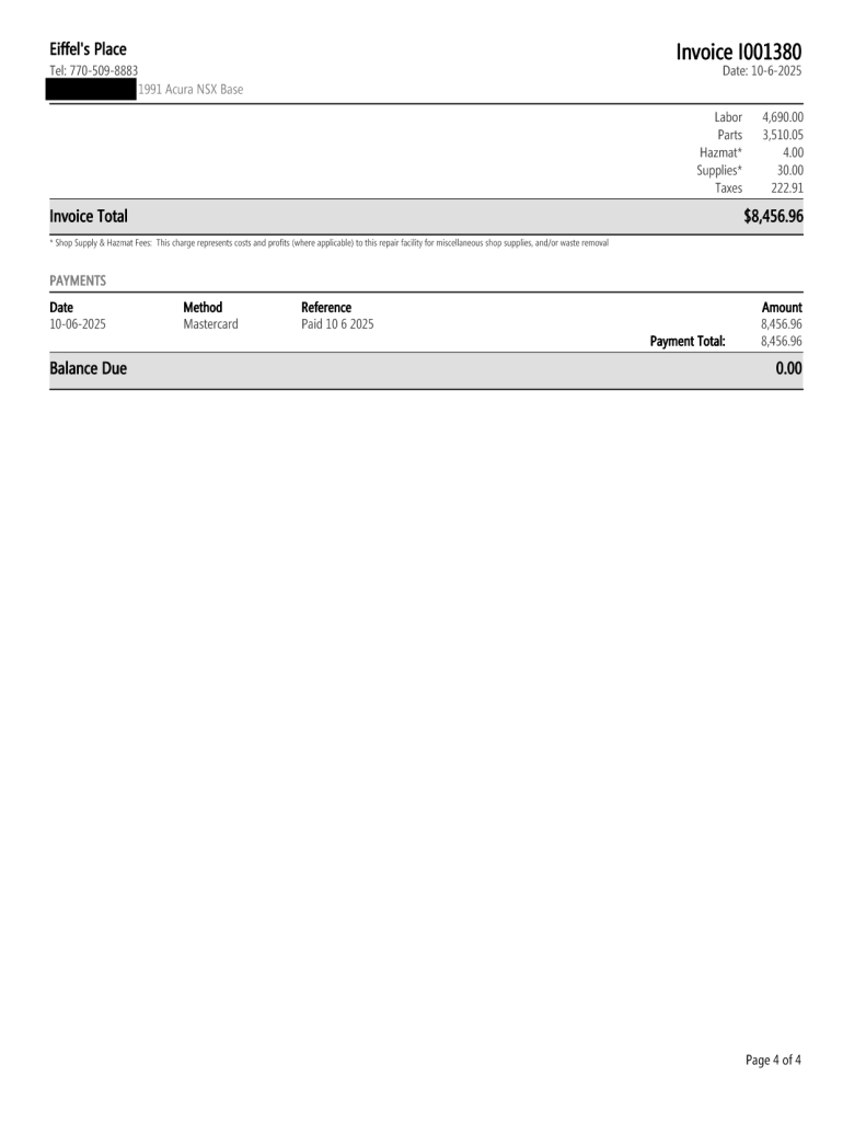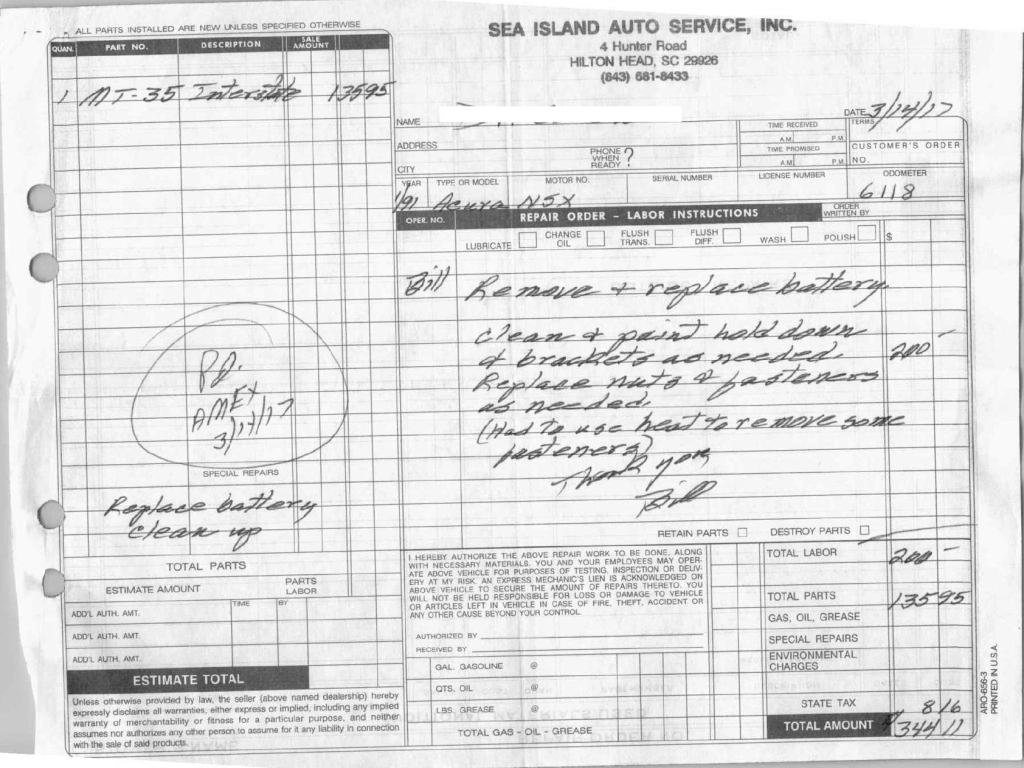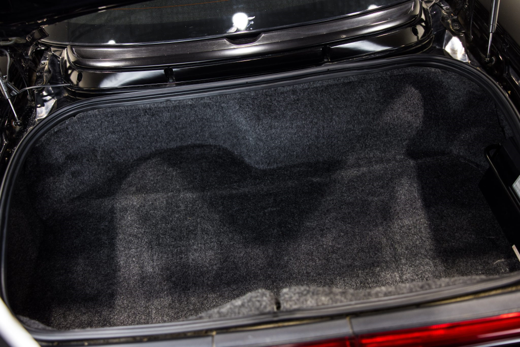 The power-adjustable sport seats are upholstered in black leather, while NSX-branded floor mats line the footwells. The stereo was modified by Willman’s Electronics in July 2021, and additional appointments include automatic climate control, cruise control, a CD changer, and a Bose sound system. The stainless-steel door sill plates are stamped with the car’s serial number. The air conditioning system has been converted to utilize R134a refrigerant, and the system was recharged in October 2025.