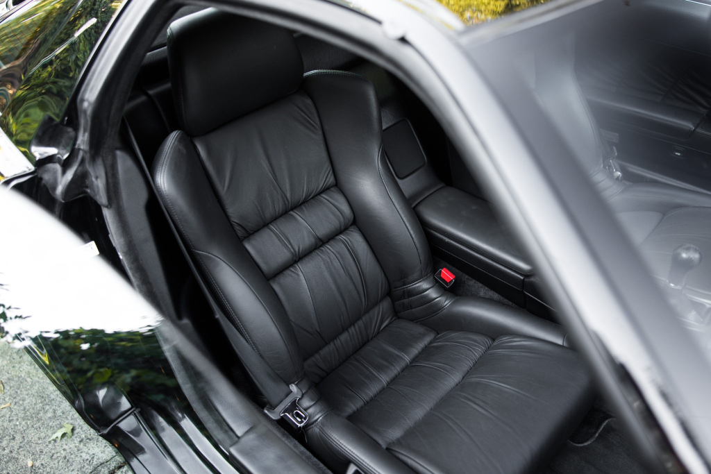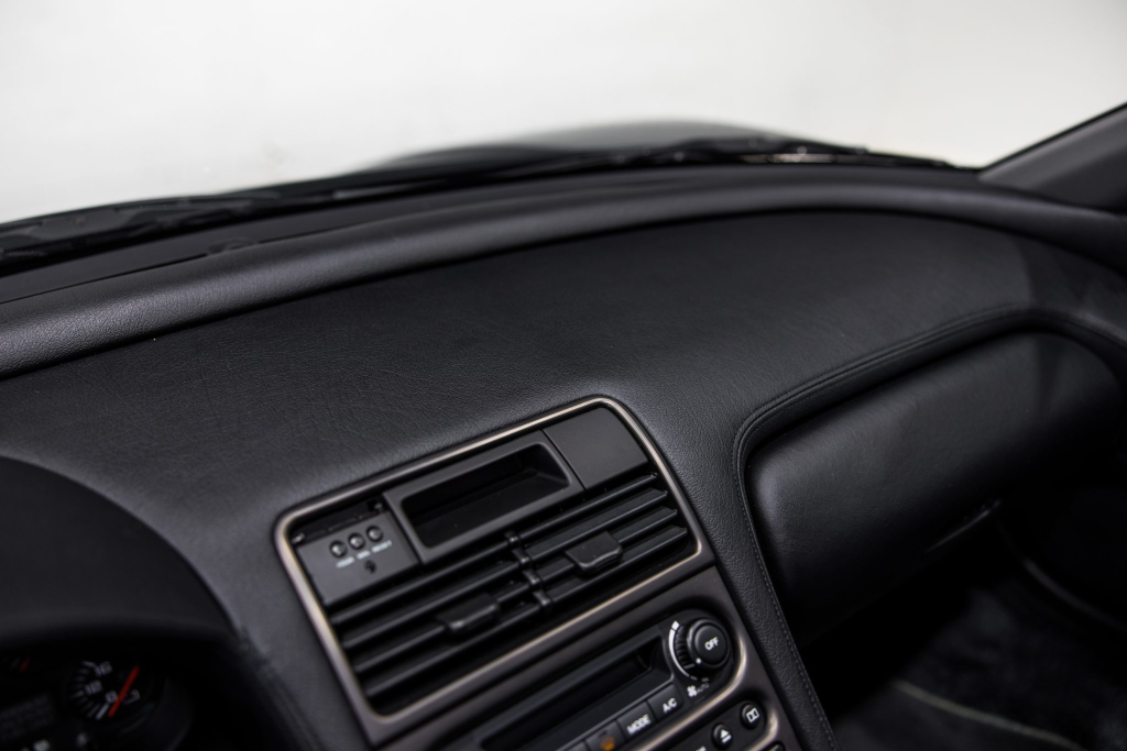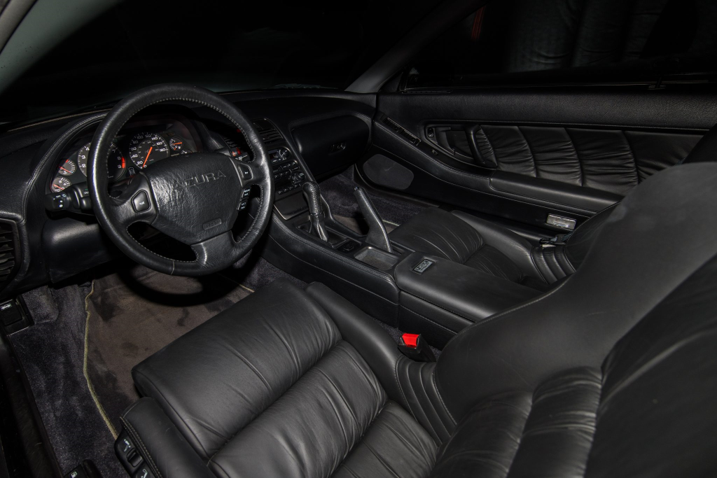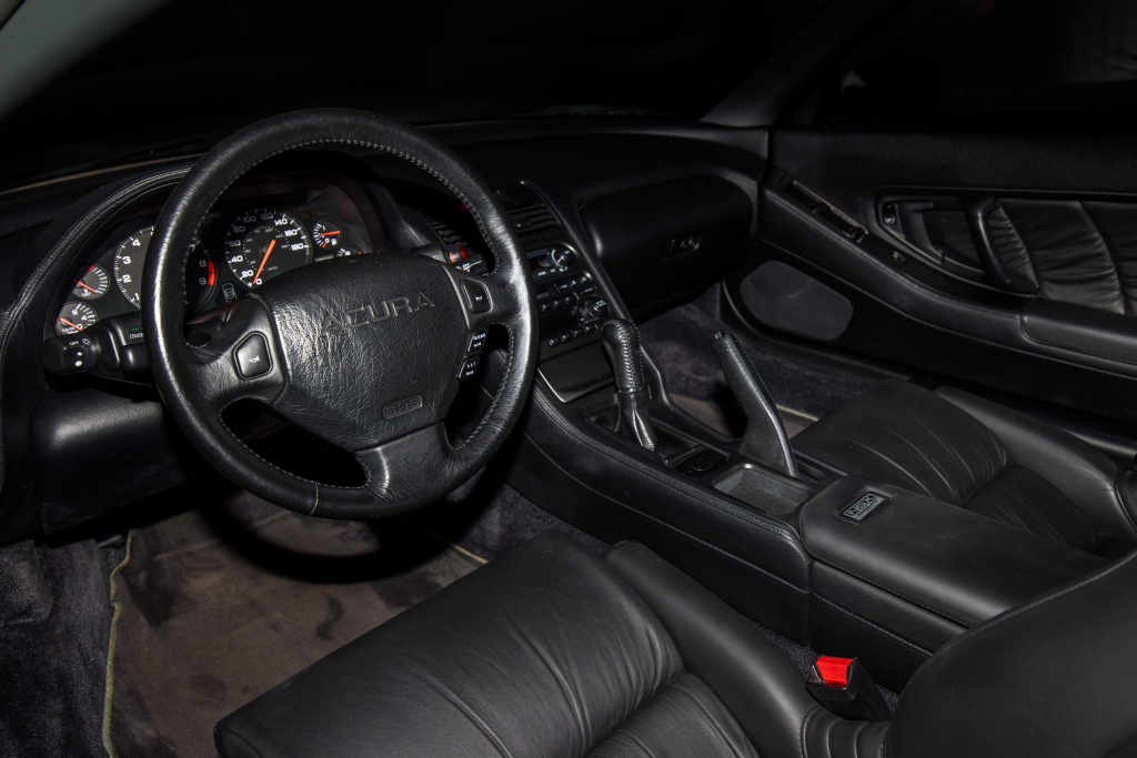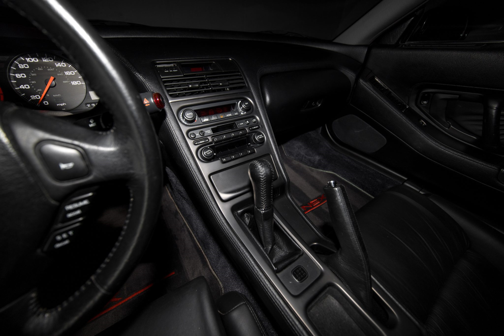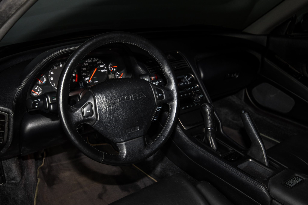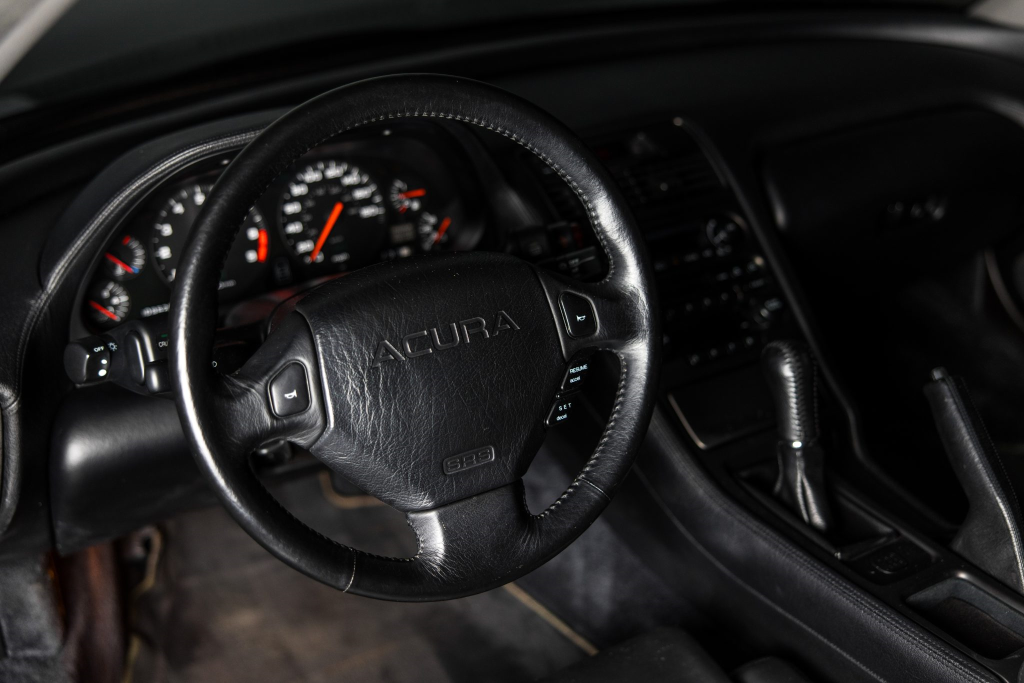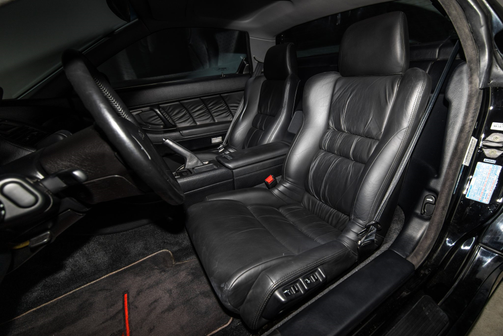 The NSX featured aluminum bodywork, and this example is finished in Berlina Black. Features include pop-up headlights, an integrated rear wing, side air intakes, power-adjustable side mirrors, and dual exhaust outlets. The front bumper cover has scratches, and paint chips are located on the front end and mirror caps. The front lower spoiler, rear trunk hinge stopper, front hood prop rod holder, right window regulator, rear glass hatch struts, and driver’s door seal were replaced in preparation for the sale.