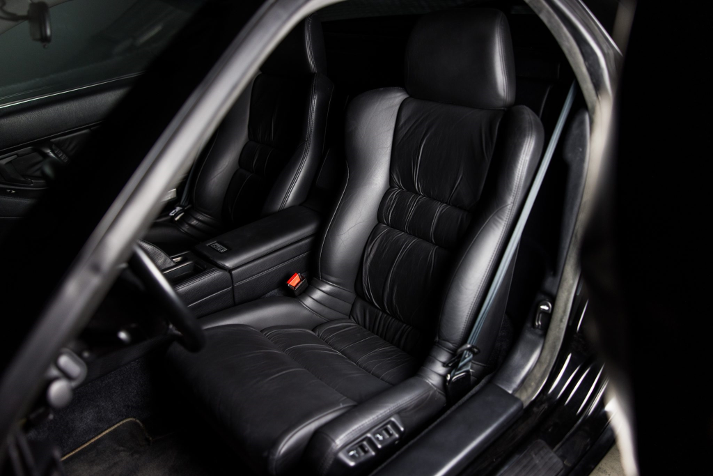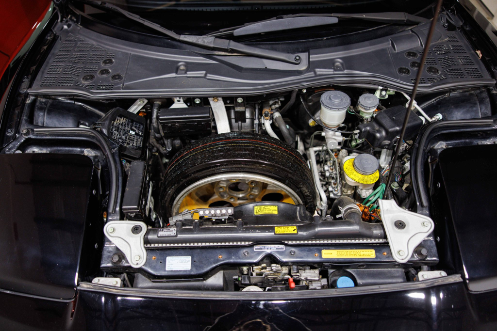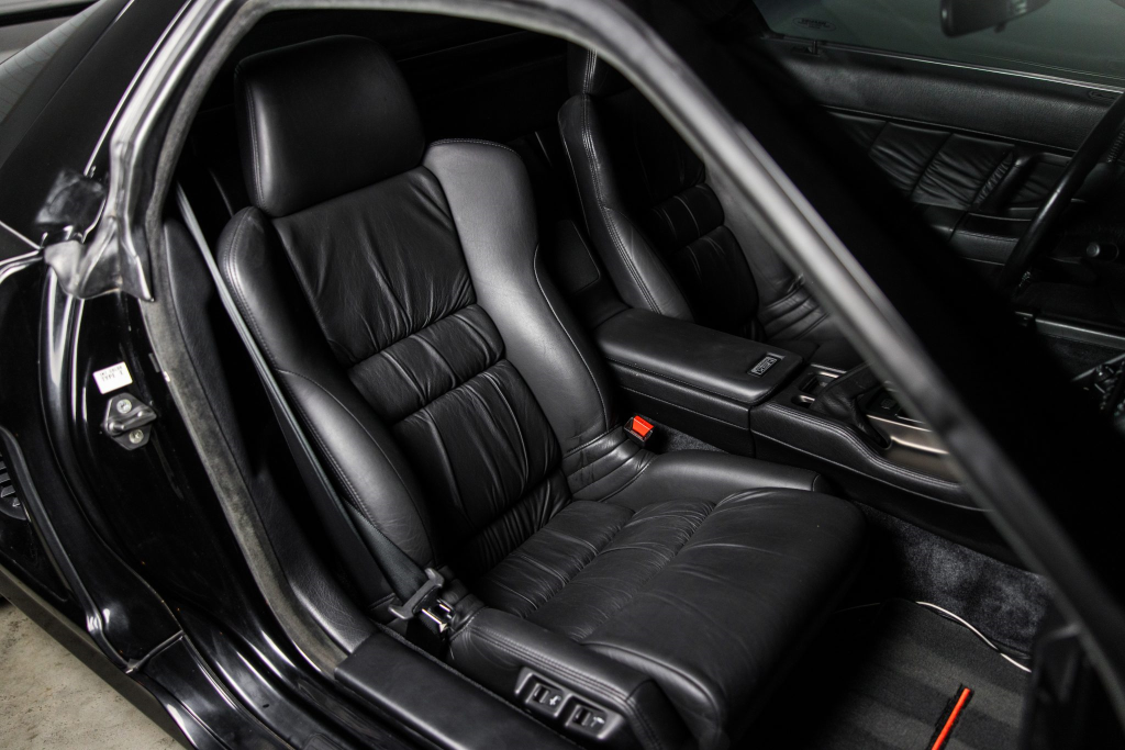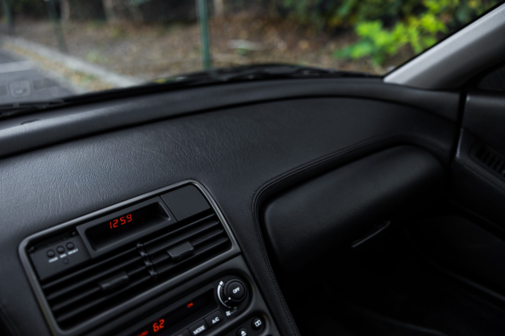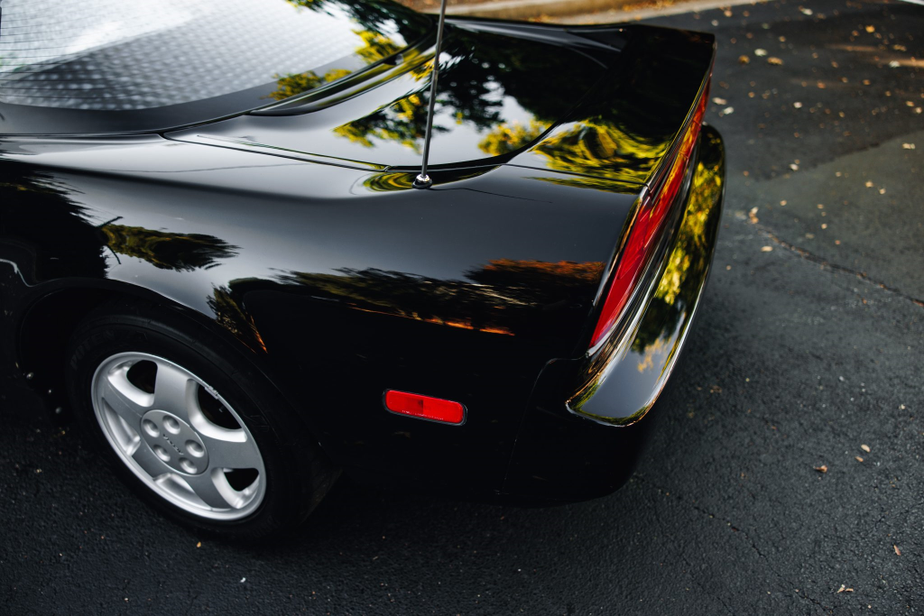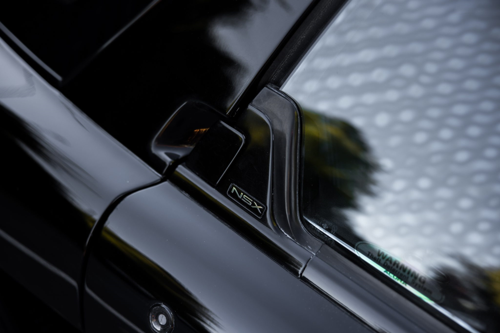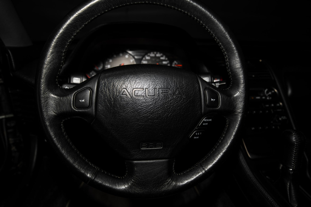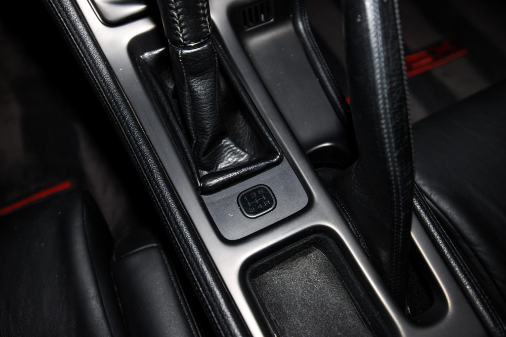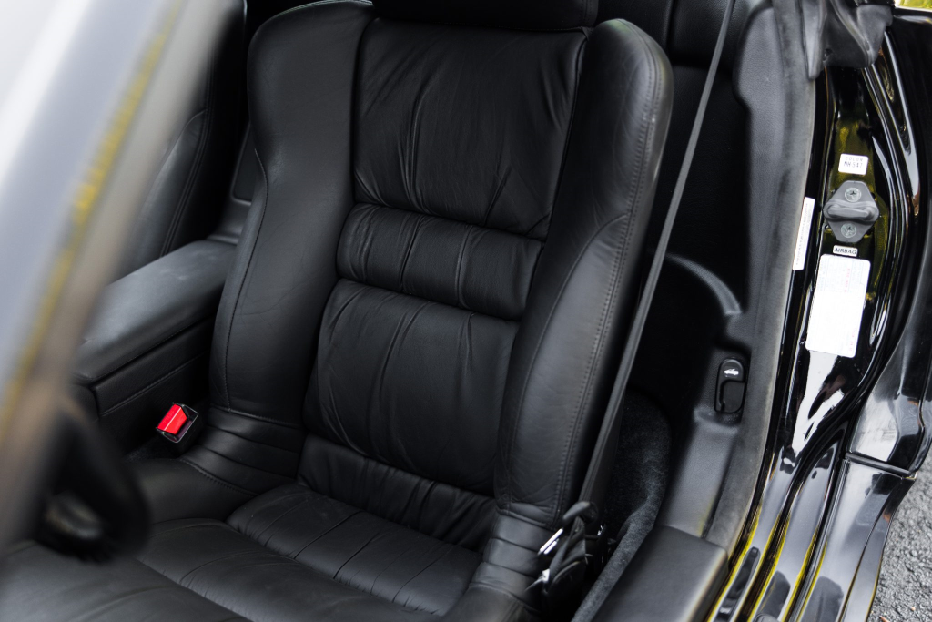 The NSX featured aluminum bodywork, and this example is finished in Berlina Black. Features include pop-up headlights, an integrated rear wing, side air intakes, power-adjustable side mirrors, and dual exhaust outlets. The front bumper cover has scratches, and paint chips are located on the front end and mirror caps. The front lower spoiler, rear trunk hinge stopper, front hood prop rod holder, right window regulator, rear glass hatch struts, and driver’s door seal were replaced in preparation for the sale.