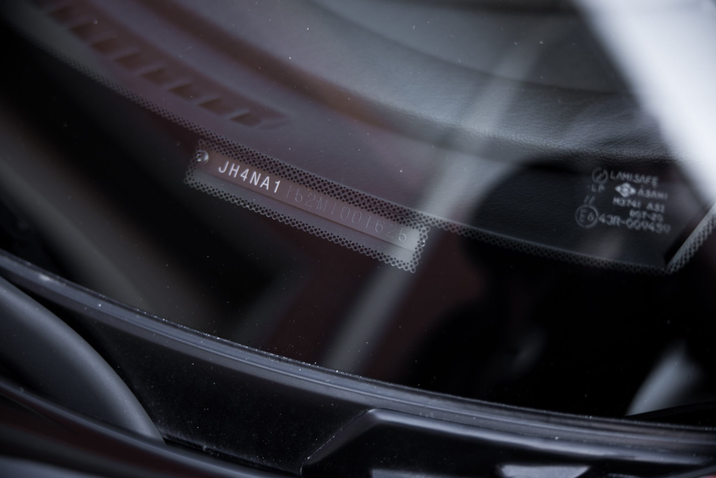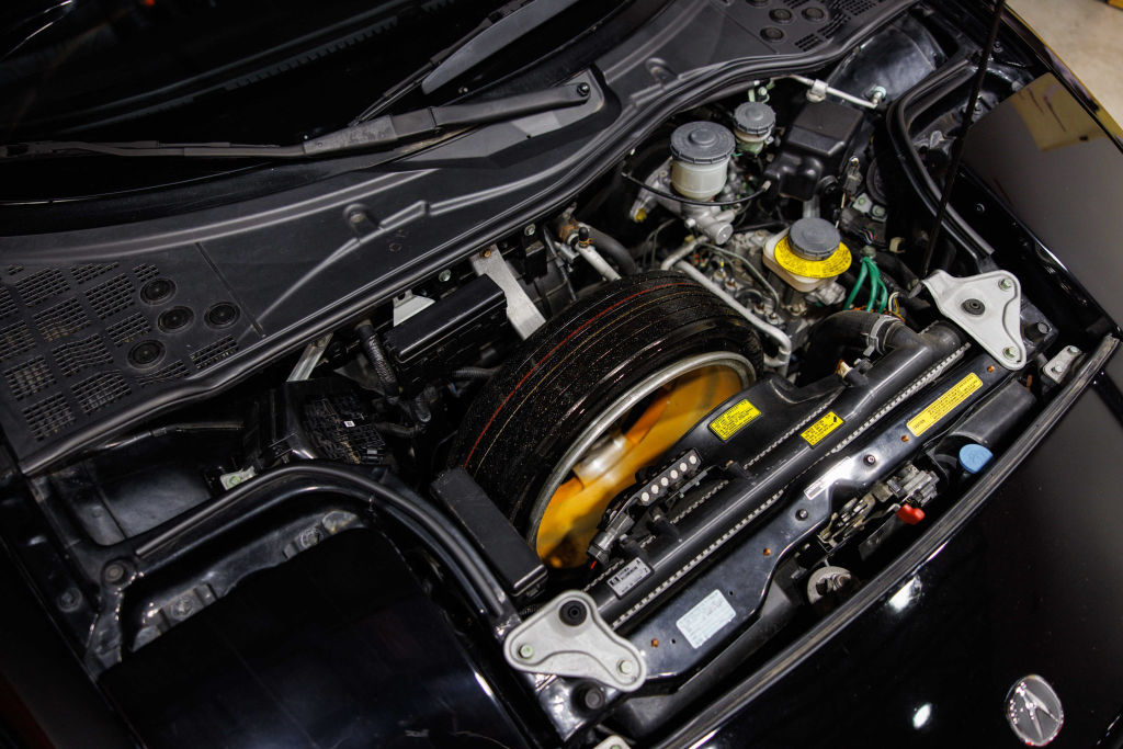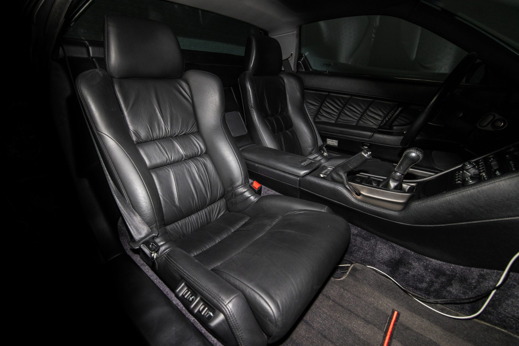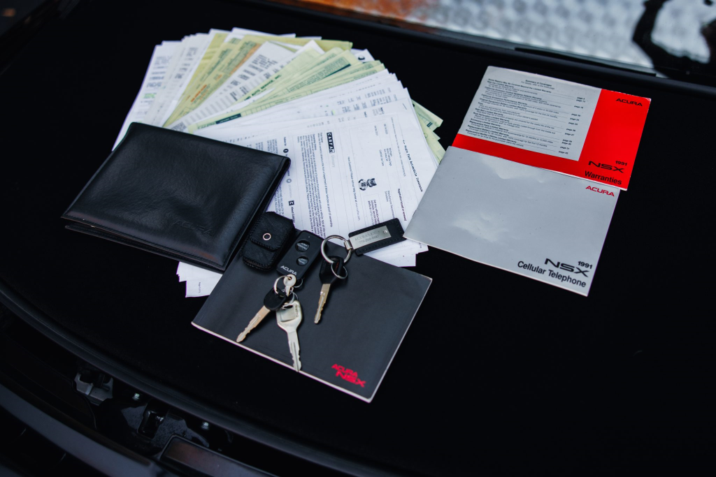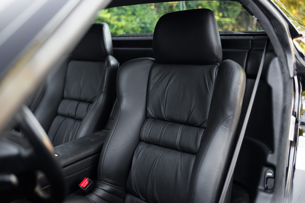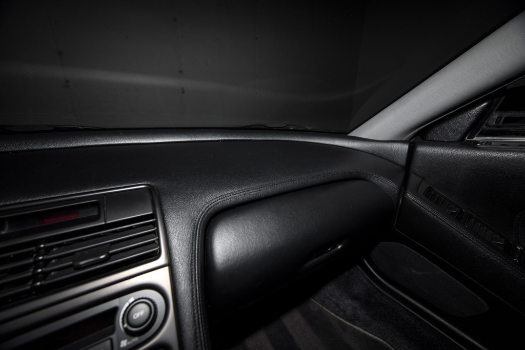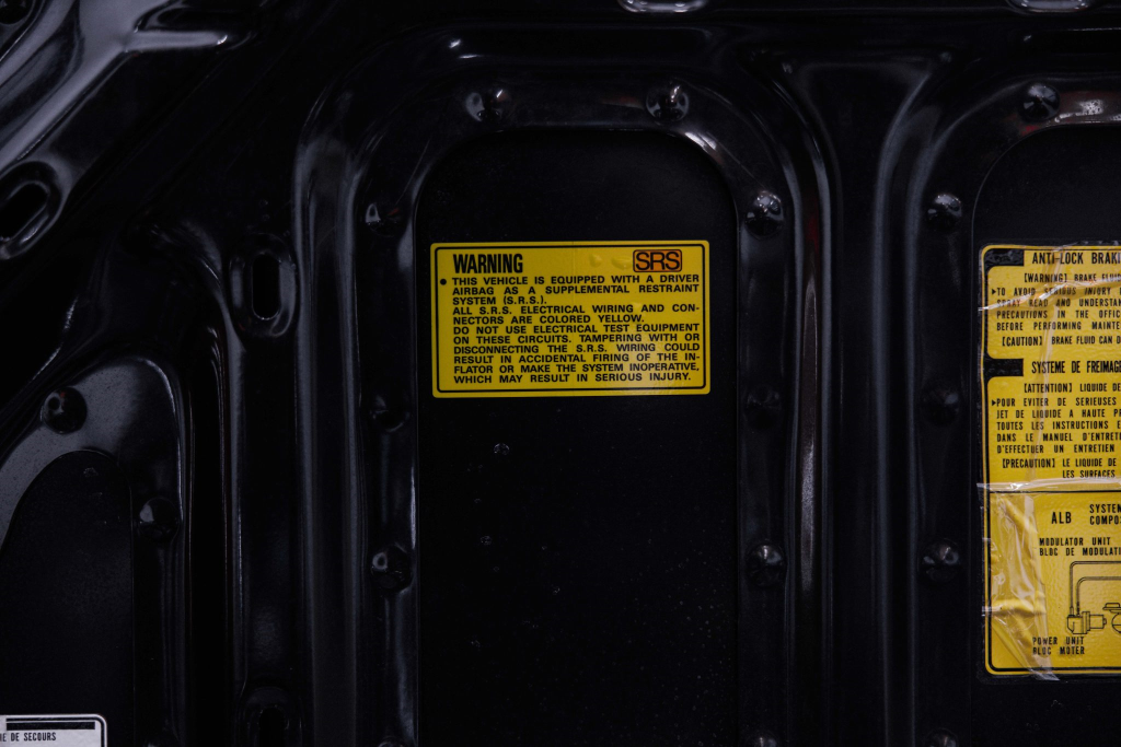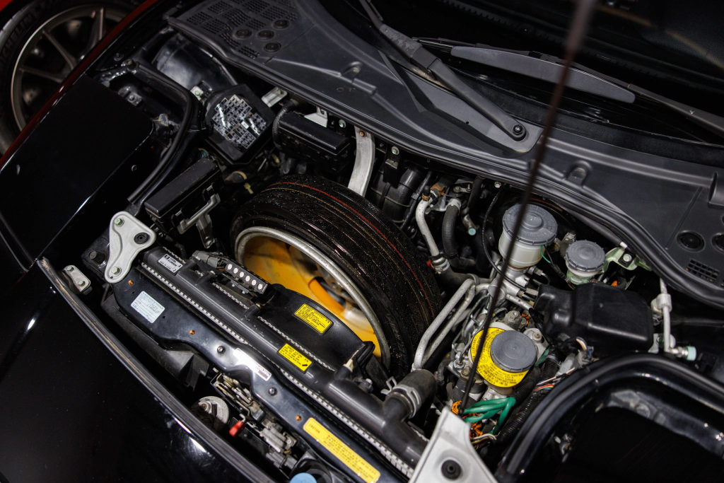 The NSX featured aluminum bodywork, and this example is finished in Berlina Black. Features include pop-up headlights, an integrated rear wing, side air intakes, power-adjustable side mirrors, and dual exhaust outlets. The front bumper cover has scratches, and paint chips are located on the front end and mirror caps. The front lower spoiler, rear trunk hinge stopper, front hood prop rod holder, right window regulator, rear glass hatch struts, and driver’s door seal were replaced in preparation for the sale.