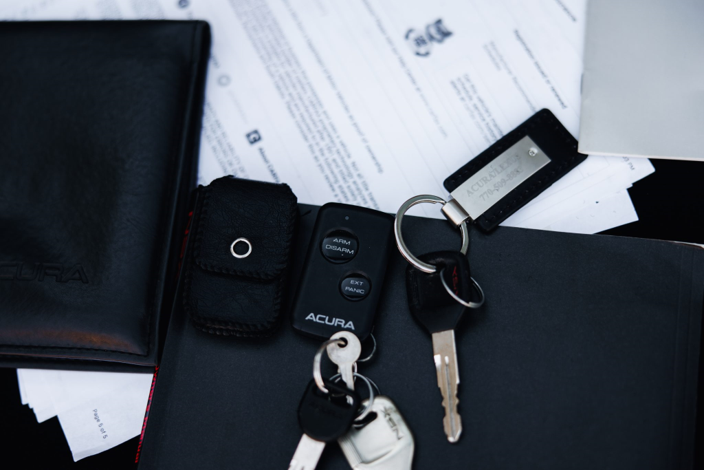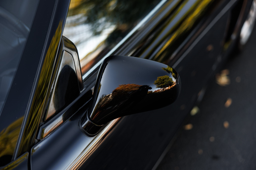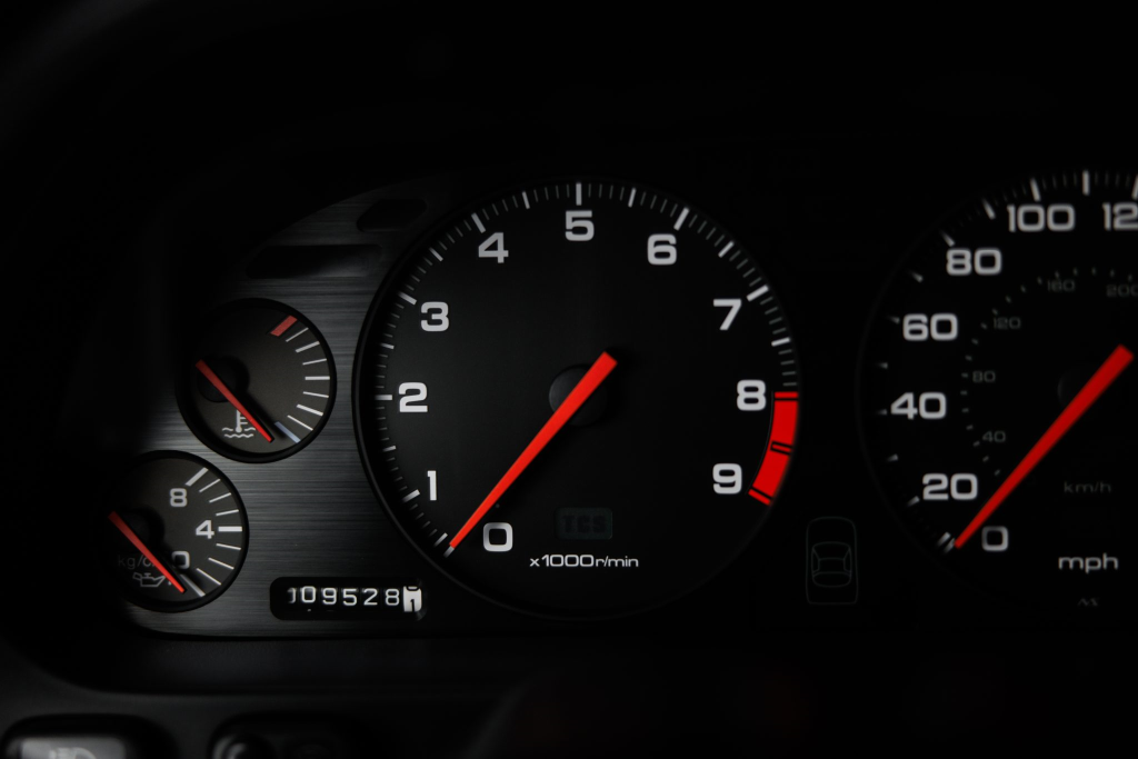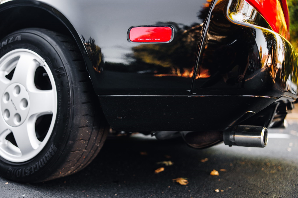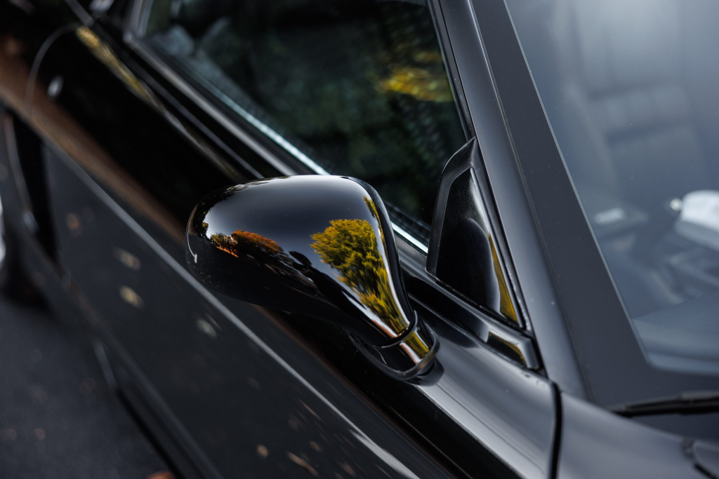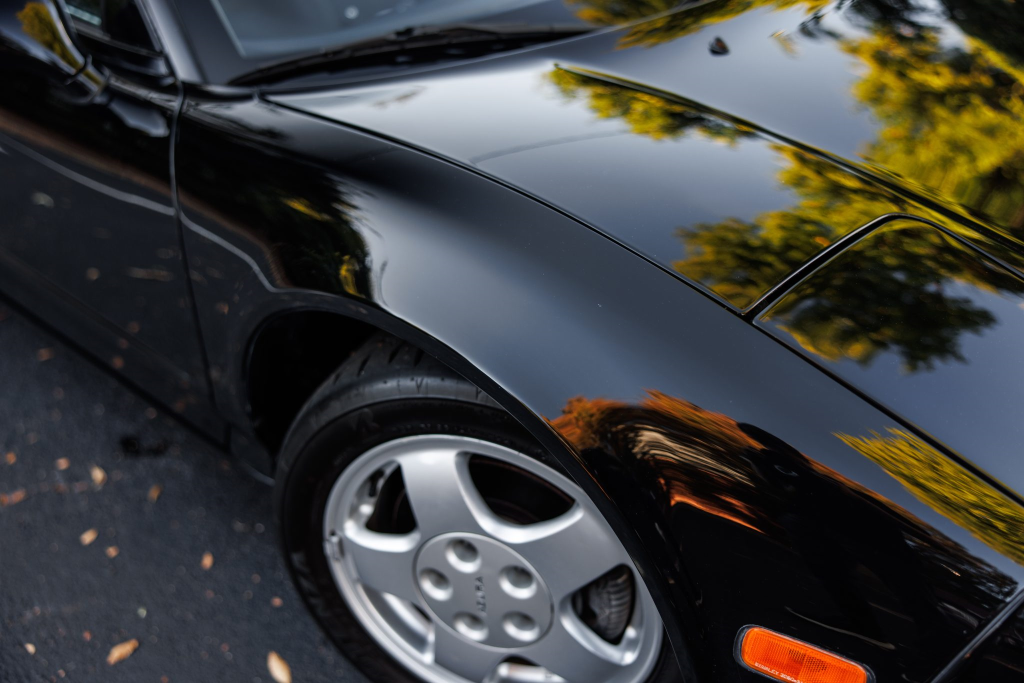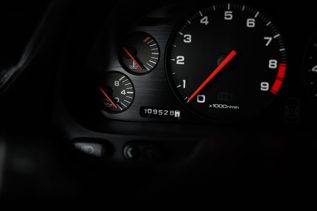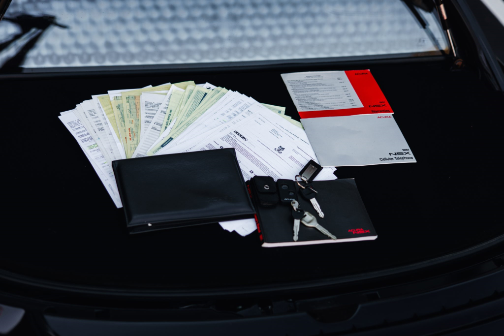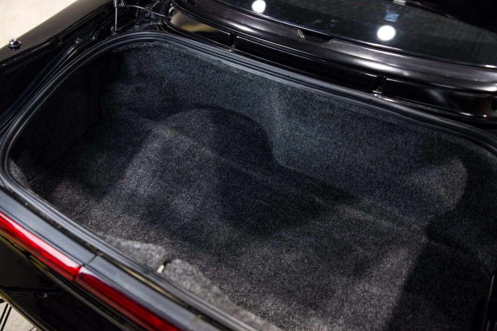 The NSX featured aluminum bodywork, and this example is finished in Berlina Black. Features include pop-up headlights, an integrated rear wing, side air intakes, power-adjustable side mirrors, and dual exhaust outlets. The front bumper cover has scratches, and paint chips are located on the front end and mirror caps. The front lower spoiler, rear trunk hinge stopper, front hood prop rod holder, right window regulator, rear glass hatch struts, and driver’s door seal were replaced in preparation for the sale.