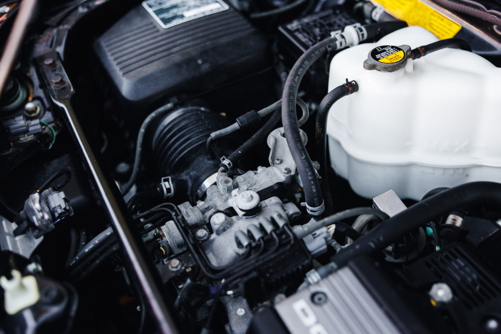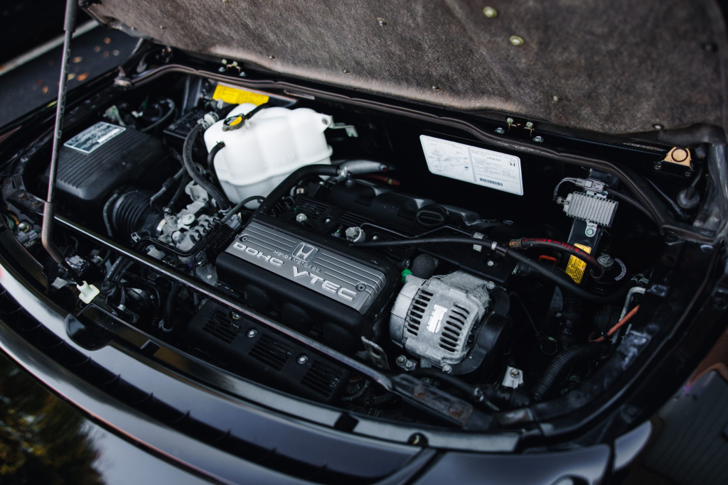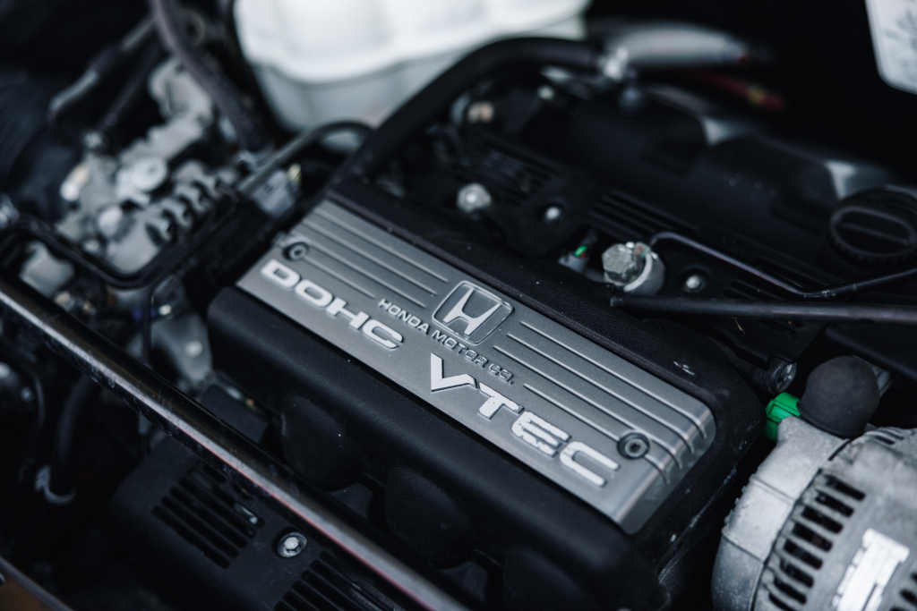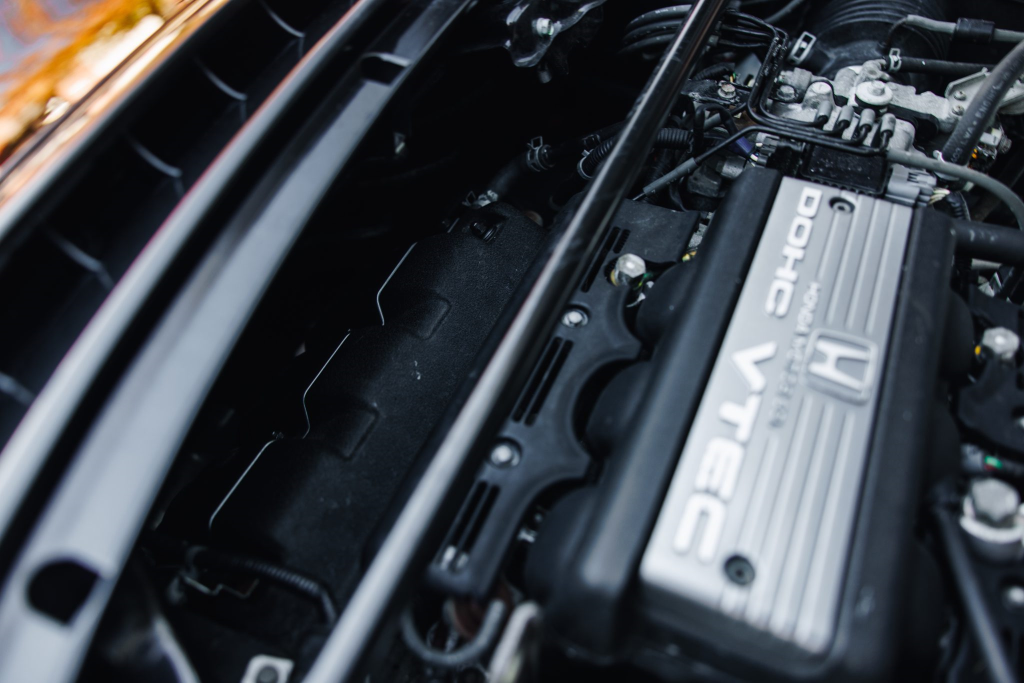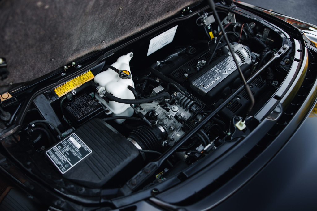 The mid-mounted 3.0-liter V6 features VTEC variable valve timing and was factory rated at 270 horsepower and 210 lb-ft of torque. Work in October 2025 included adjusting the valves, installing replacement clutch and brake pedal stop pads, and replacing the ignition switch, fuel filter, fuel injector relay, thermostat, and spark plugs. The seller tells us the timing belt was replaced in June 2023.
