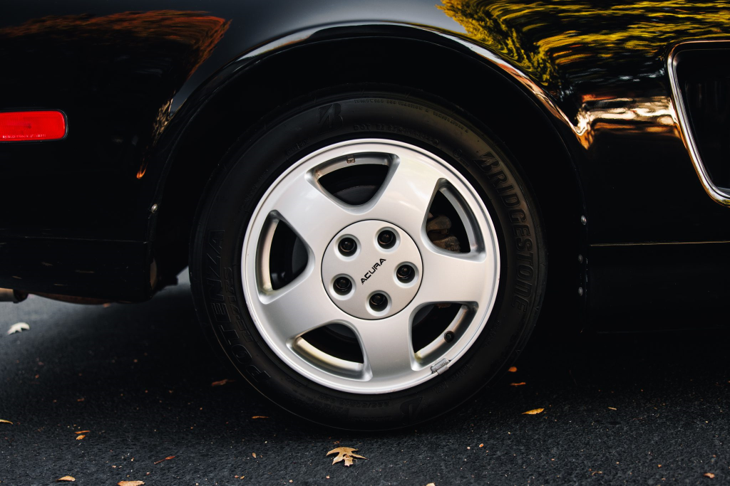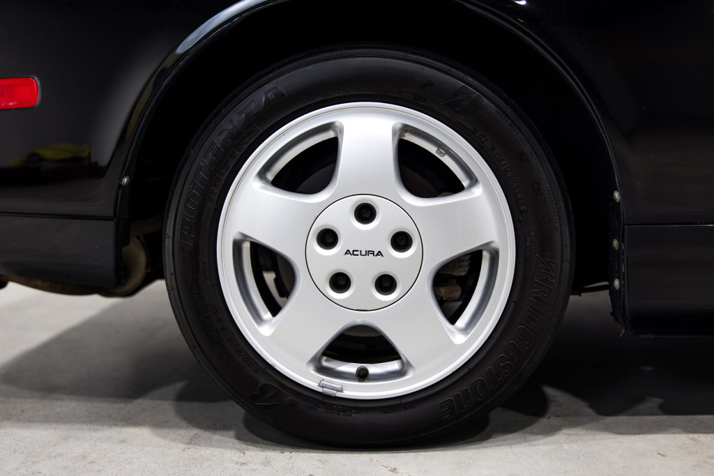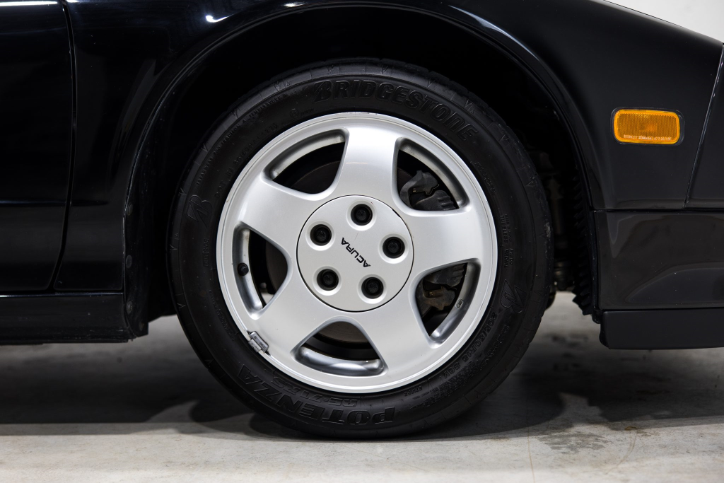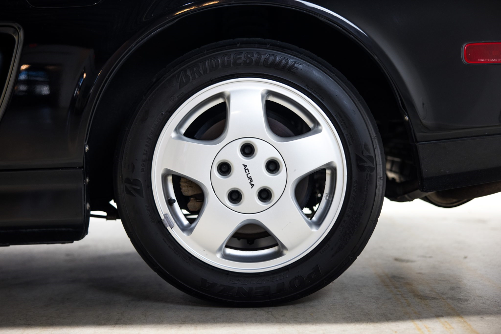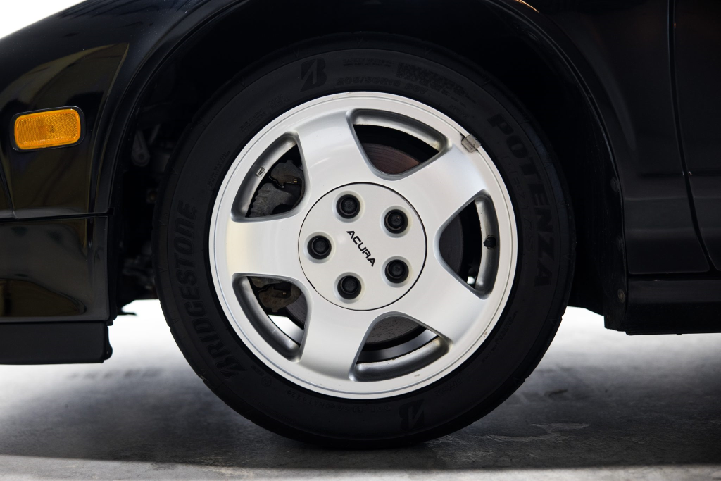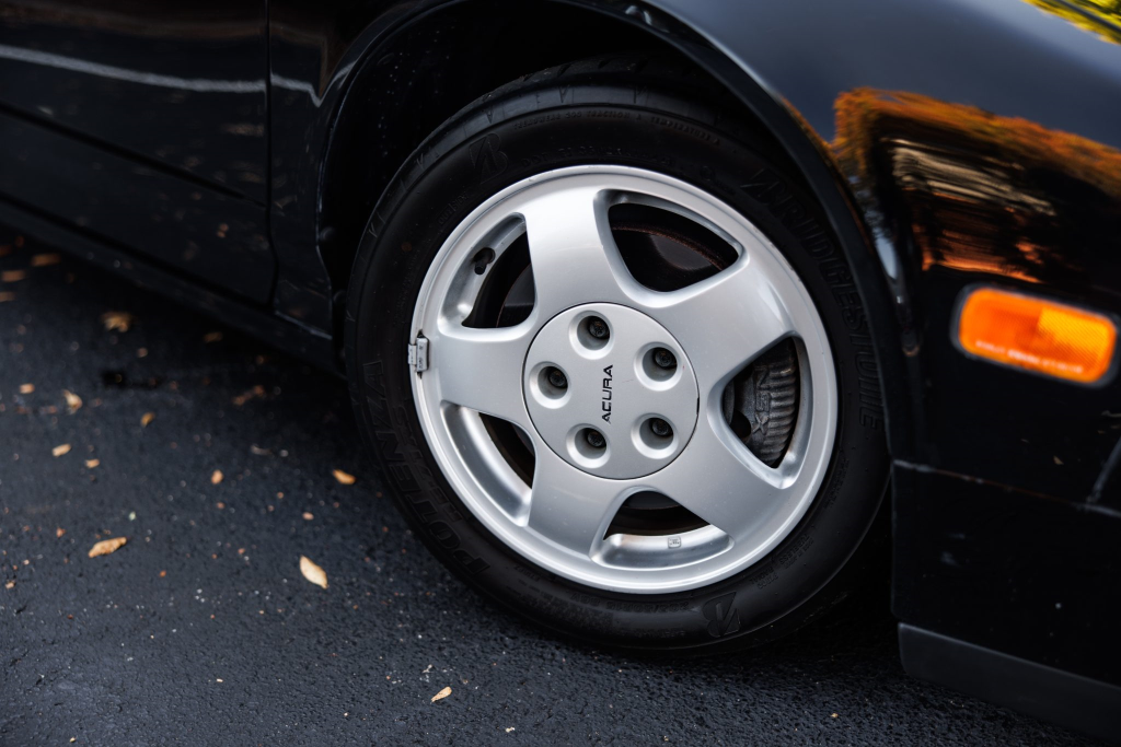 Staggered-diameter 15″ and 16″ five-spoke forged wheels are mounted with Bridgestone Potenza tires. The car features a four-wheel double-wishbone suspension with front and rear stabilizer bars, and braking is handled by NSX-branded calipers over vented rotors at each corner. A brake fluid flush was performed in October 2025.