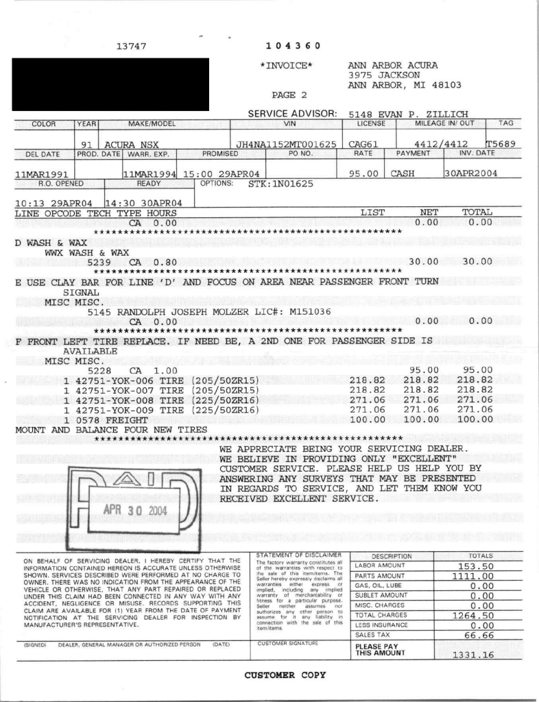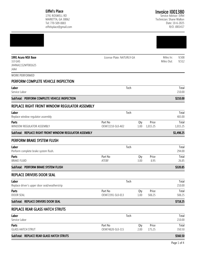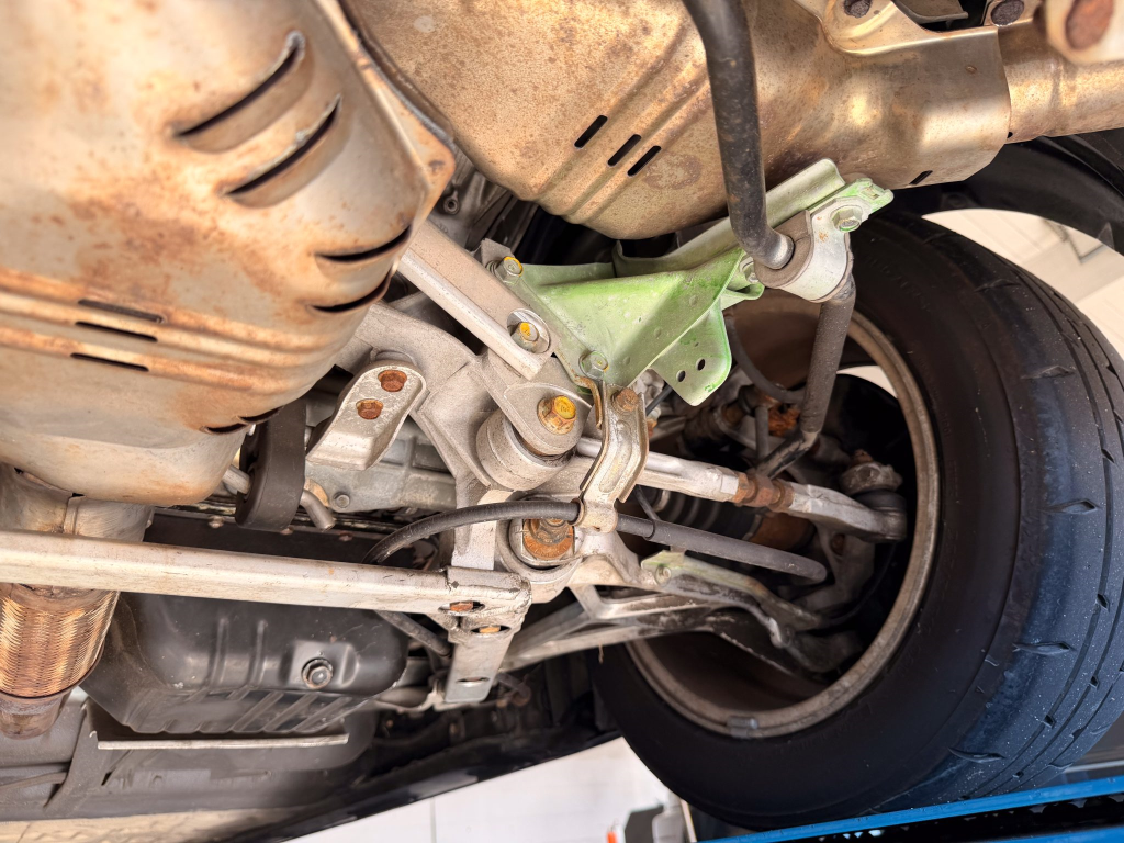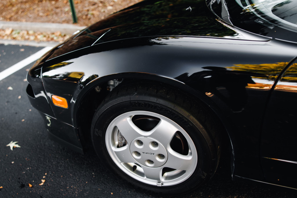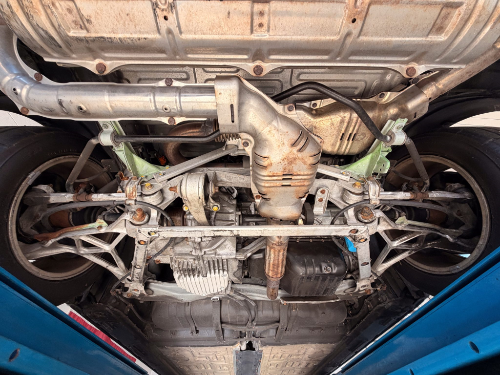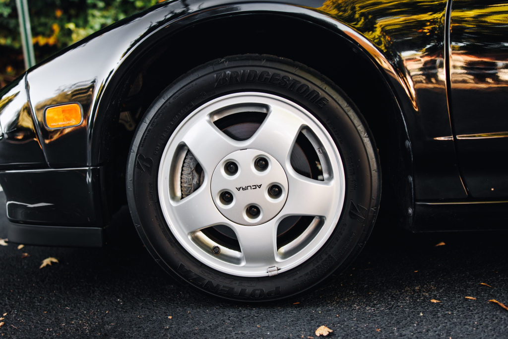 Staggered-diameter 15″ and 16″ five-spoke forged wheels are mounted with Bridgestone Potenza tires. The car features a four-wheel double-wishbone suspension with front and rear stabilizer bars, and braking is handled by NSX-branded calipers over vented rotors at each corner. A brake fluid flush was performed in October 2025.