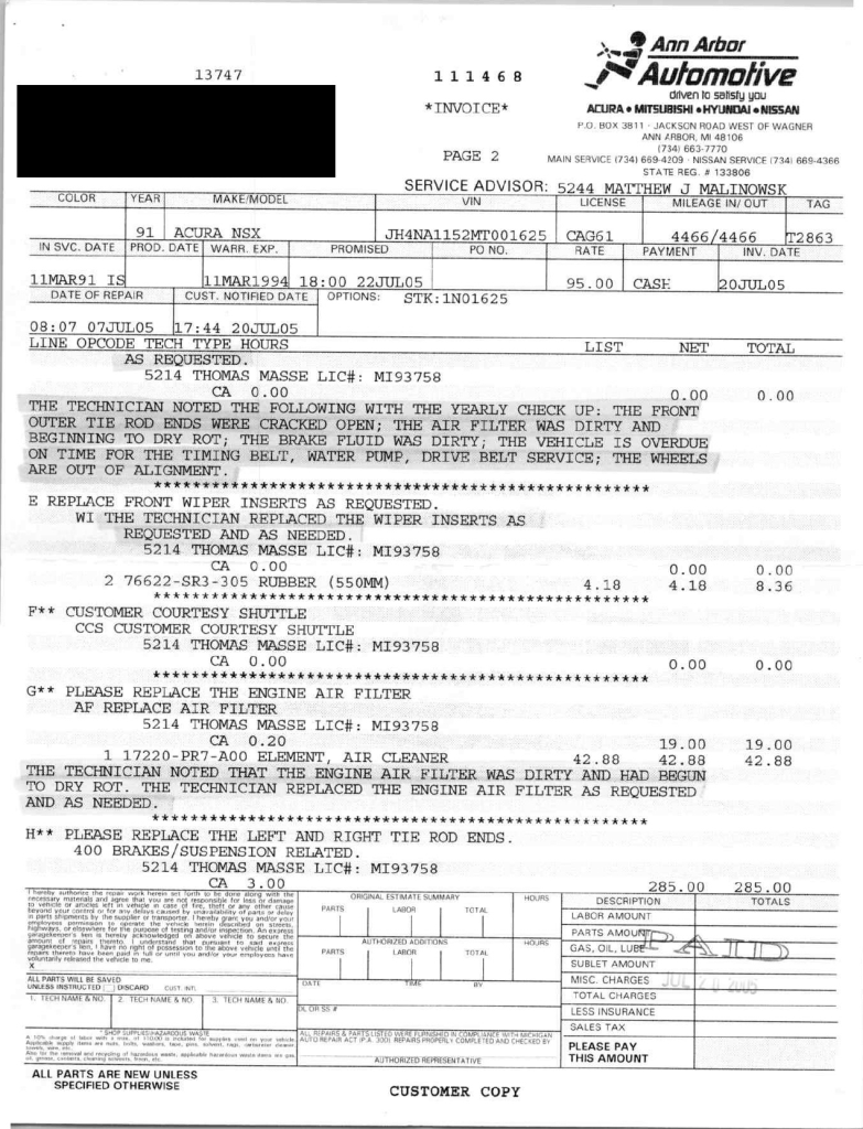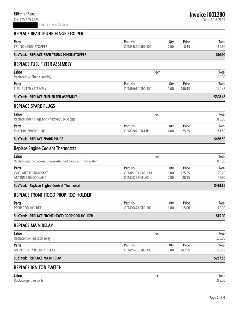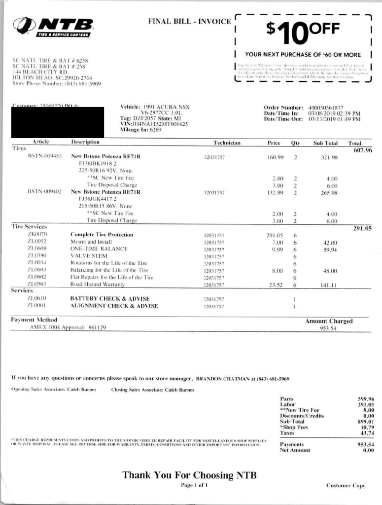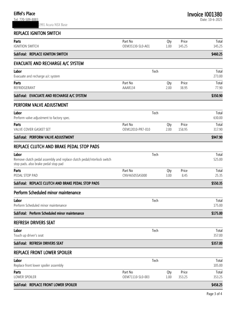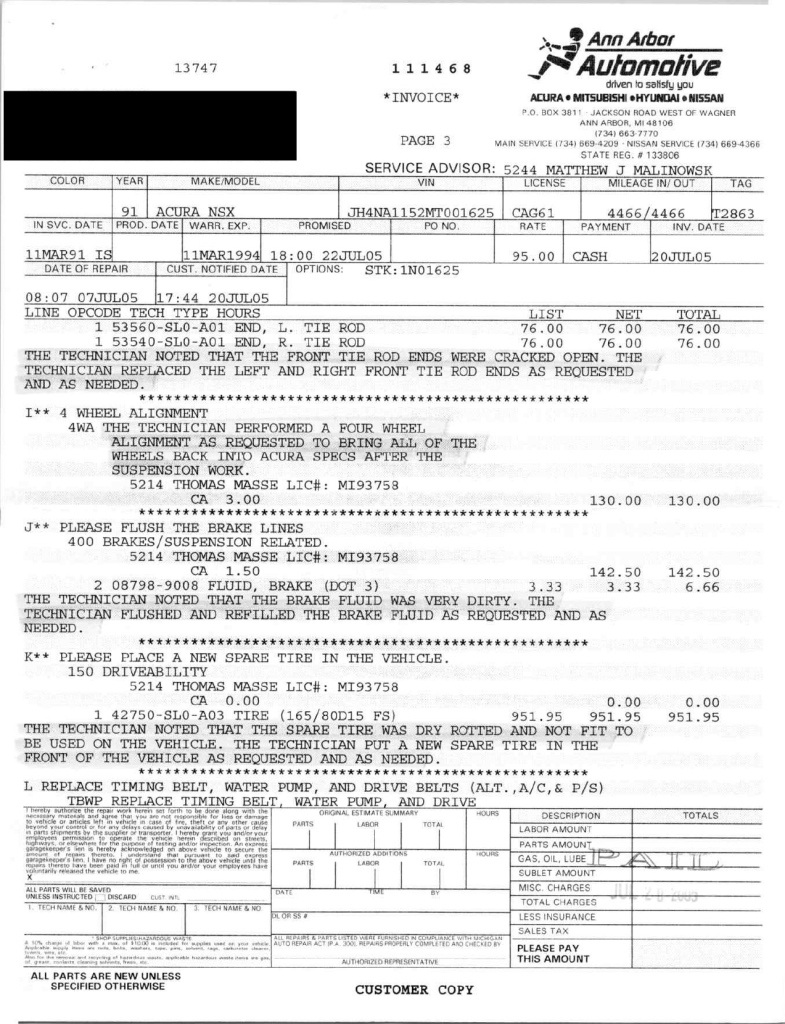 Staggered-diameter 15″ and 16″ five-spoke forged wheels are mounted with Bridgestone Potenza tires. The car features a four-wheel double-wishbone suspension with front and rear stabilizer bars, and braking is handled by NSX-branded calipers over vented rotors at each corner. A brake fluid flush was performed in October 2025.