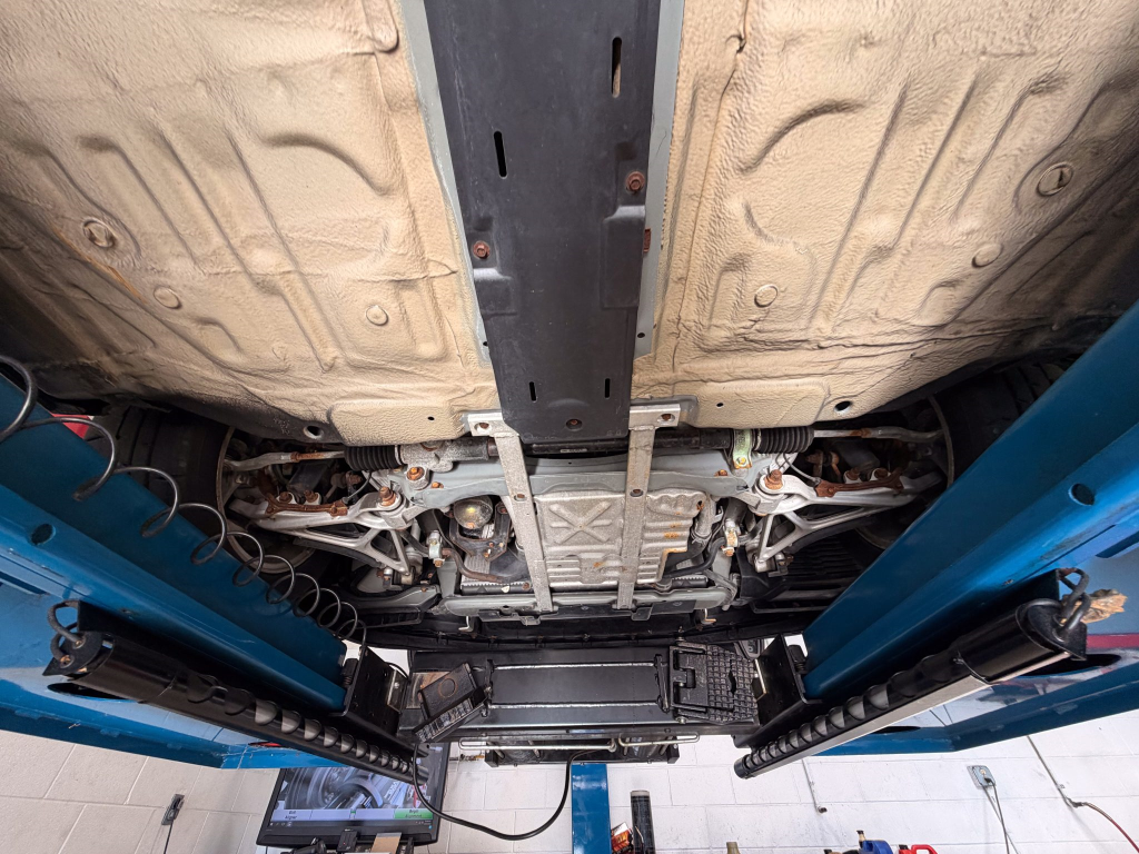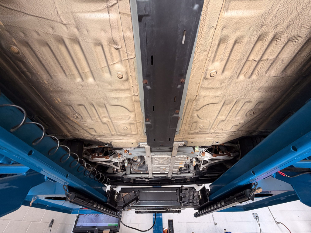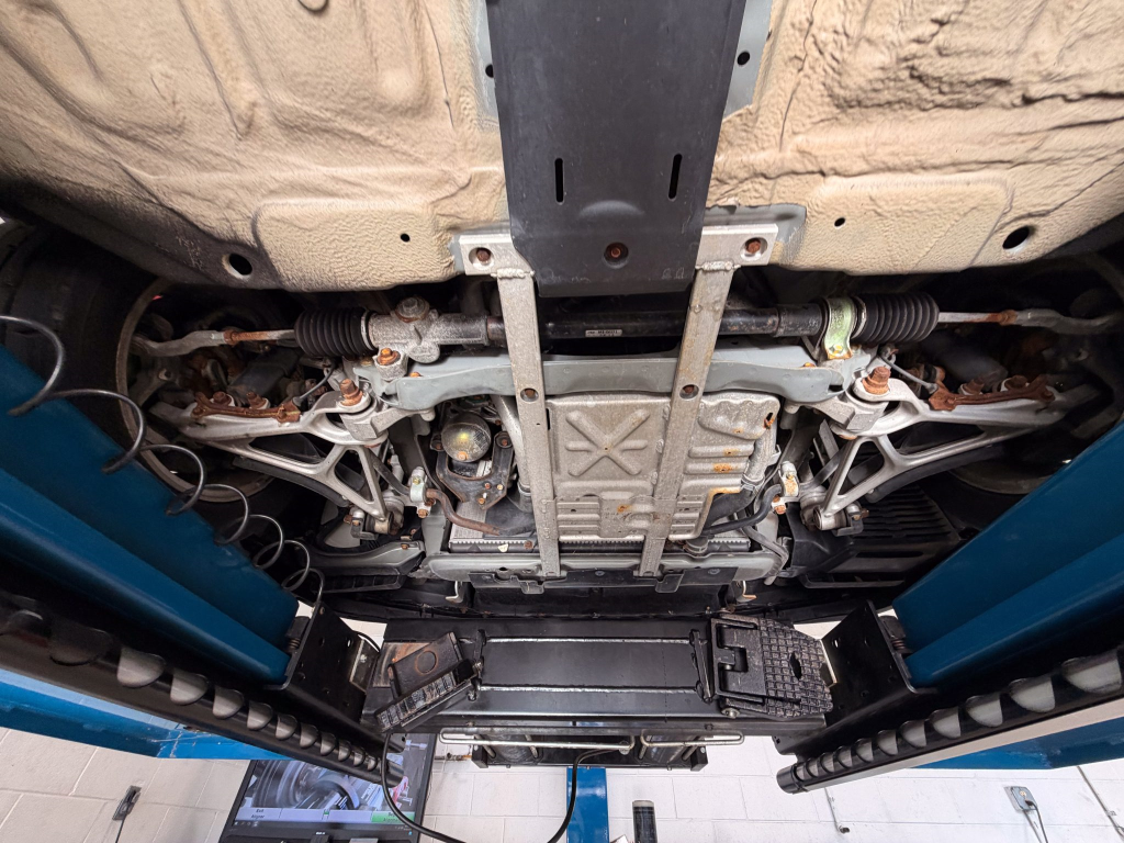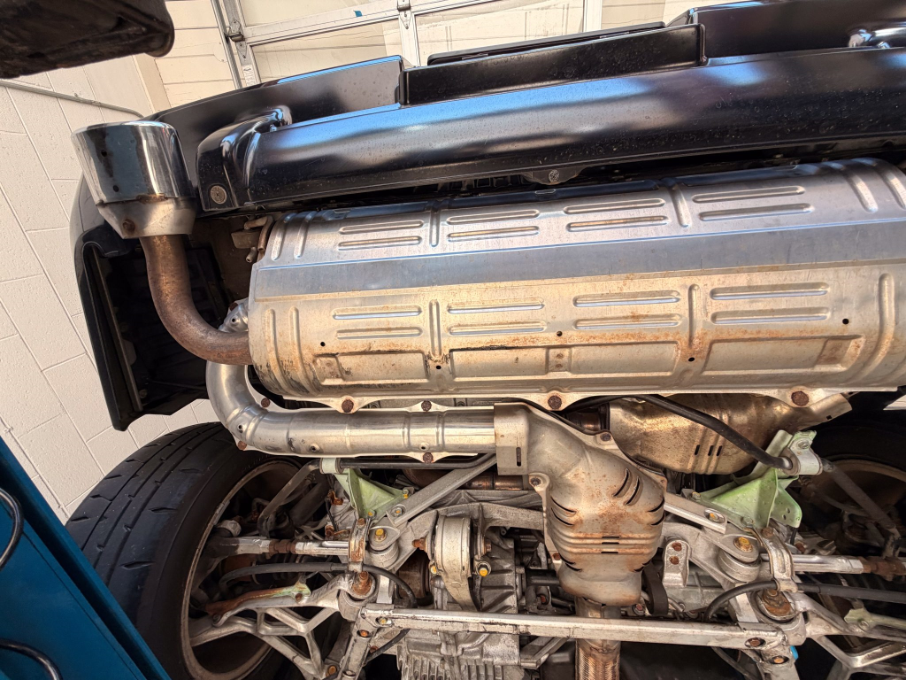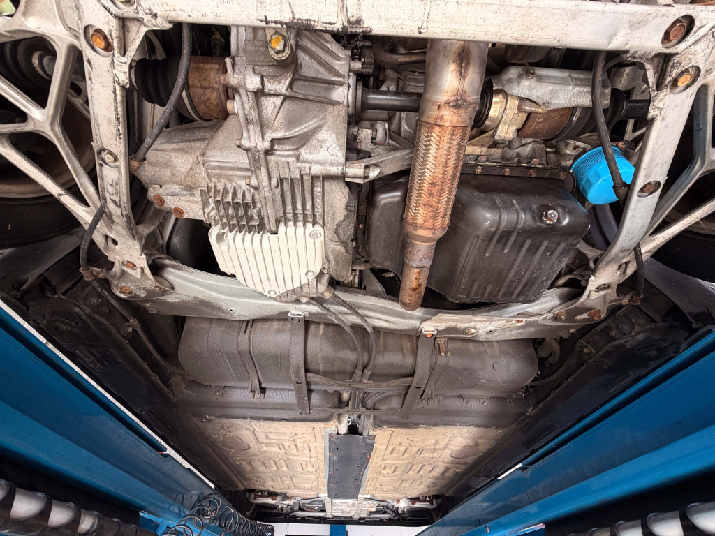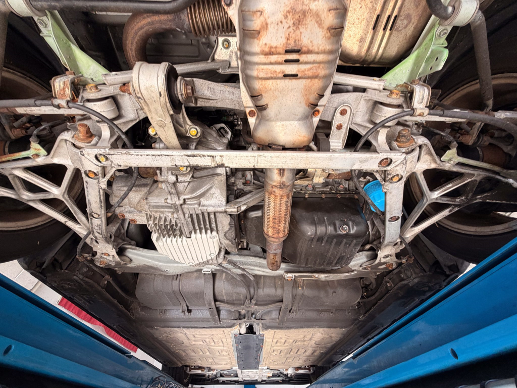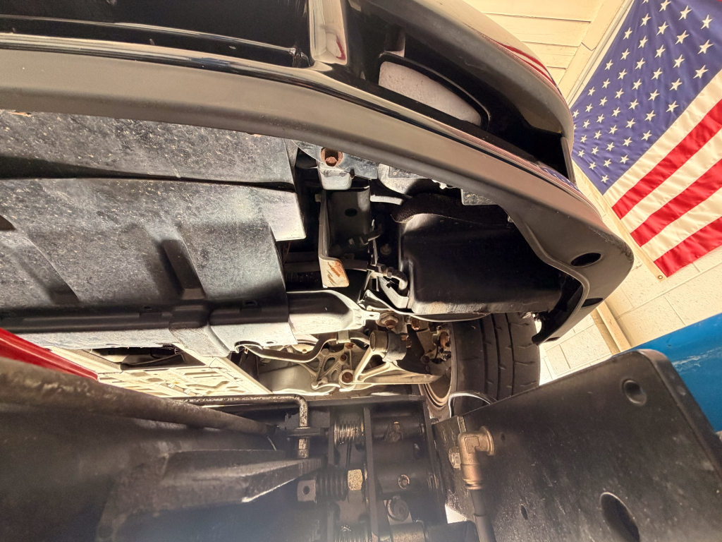 Power is routed to the rear wheels via a five-speed manual transaxle and a limited-slip differential. A photo showing transaxle serial number J4A4-1002280 is provided in the gallery, indicating that the unit falls outside the snap ring failure range. Corrosion is noted on the hardware located on the underside.