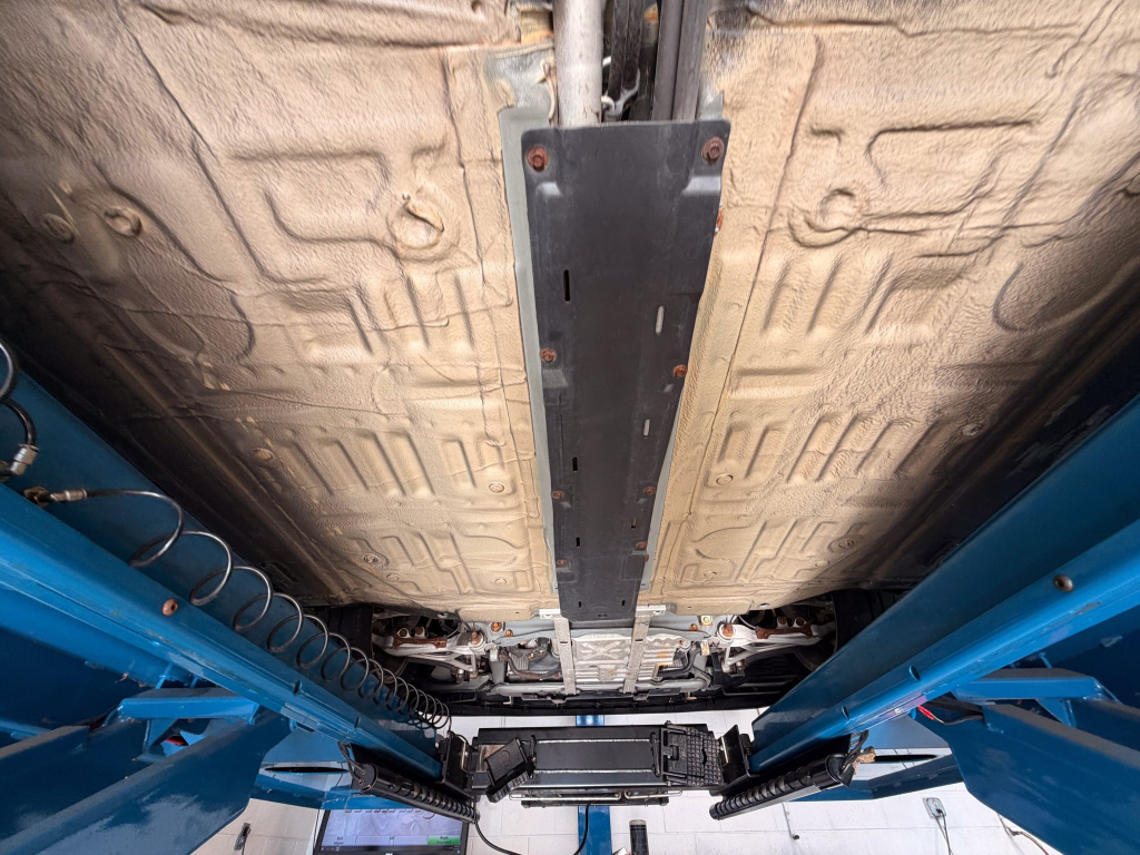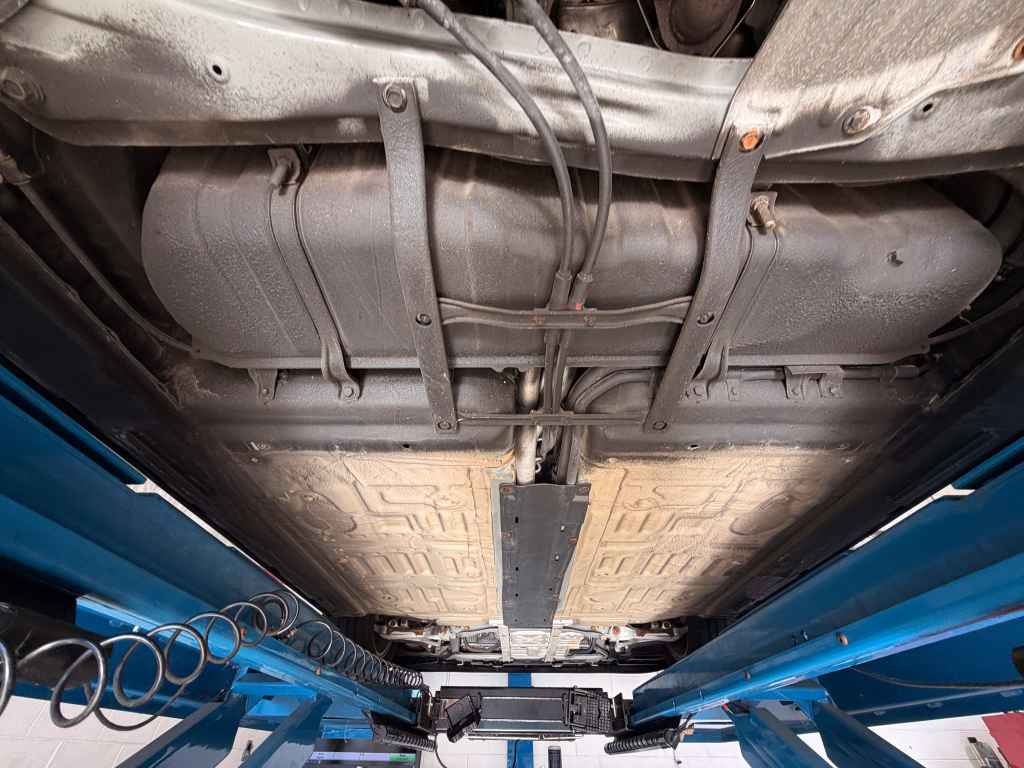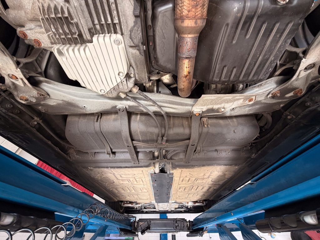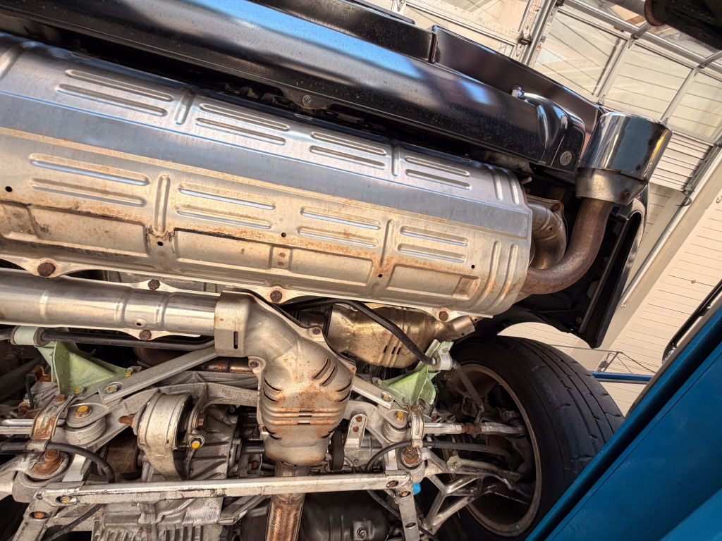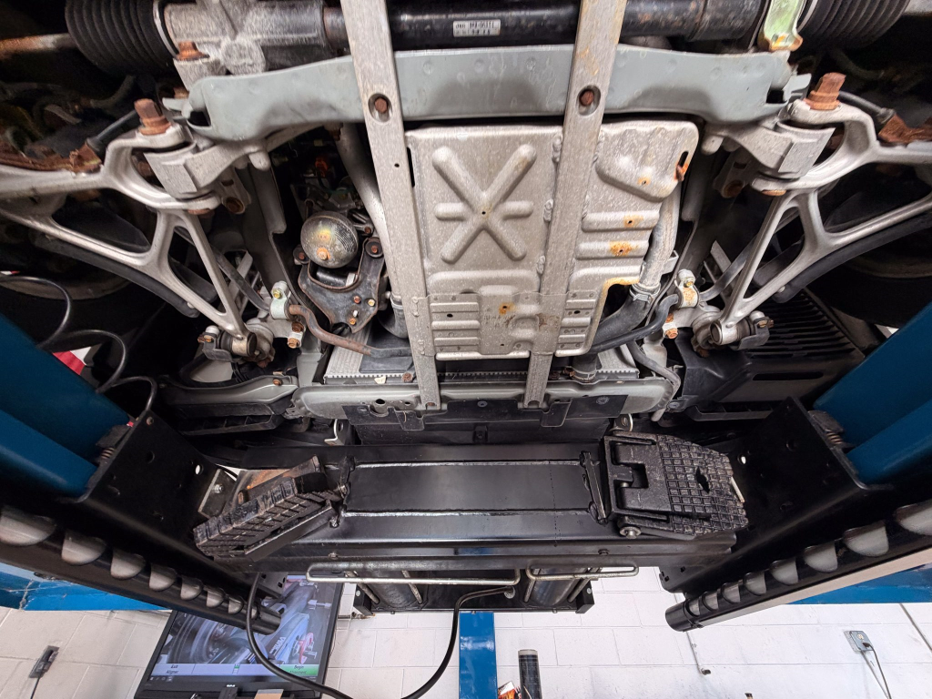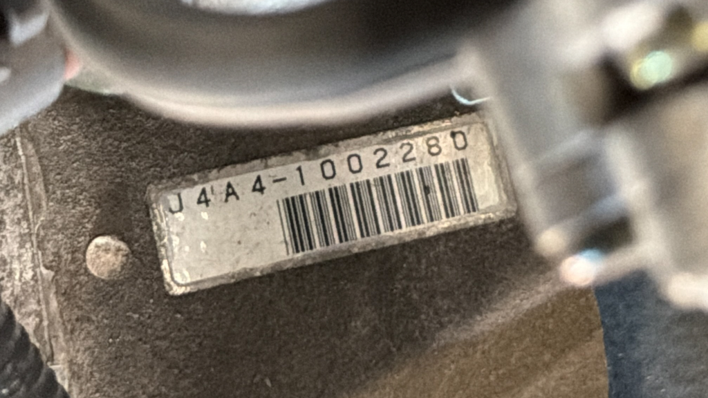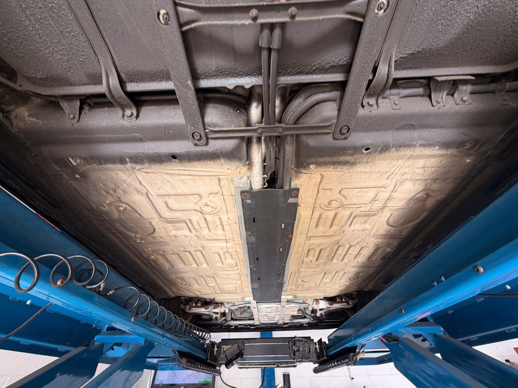 Power is routed to the rear wheels via a five-speed manual transaxle and a limited-slip differential. A photo showing transaxle serial number J4A4-1002280 is provided in the gallery, indicating that the unit falls outside the snap ring failure range. Corrosion is noted on the hardware located on the underside.