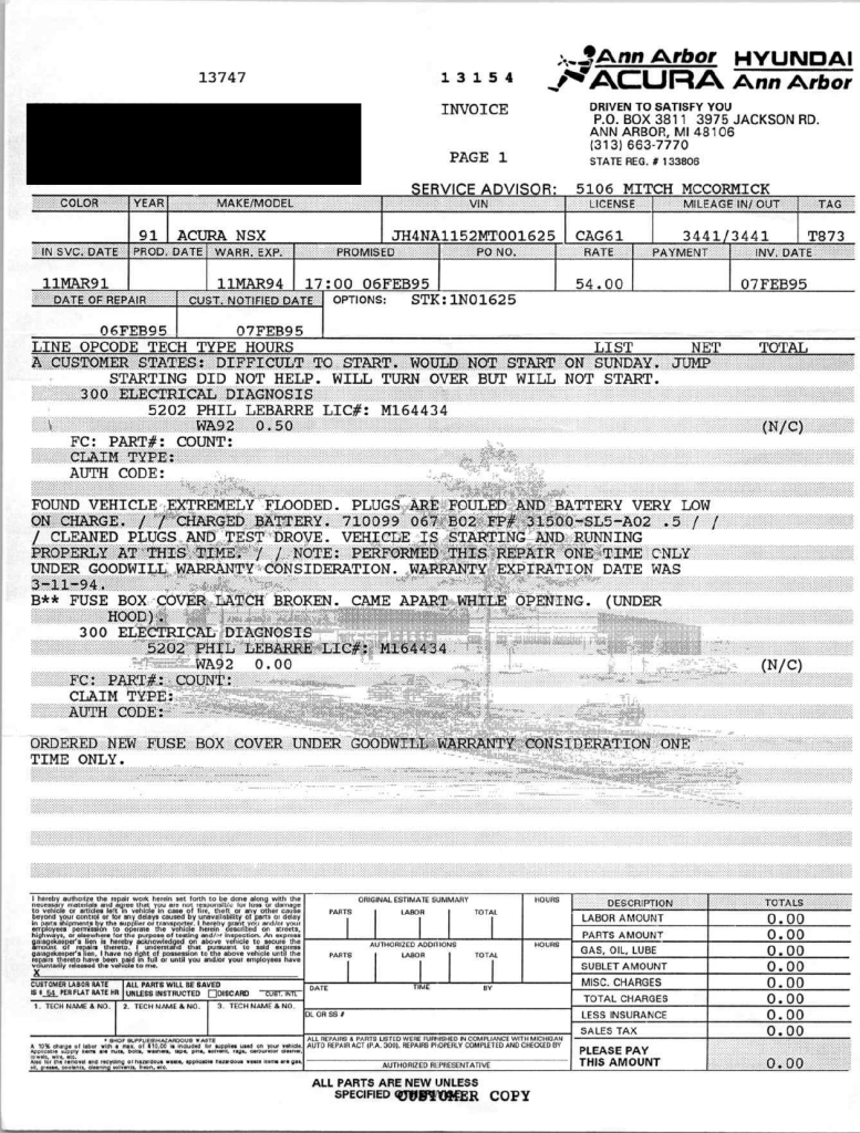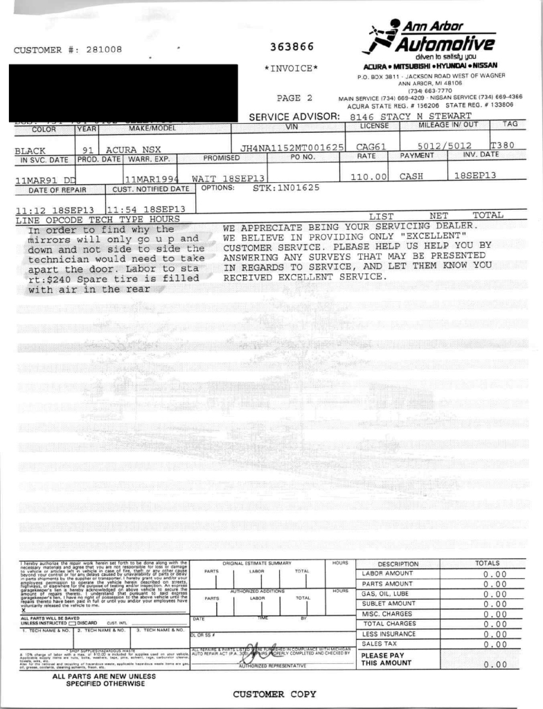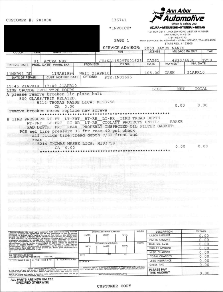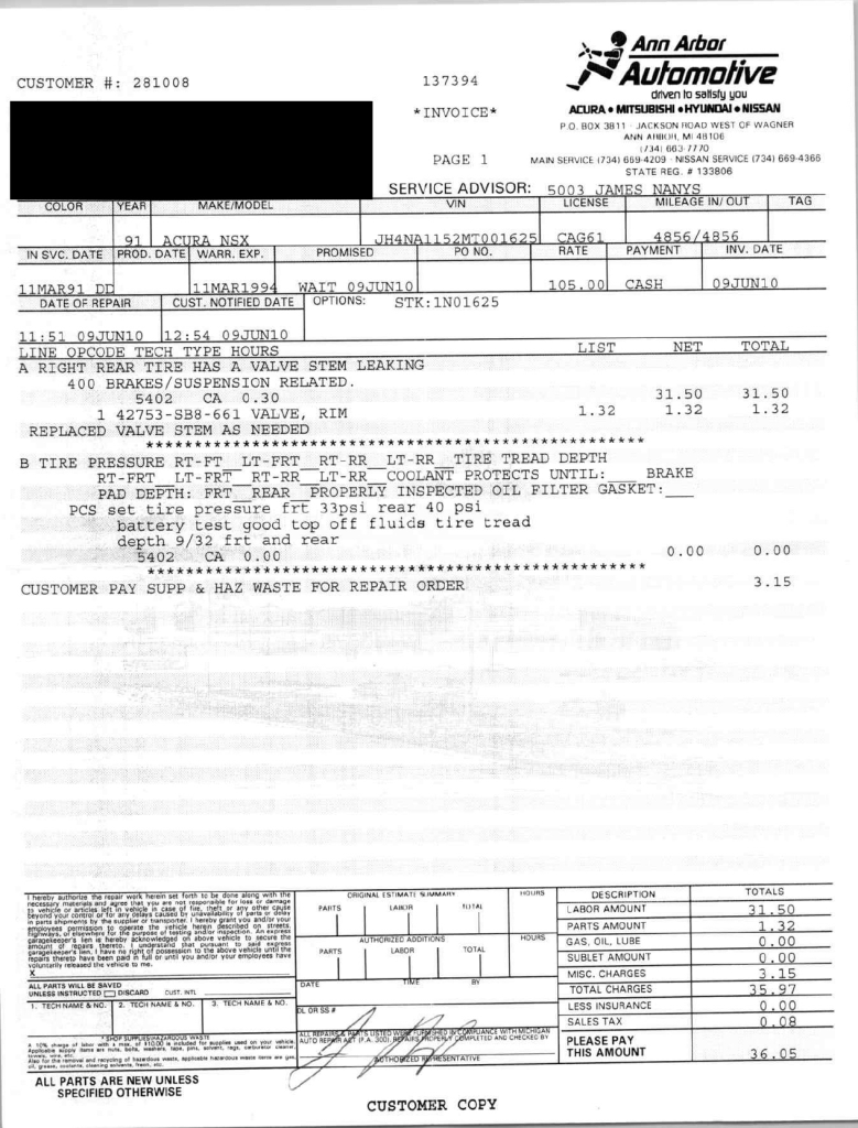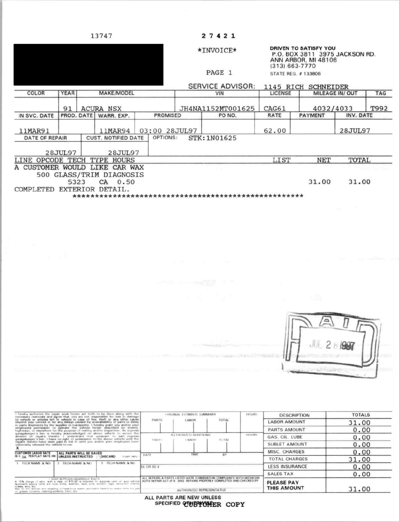 This 1991 Acura NSX was previously listed on BaT in April 2021, and it shows 10k miles following registration history in Michigan and Georgia. It is powered by a 3.0-liter VTEC V6 paired with a five-speed manual transaxle and is finished in Berlina Black over black leather upholstery. The stereo was modified by Willman’s Electronics in 2021, and the car is further equipped with staggered-diameter 15″ and 16″ forged wheels, a limited-slip differential, pop-up headlights, power-adjustable seats, automatic climate control, cruise control, and a Bose sound system. This NSX was purchased by the owner in 2021 and is now offered on dealer consignment with the owner’s manual, service records, a clean Carfax report, and a clean Georgia title.