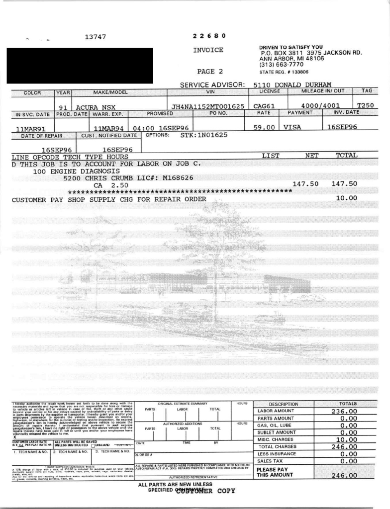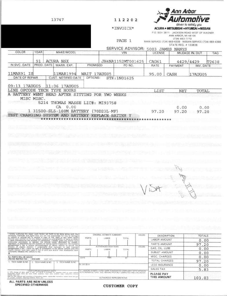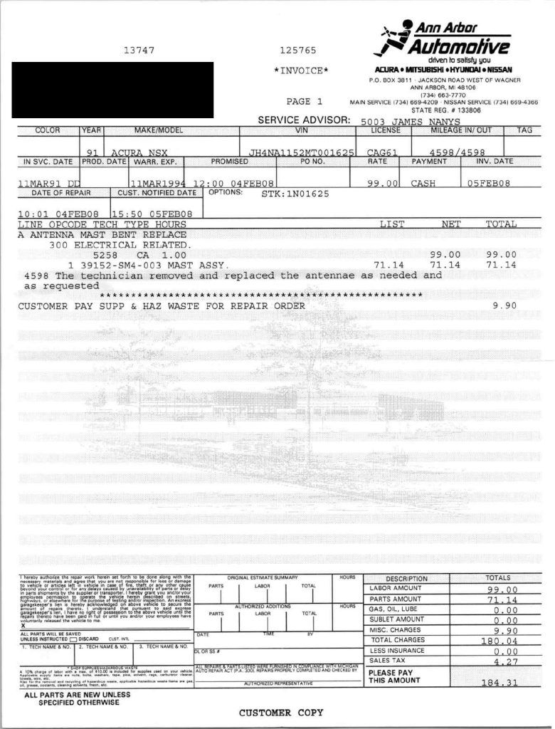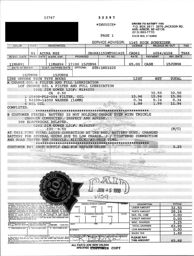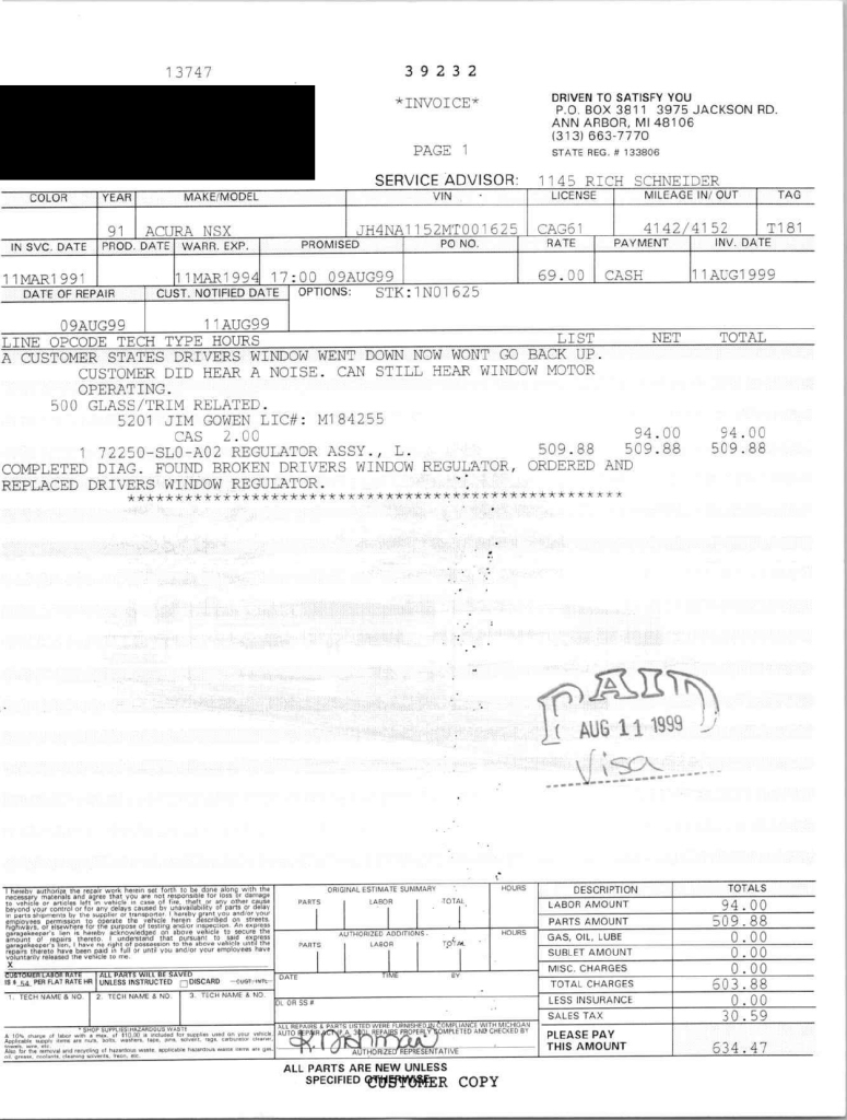 This 1991 Acura NSX was previously listed on BaT in April 2021, and it shows 10k miles following registration history in Michigan and Georgia. It is powered by a 3.0-liter VTEC V6 paired with a five-speed manual transaxle and is finished in Berlina Black over black leather upholstery. The stereo was modified by Willman’s Electronics in 2021, and the car is further equipped with staggered-diameter 15″ and 16″ forged wheels, a limited-slip differential, pop-up headlights, power-adjustable seats, automatic climate control, cruise control, and a Bose sound system. This NSX was purchased by the owner in 2021 and is now offered on dealer consignment with the owner’s manual, service records, a clean Carfax report, and a clean Georgia title.