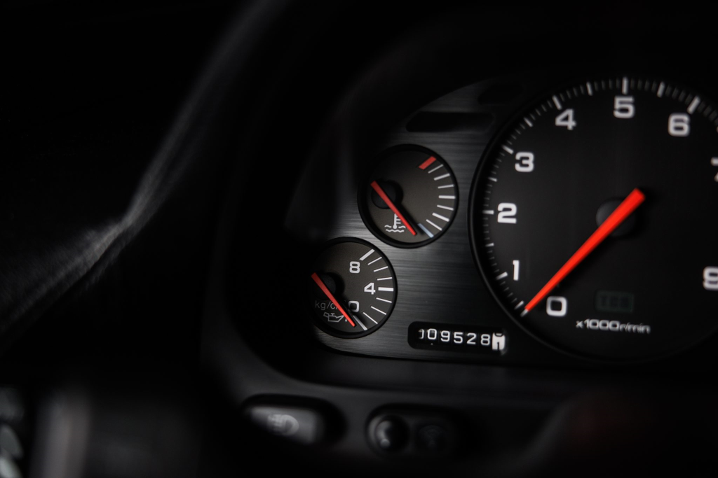 The leather-wrapped steering wheel frames a tachometer with an 8k-rpm redline, a 188-mph speedometer, and gauges for coolant temperature, oil pressure, voltage, and fuel level. The six-digit odometer shows 10k miles, approximately 3k of which were added under current ownership.