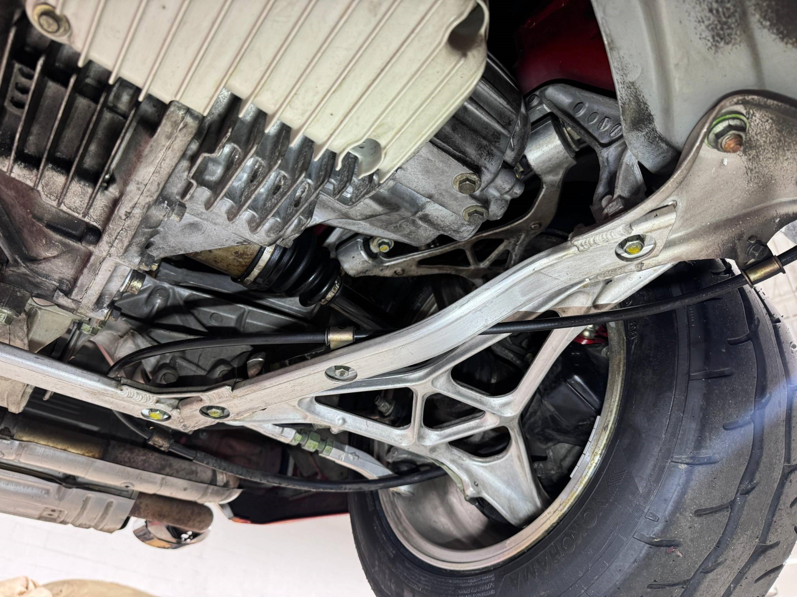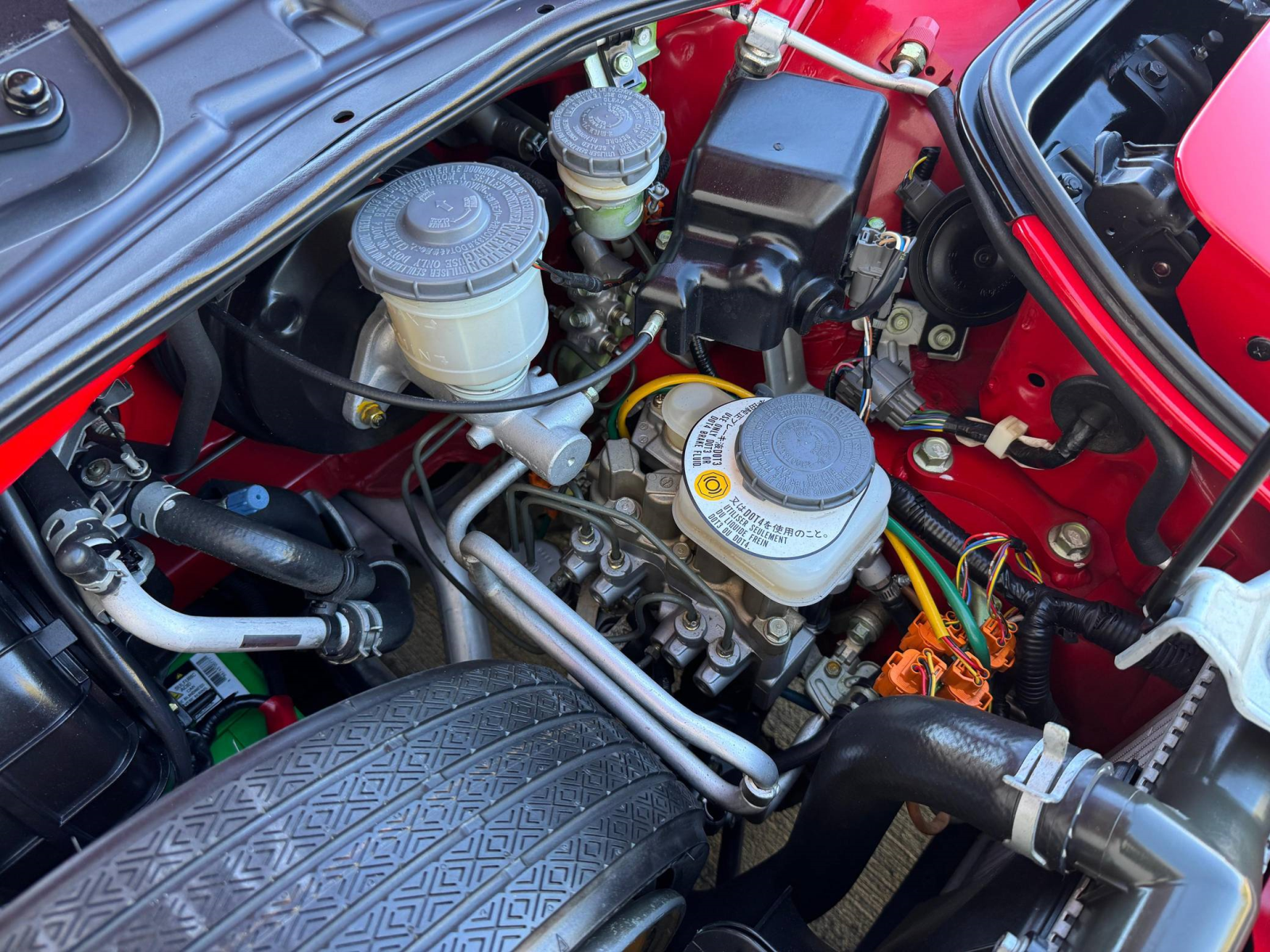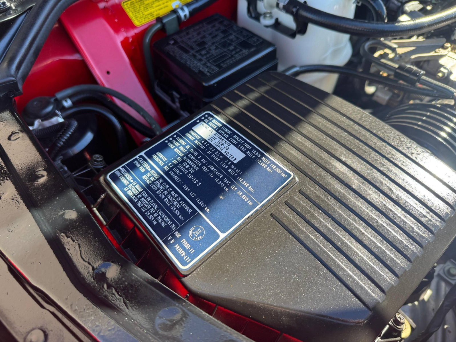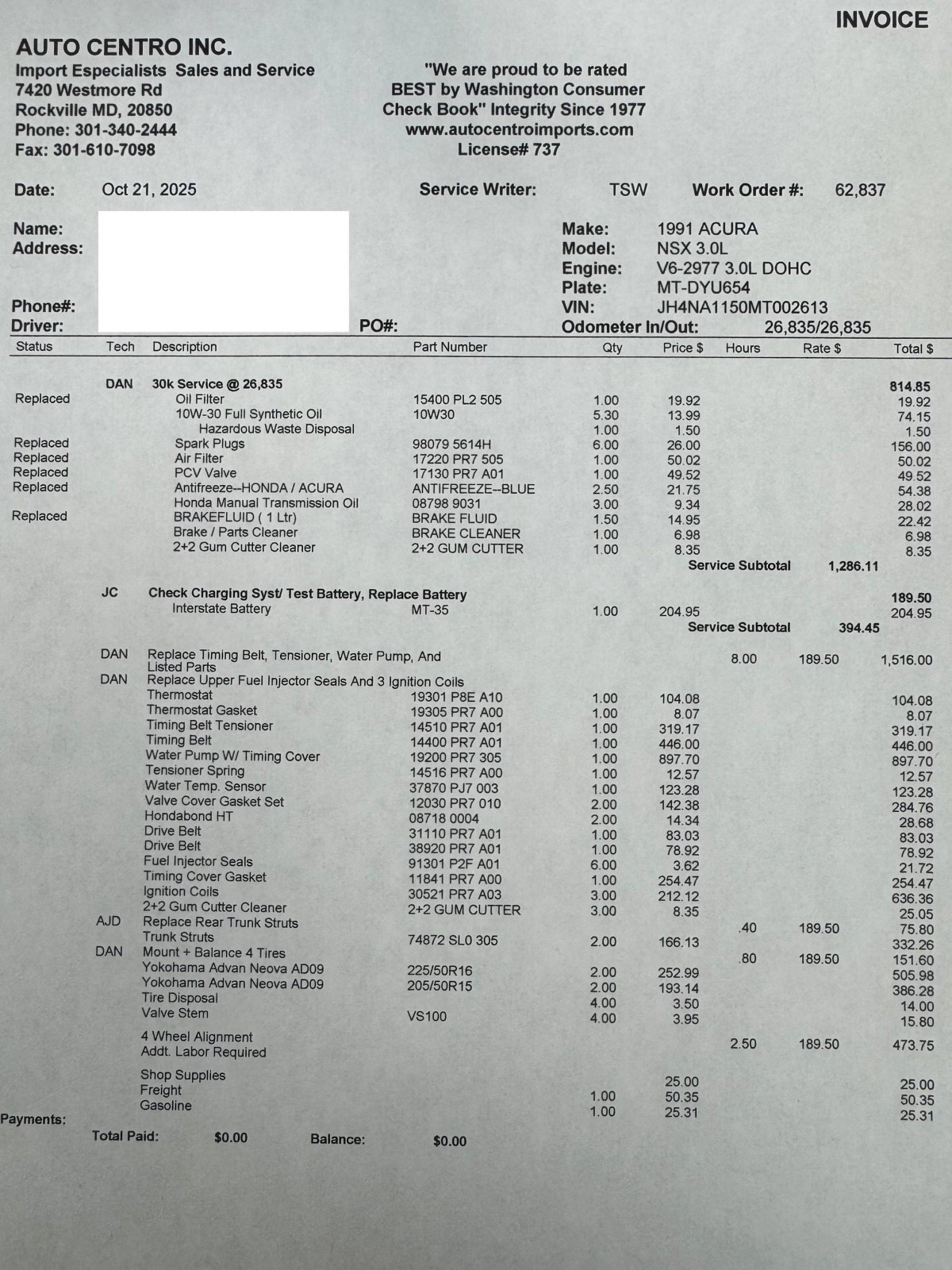 - October 2025 (26,835 miles): Engine oil and filter, coolant, transmission fluid, and brake fluid changed, timing belt, timing belt tensioner, water pump, thermostat, spark plugs, air filter, PCV valve, battery, fuel injector seals, 3 ignition coils, water temperature sensor, valve cover gasket, drive belts, timing cover gasket, rear trunk struts, and tires replaced, four-wheel alignment performed