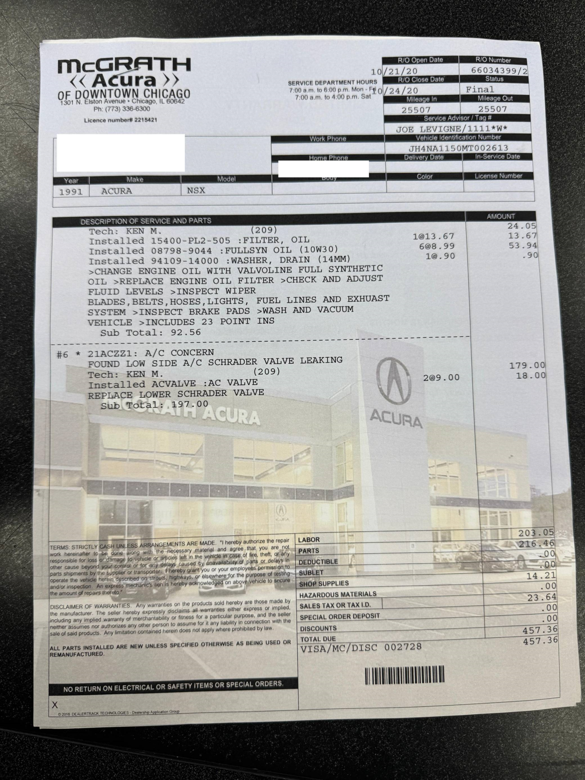 - October 2020 (25,507 miles): Engine oil and filter changed, battery and lower air conditioning Schrader valve replaced