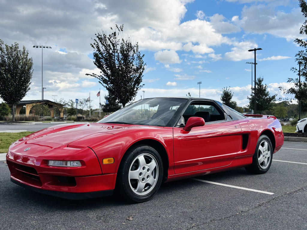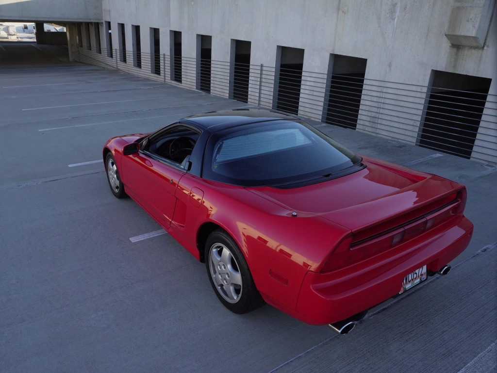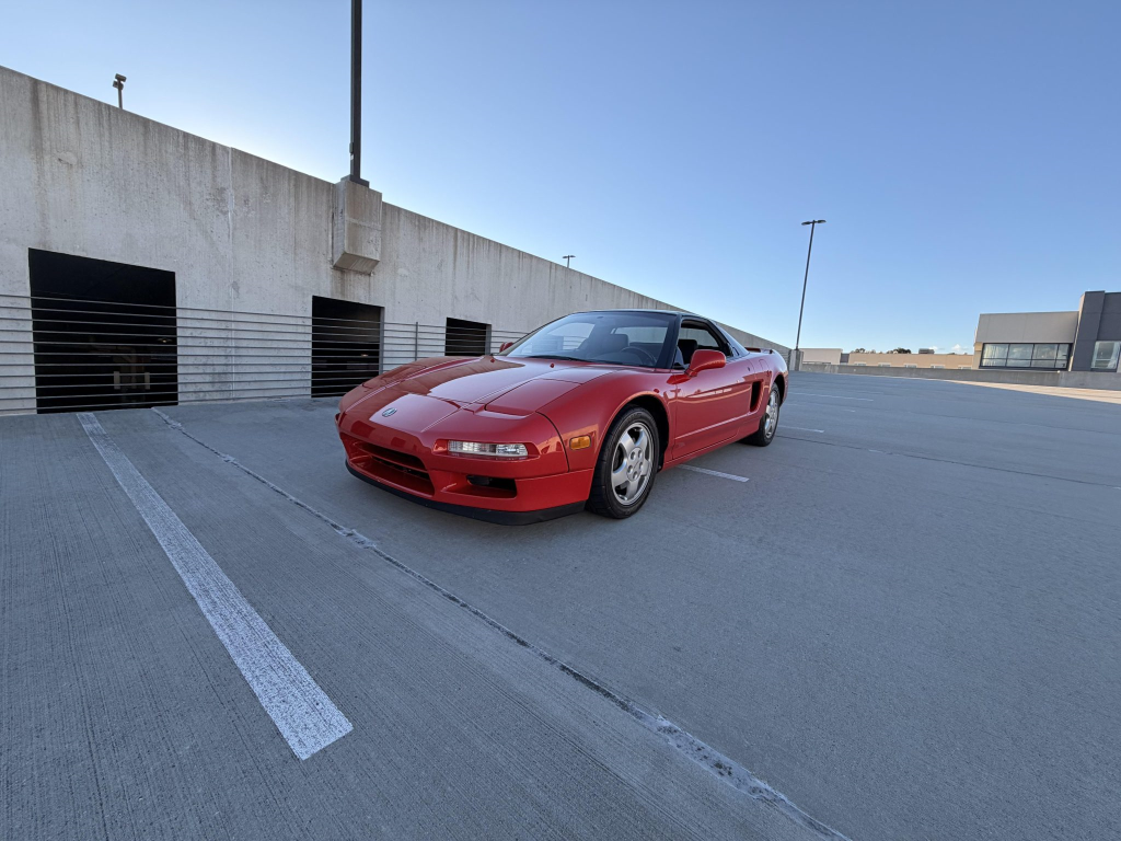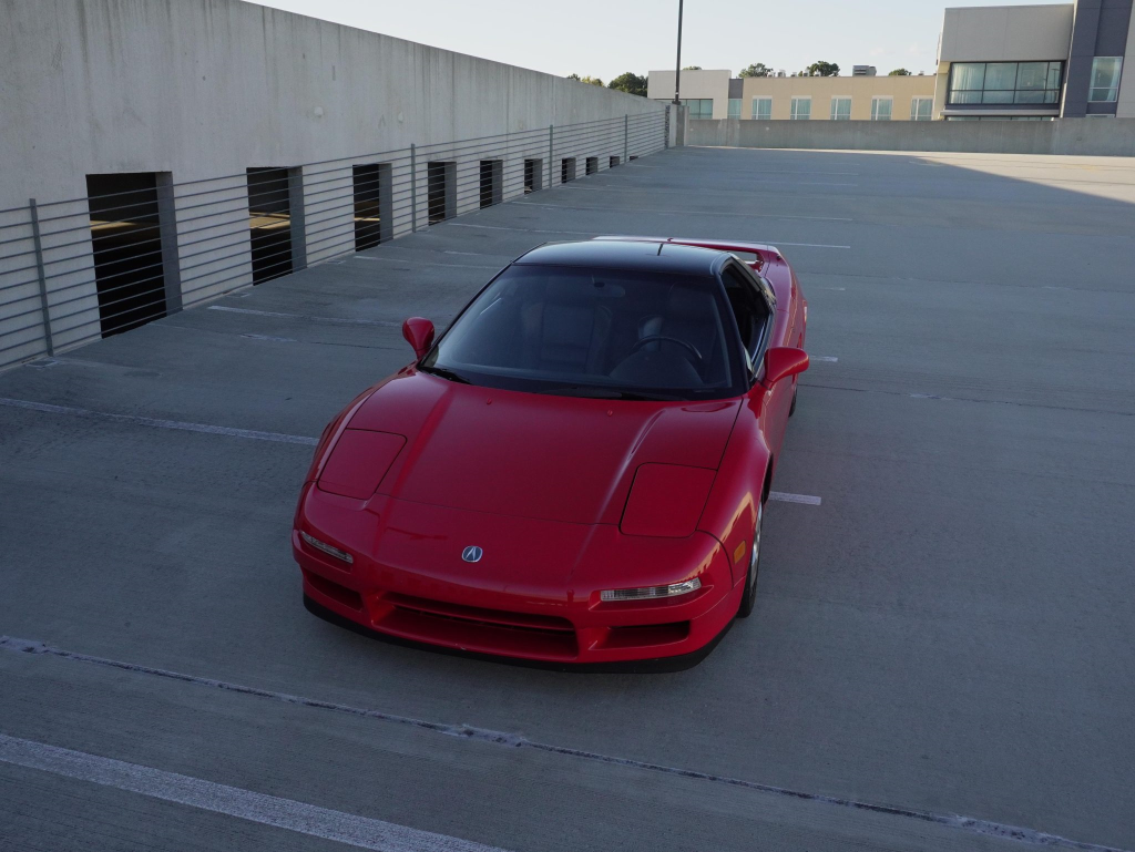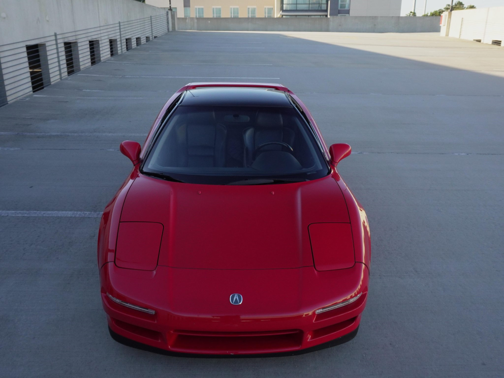 The NSX featured aluminum bodywork, and this example is finished in Formula Red with a black roof panel and pillars. Features include pop-up headlights, an integrated rear wing, side air intakes, power-adjustable side mirrors, and dual exhaust outlets. Chips are visible on the front end.