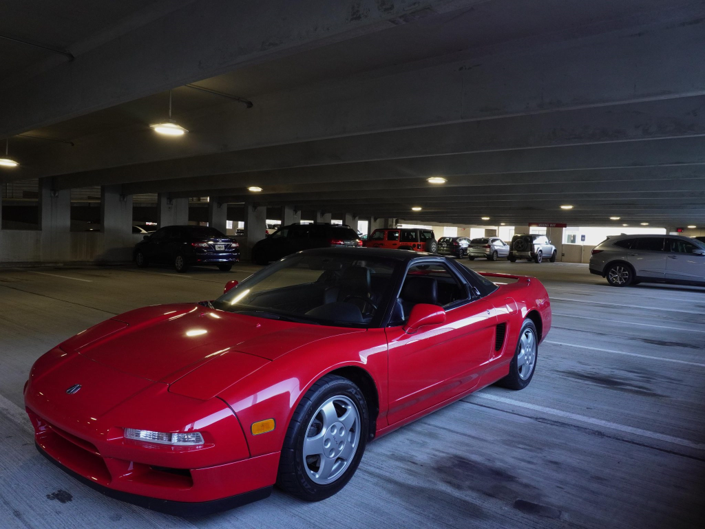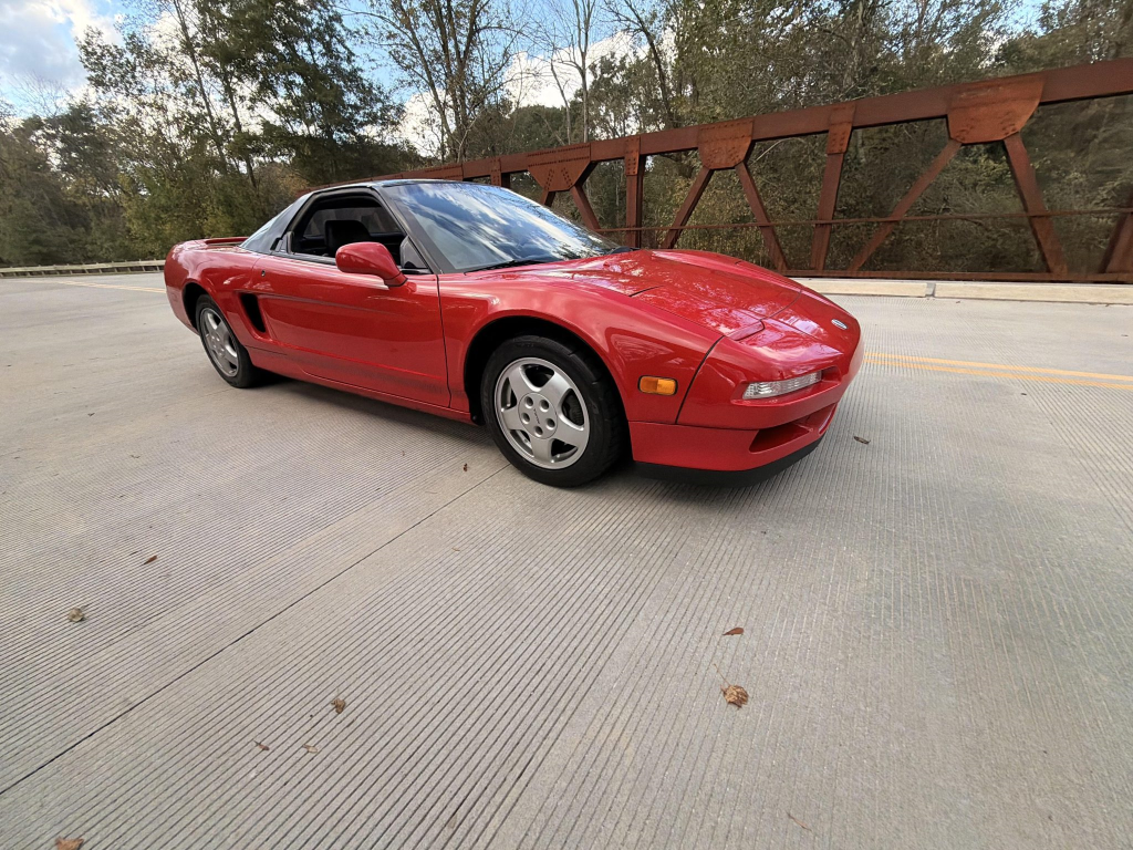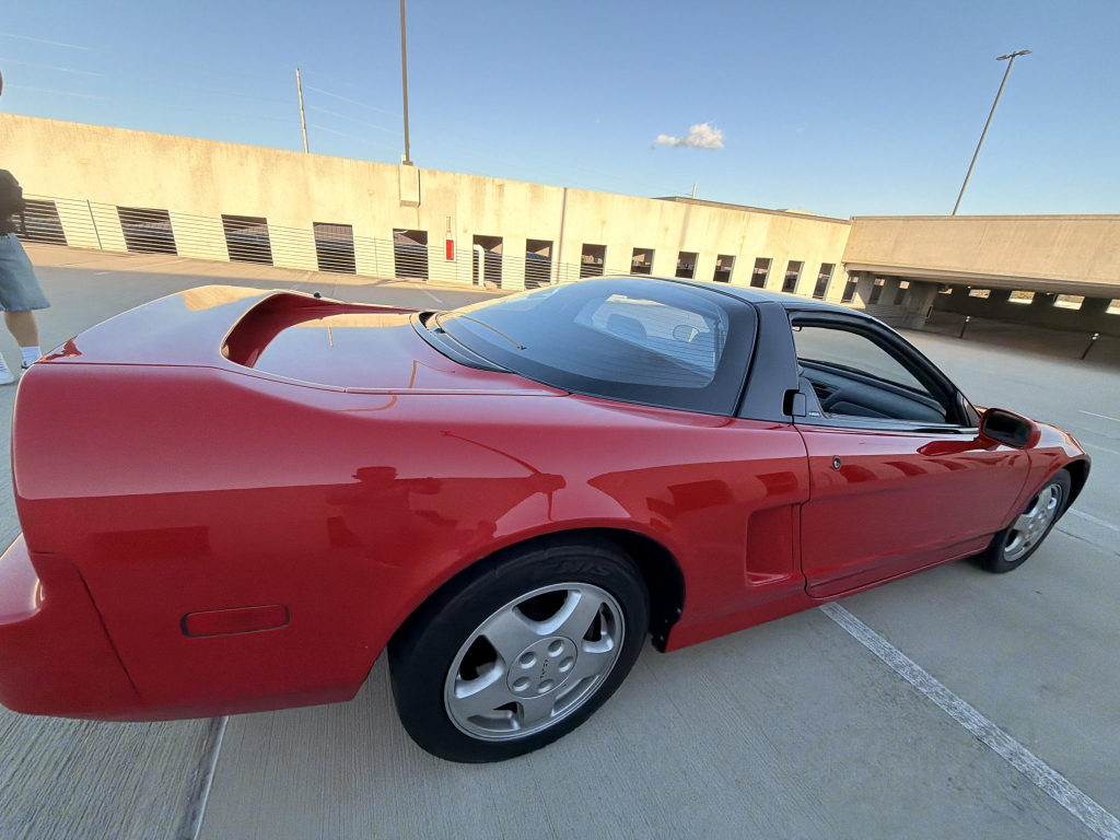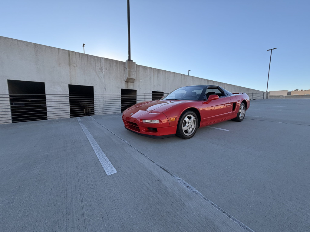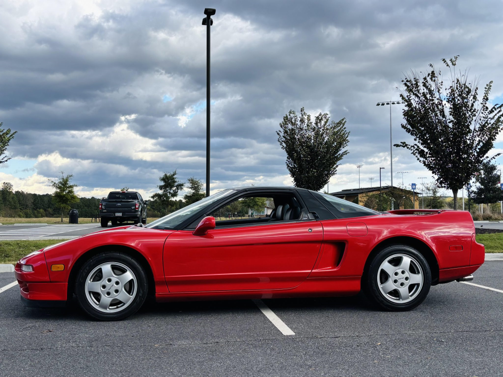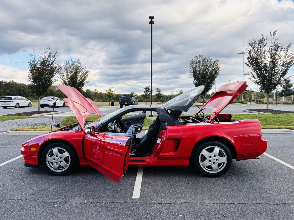 The NSX featured aluminum bodywork, and this example is finished in Formula Red with a black roof panel and pillars. Features include pop-up headlights, an integrated rear wing, side air intakes, power-adjustable side mirrors, and dual exhaust outlets. Chips are visible on the front end.
