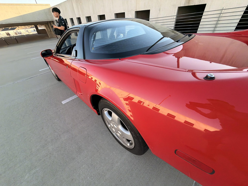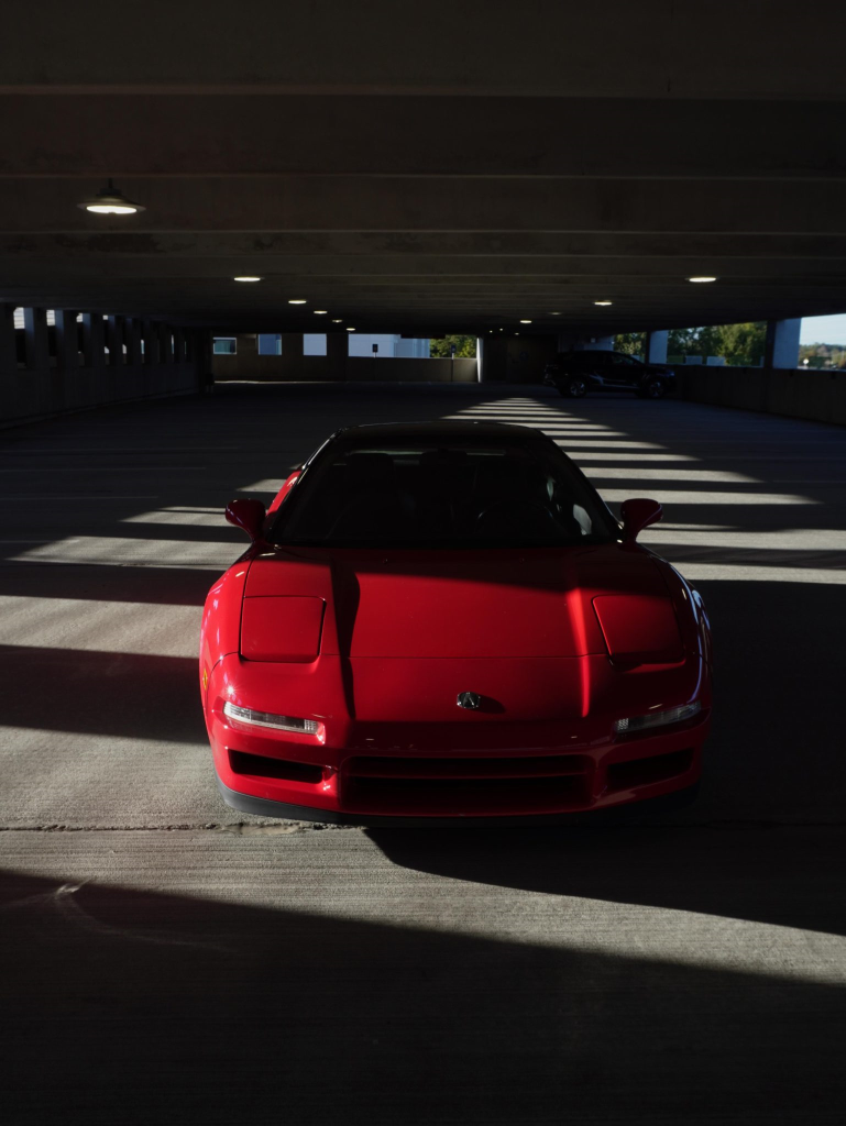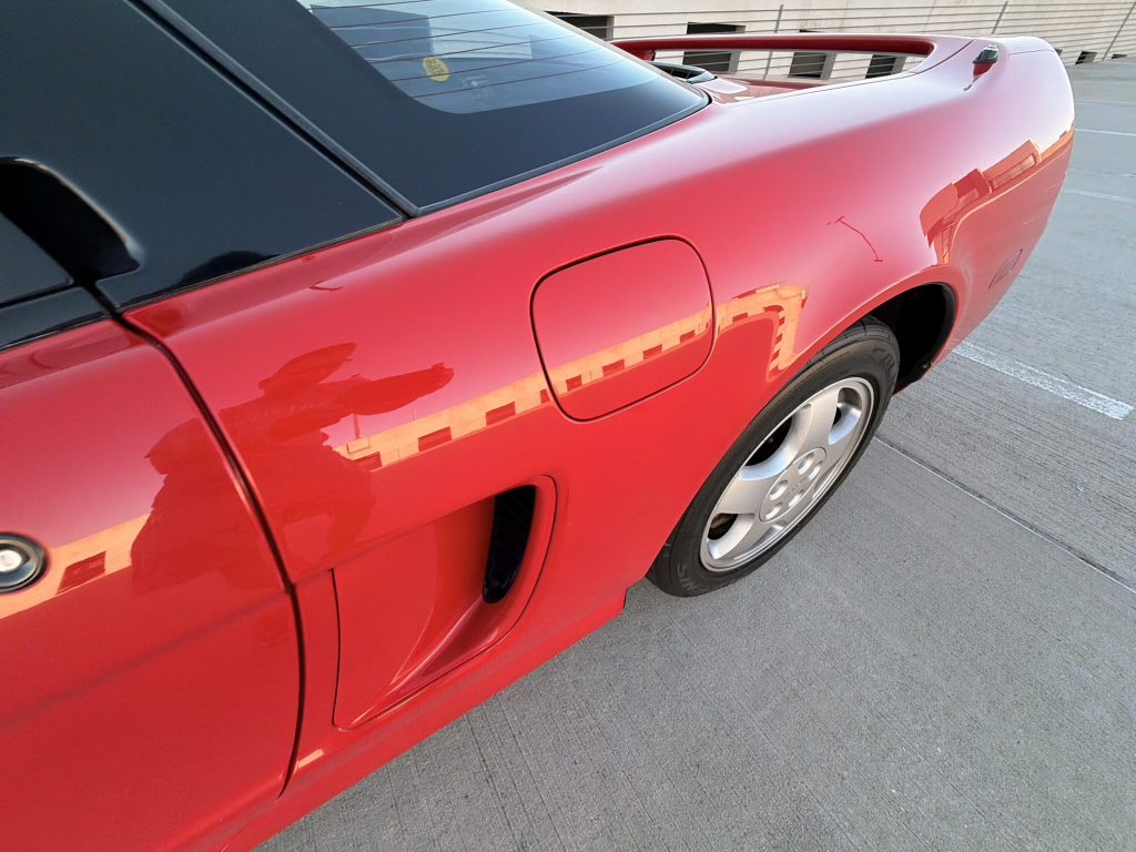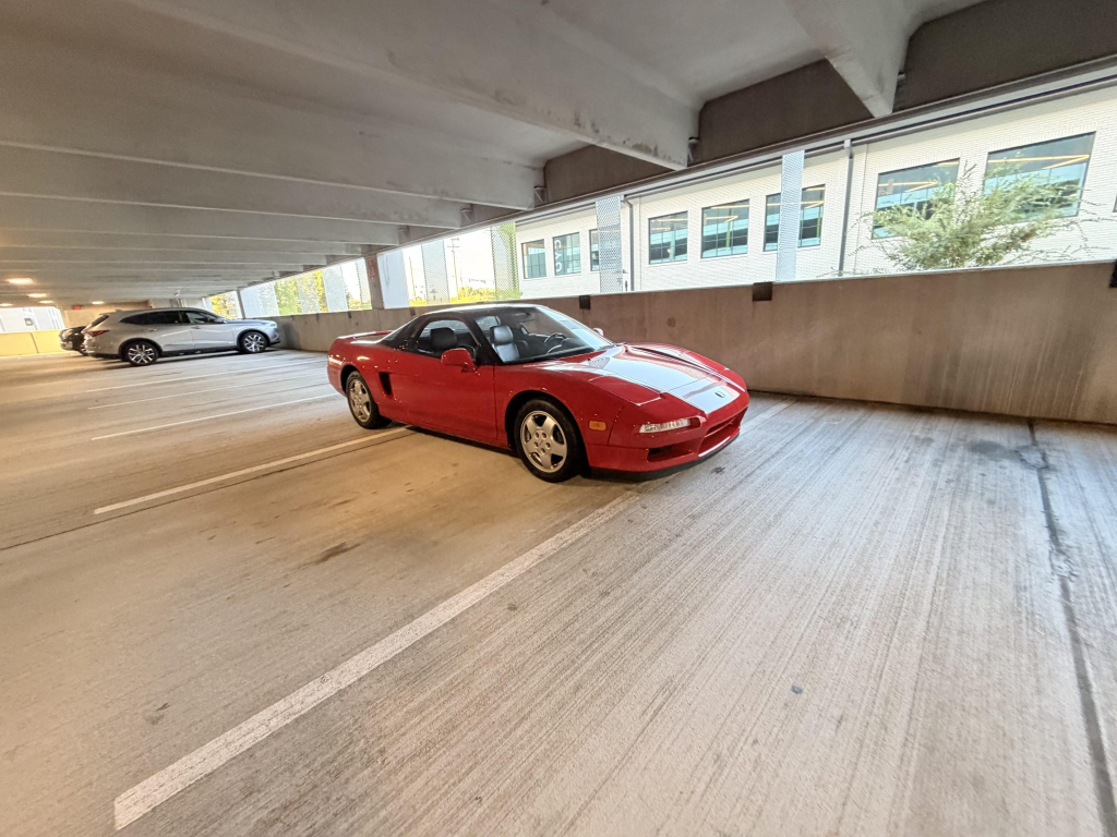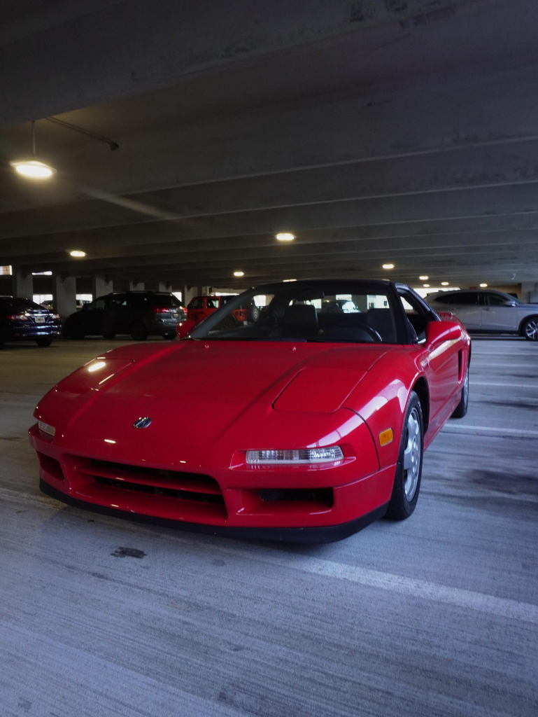 The NSX featured aluminum bodywork, and this example is finished in Formula Red with a black roof panel and pillars. Features include pop-up headlights, an integrated rear wing, side air intakes, power-adjustable side mirrors, and dual exhaust outlets. Chips are visible on the front end.