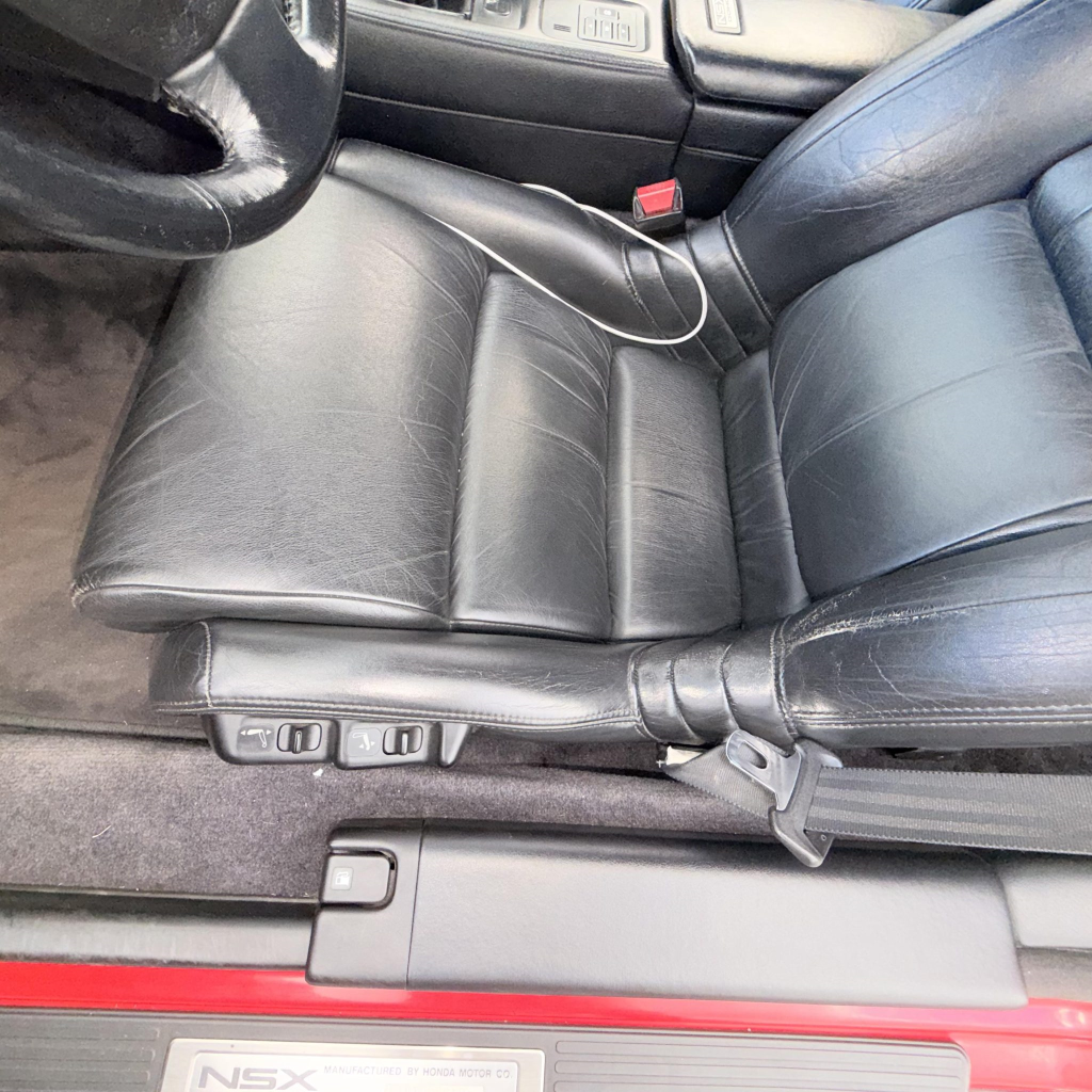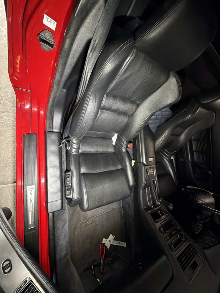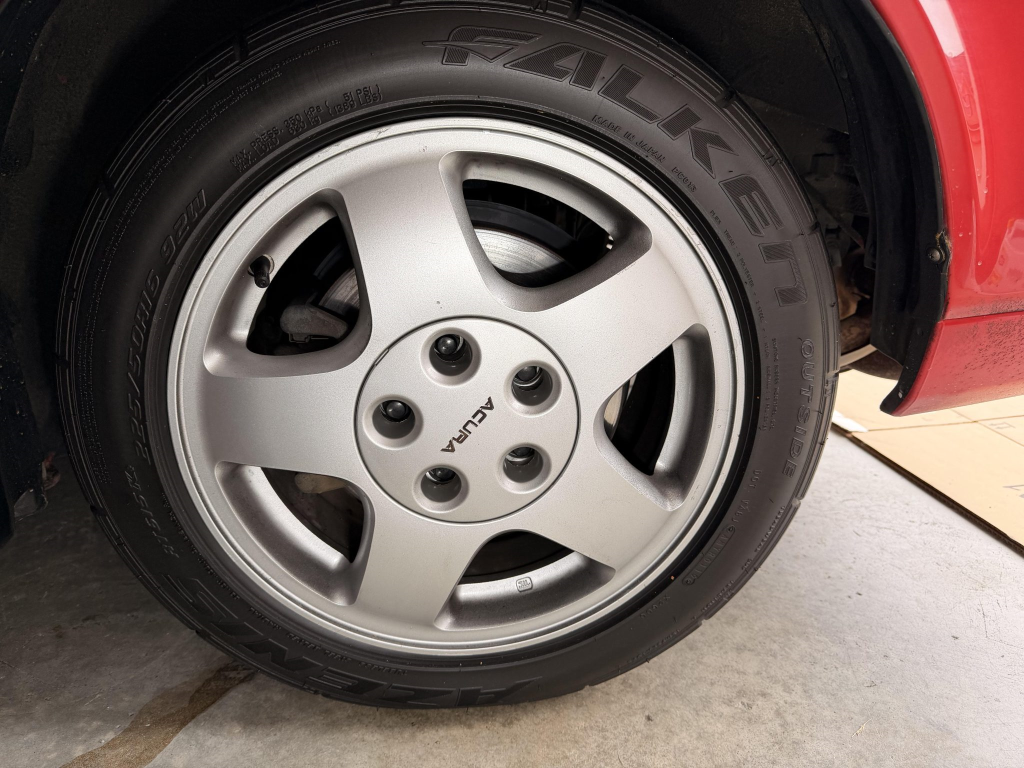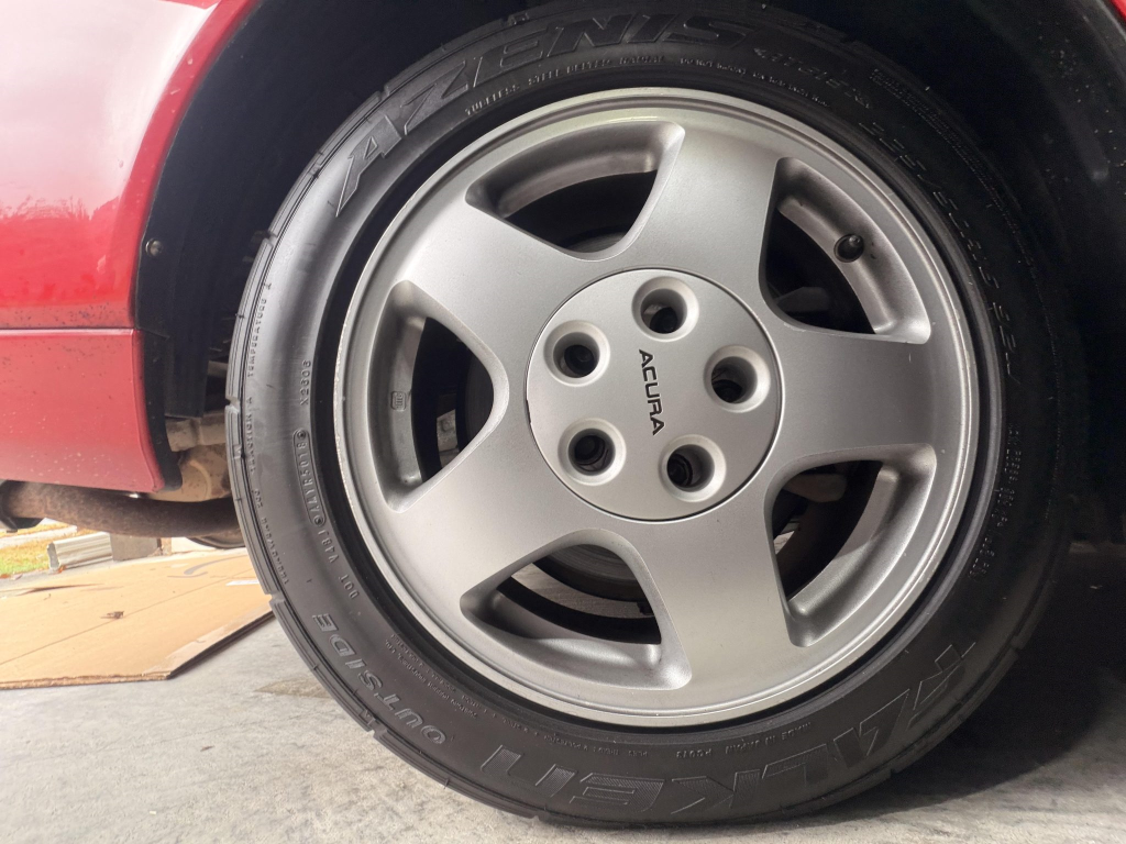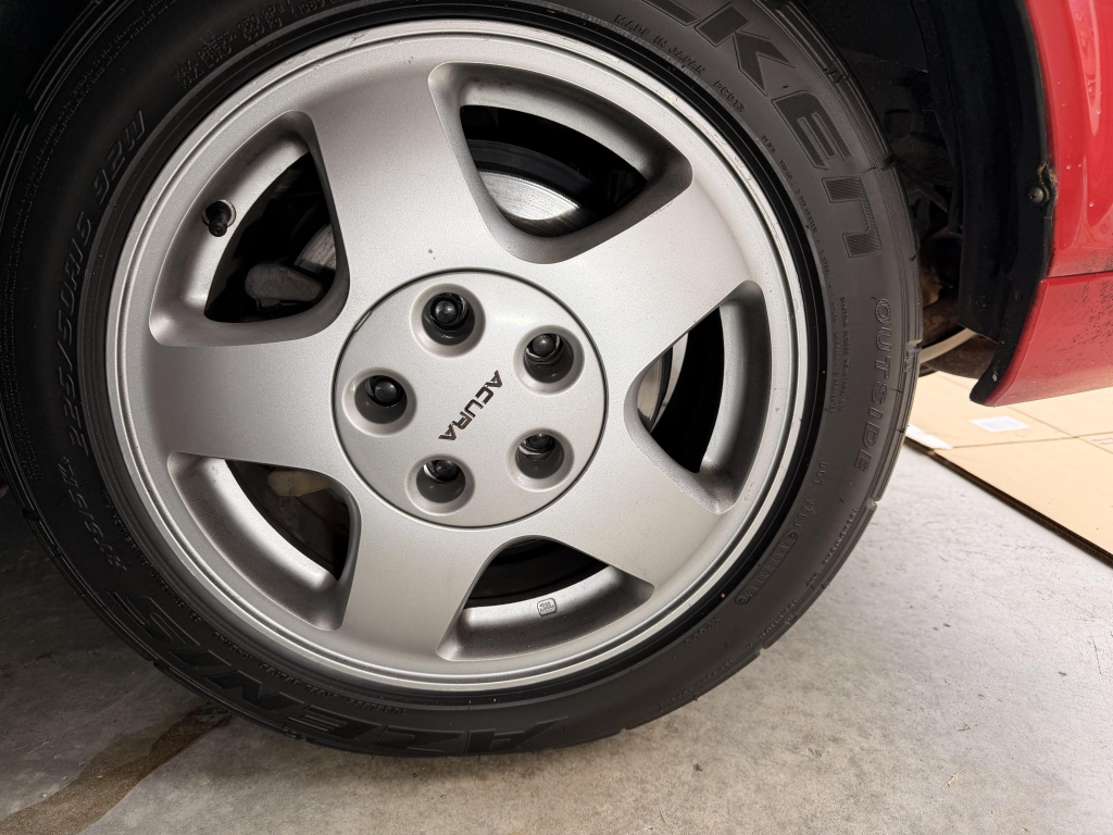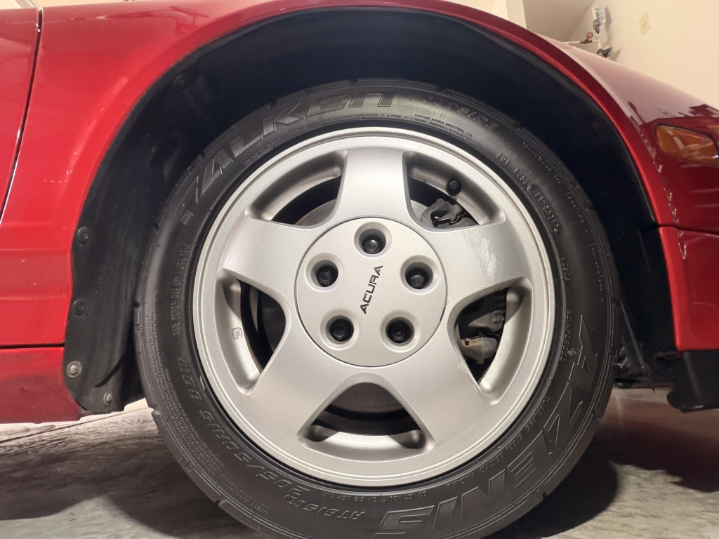 Staggered-diameter 15″ and 16″ five-spoke forged wheels are mounted with Falken tires. The car features a four-wheel double-wishbone suspension with front and rear stabilizer bars, and braking is handled by NSX-branded calipers over vented rotors at each corner. A replacement brake primary cylinder was installed in 2024, according to the seller.