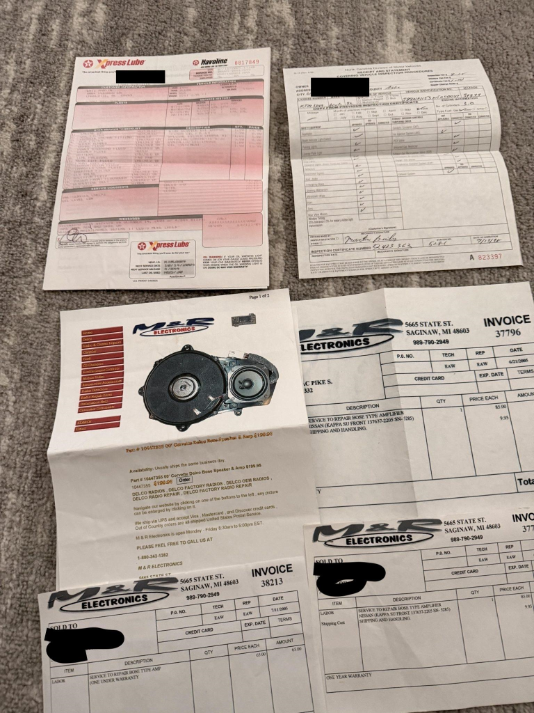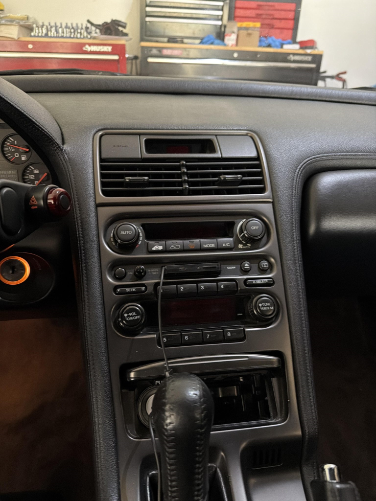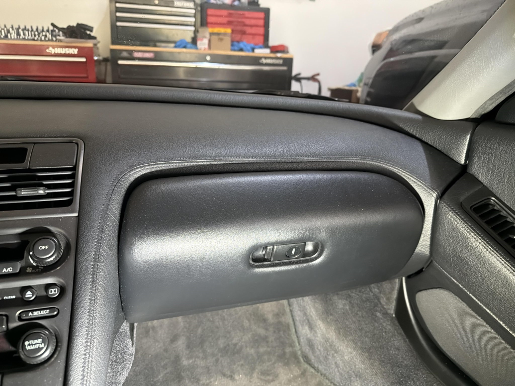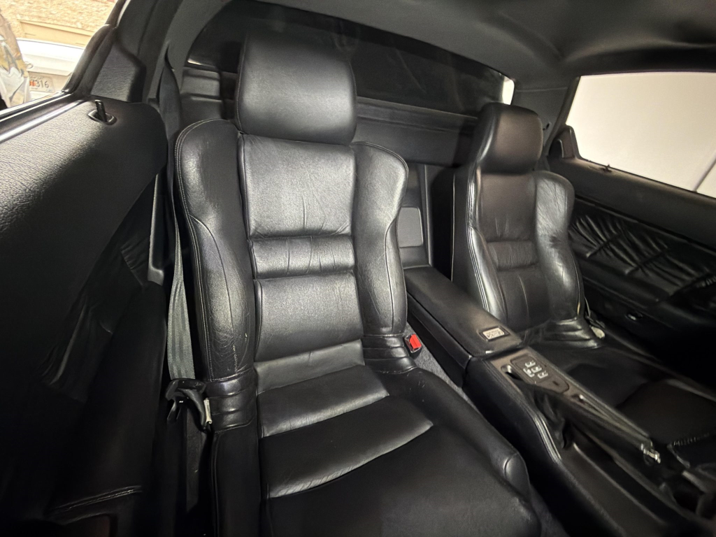 The cabin features power-adjustable sport seats upholstered in black leather, and interior amenities include automatic climate control, cruise control, a Bose sound system, and a cassette stereo. The stainless-steel door sill plates are stamped with the car’s serial number. The driver’s seat is worn.