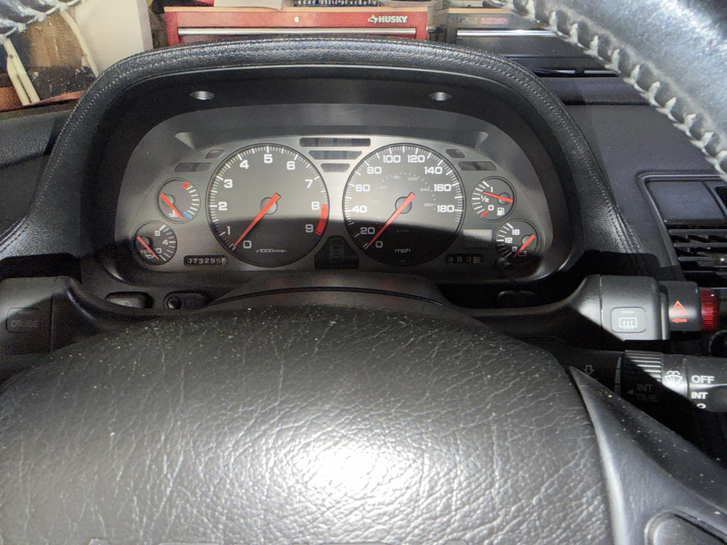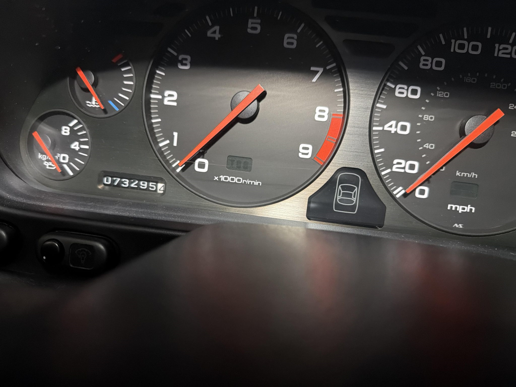 The leather-wrapped steering wheel frames a tachometer with an 8k-rpm redline, a 188-mph speedometer, and gauges for coolant temperature, oil pressure, voltage, and fuel level. The six-digit odometer shows 73k miles, approximately 5k of which were added under current ownership.