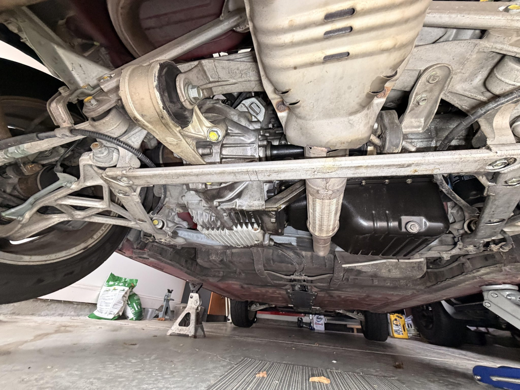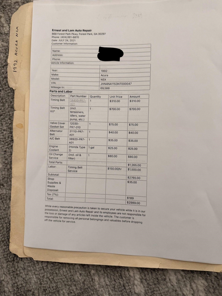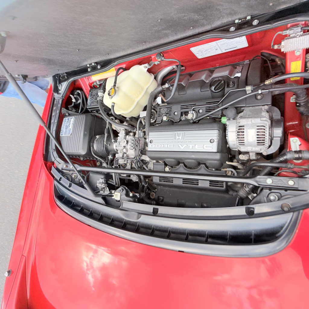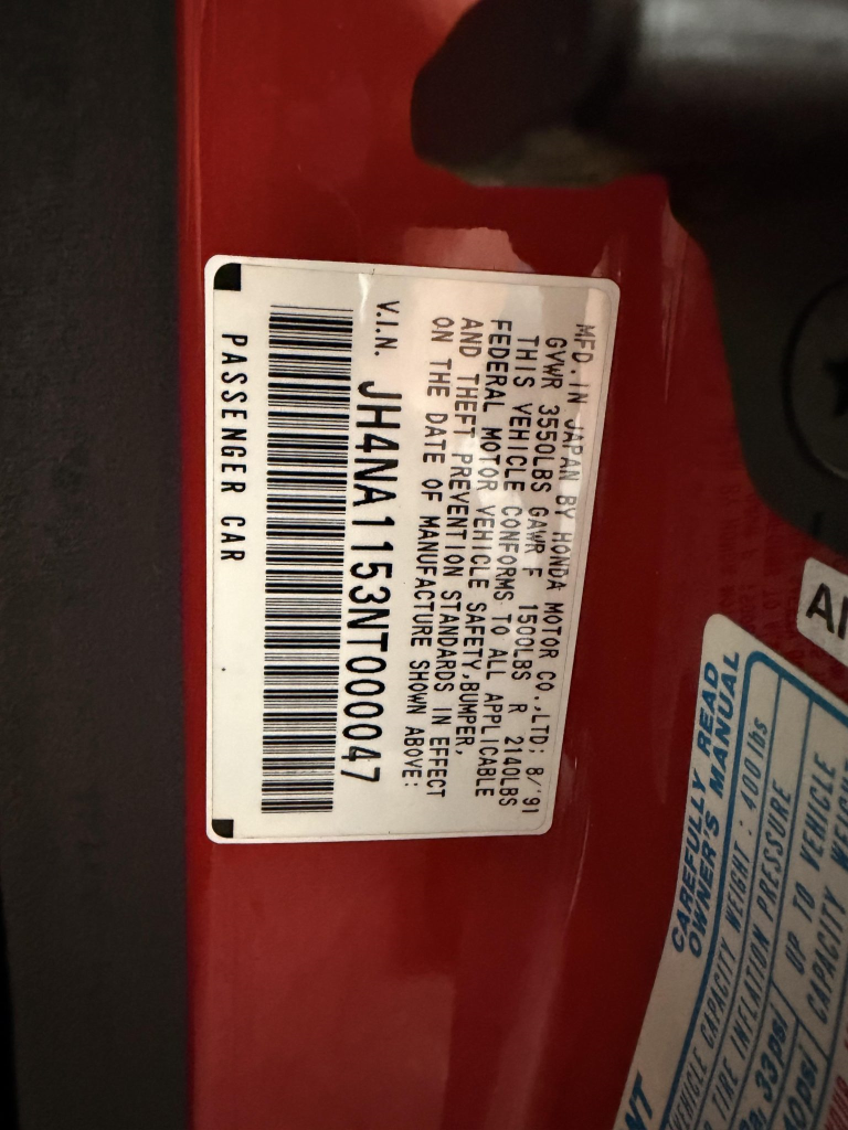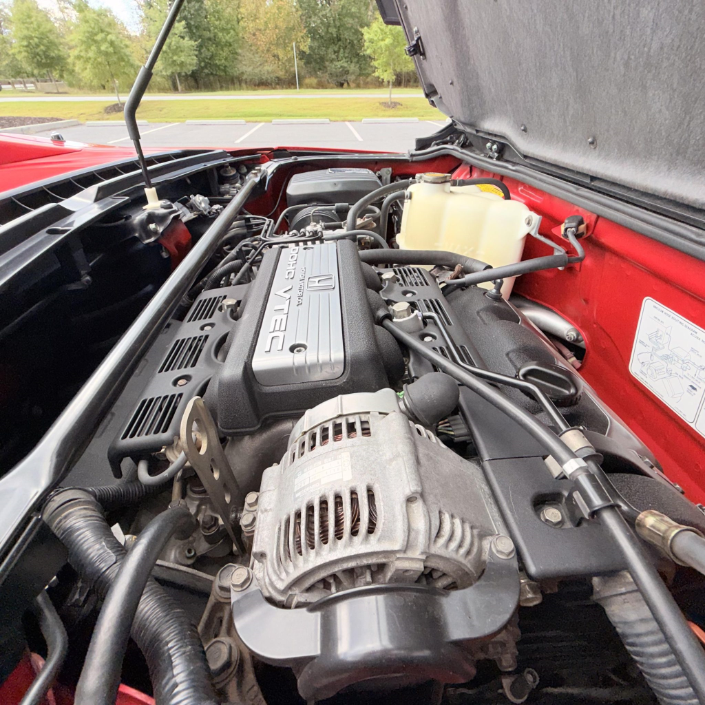 The mid-mounted 3.0-liter V6 features VTEC variable valve timing and was factory rated at 270 horsepower and 210 lb-ft of torque. Power is routed to the rear wheels via a five-speed manual transaxle and a limited-slip differential. A photo showing transaxle serial number J4A4-1004417 is provided in the gallery, indicating that the unit falls inside the snap ring failure range. The seller states that a timing belt service was carried out in 2020, at which time the water pump was also replaced.