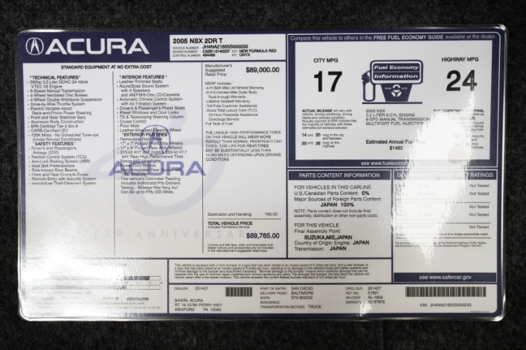 2005 Acura NSX-T in New Formula Red with Onyx interior and only 26,903 miles. This NSX comes equipped with: 3.2 Liter V6, 6 speed manual transmission, bronze brake calipers, removable targa top, Bose audio, the original books and keys, the original window sticker and much more. This an exceptional example of a final year NSX, one of only 248 built that year.