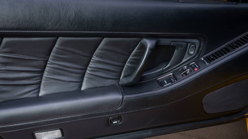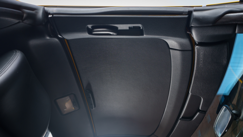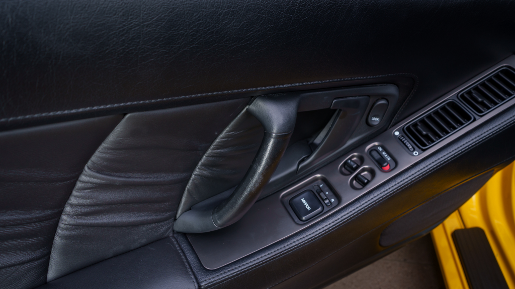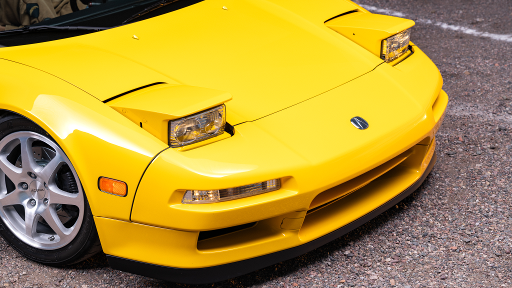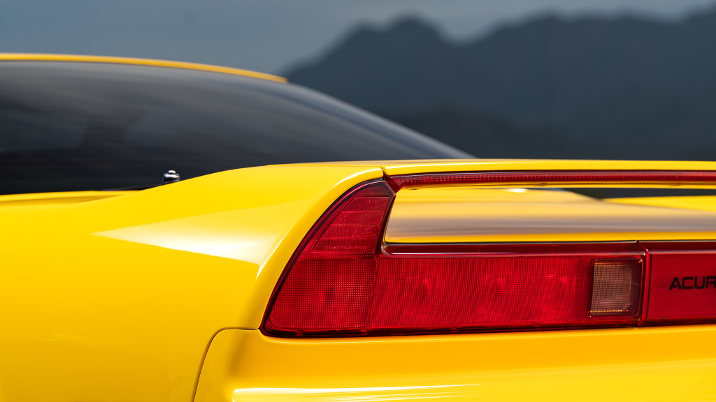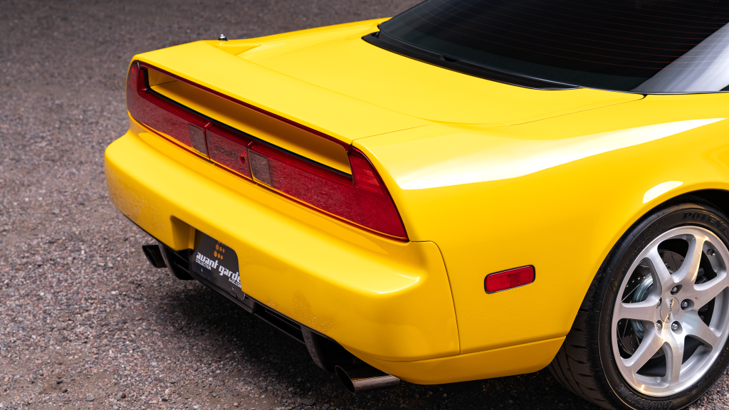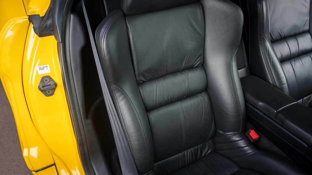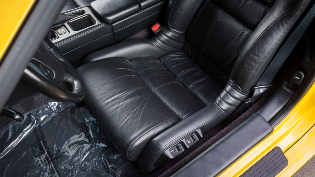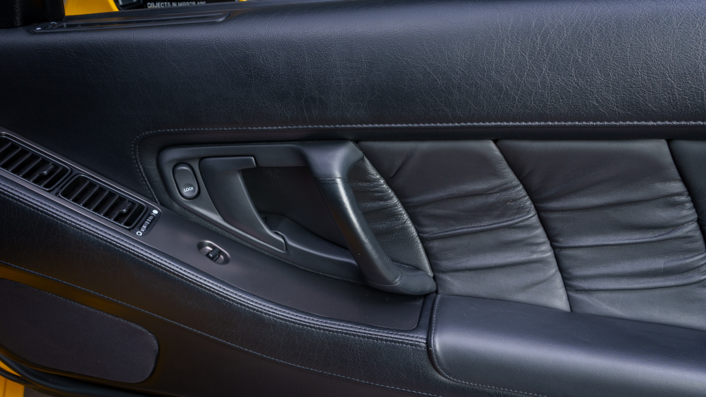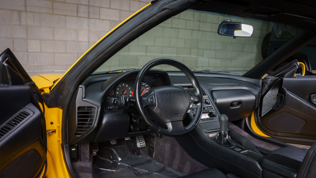 The NSX featured aluminum bodywork, and this example is finished in Spa Yellow Pearl with a body-color removable roof panel. Features include pop-up headlights, an integrated rear wing, side air intakes, power-adjustable side mirrors, and dual exhaust outlets. A ceramic coating has been applied to the body, the trunk struts were replaced in October 2024, and a replacement front spoiler was fitted in July 2025. Paint meter readings are provided in the gallery.